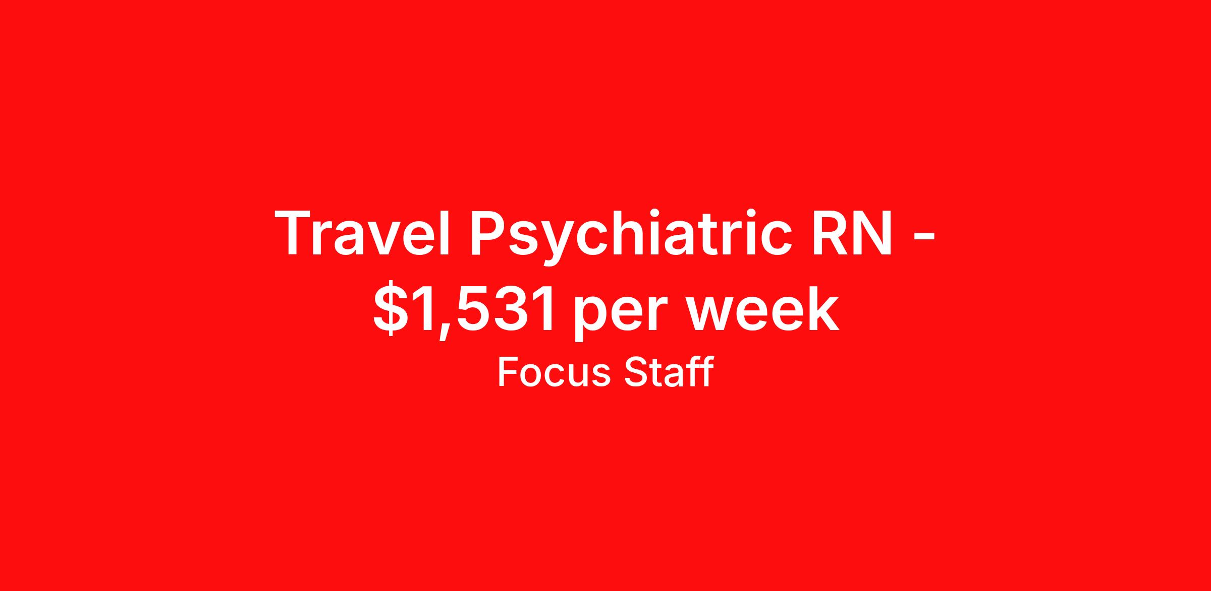 Focus Staff is seeking a travel nurse RN Psychiatric for a travel nursing job in Santa Fe, New Mexico. Job Description & Requirements Specialty: Psychiatric Discipline: RN Start Date: 03/23/2026 Duration: 13 weeks 36 hours per week Shift: 12 hours, nights Employment Type: Travel Focus Staff is seeking a Psychiatric Registered Nurse for a travel contract in Santa Fe, NM. The ideal candidate will have at least 1 year of experience in a Psych setting. Contract Length: 13 Start Date: 03/23/2026 Shift: 3x12 Nights Benefits for Psychiatric RNs: Health insurance Vision insurance Dental Insurance Life insurance Licensure reimbursement Travel reimbursement Relocation assistance 401(k) 401(k) matching Competitive Pay Referral Bonus Requirements: 1 Year of Experience, 2 Preferred Valid NM RN License BLS (Basic Life Support) Eligible to work in the United States About Focus Staff: Focus Staff is a traveler-first nurse and healthcare staffing agency! We prioritize the needs of our travelers, giving you complete control over your journey. Our mission is to help you create the life you love, explore the country and do what you do best, help others. Interested in becoming a traveler with Focus Staff? Discover why travelers choose us, apply today! All-Star Status: Dallas 100 (Multiple Years in a Row) Inc. 5000 Certified by The Joint Commission Best of Staffing Talent Satisfaction 2022 Best of Staffing Client Satisfaction 2022 Fastest-Growing US Staffing Firms 2017 If you’re seeking a Psych Registered Nurse position in Santa Fe, NM and are looking to work with an agency that will listen to your needs and career goals, then Focus Staff is the right place to be. We are proud of our ability to build relationships with all our healthcare professionals, whether you’re seeking travel assignments, PR or permeant positions. We Offer: Immediate Openings Weekly Pay through Direct Deposits Flexible Schedules Day and Night Shifts Available Competitive Compensation Guaranteed Hours (based on employer) Travel Assistance Dedicated/Responsive Recruiters Day One Medical, Dental, Vision and Life Insurance Generous Housing Stipend 24/7 Support Company Provided Housing Options Referral Bonus ($600) Loyalty Bonus ($1,200) Discounts/Coupons to Hotels Access to Jobs in all 50 States Painless Credentialing Process U.S.A.-based Company Equal Opportunity Employer Joint Commission Certified Licensure Reimbursement Pet-Friendly Access to Discounts, Rewards, and more Other Information: Job City: Santa Fe Shift: 3x12 Nights Job ID: a0xVt00000Iu55tIAB Focus Staff is an EEO/AA (Equal Employment Opportunity and Affirmative Action) Employer. Estimated pay package based on bill rate at time job was posted. Bill rates can change frequently and without notice. Exact pay package may vary based on several factors, including, but not limited to, guaranteed hours, travel distance, demand, experience, etc. Psychiatric Nurse Practitioner, pmhnp, Registered Nurse, RN, Nurse Practitioner, Psychiatric Nurse, Psych RN, Nurse, Psychiatric Mental Health Nurse Practitioner, Psychiatric RN, Traveling Psych RN, Travel Psychiatric Nurse Practitioner, RN – Psych, Travel, Temporary, 13 Weeks, Temp, Travel Nursing, Full-time, Contract, Assignment, New Grad RN, Nursing, Temporary RN Focus Staff Job ID a0xVt00000Iu55tIAB. Pay package is based on 12 hour shifts and 36 hours per week (subject to confirmation) with tax-free stipend amount to be determined. Posted job title: Travel PSYCH RN - Psychiatric Registered Nurse About Focus Staff Your Journey, Our Focus. Travel Confidently, Care Boldly with Focus Staff. At Focus Staff, we’re here to make your travel healthcare career rewarding, seamless, and stress-free. Whether you’re a travel nurse, therapist, or allied health professional, we take care of the details so you can focus on what you do best — caring for others. Our mission is simple: to help healthcare heroes like you thrive, no matter where your journey takes you. With thousands of job opportunities across all 50 states, our dedicated recruiters work closely with you to match you to the right assignment, based on what matters most to you — pay, location, benefits, or career growth. From day one, you’ll enjoy premium benefits like medical coverage that bridges between assignments, 401K matching, travel and licensing reimbursements, and personalized housing support. Plus, our team is here for you 24/7, with clinical support available whenever you need guidance or backup. At Focus Staff, we believe in making every assignment a smooth, comfortable, and empowering experience. Let’s make your next adventure your best one yet.