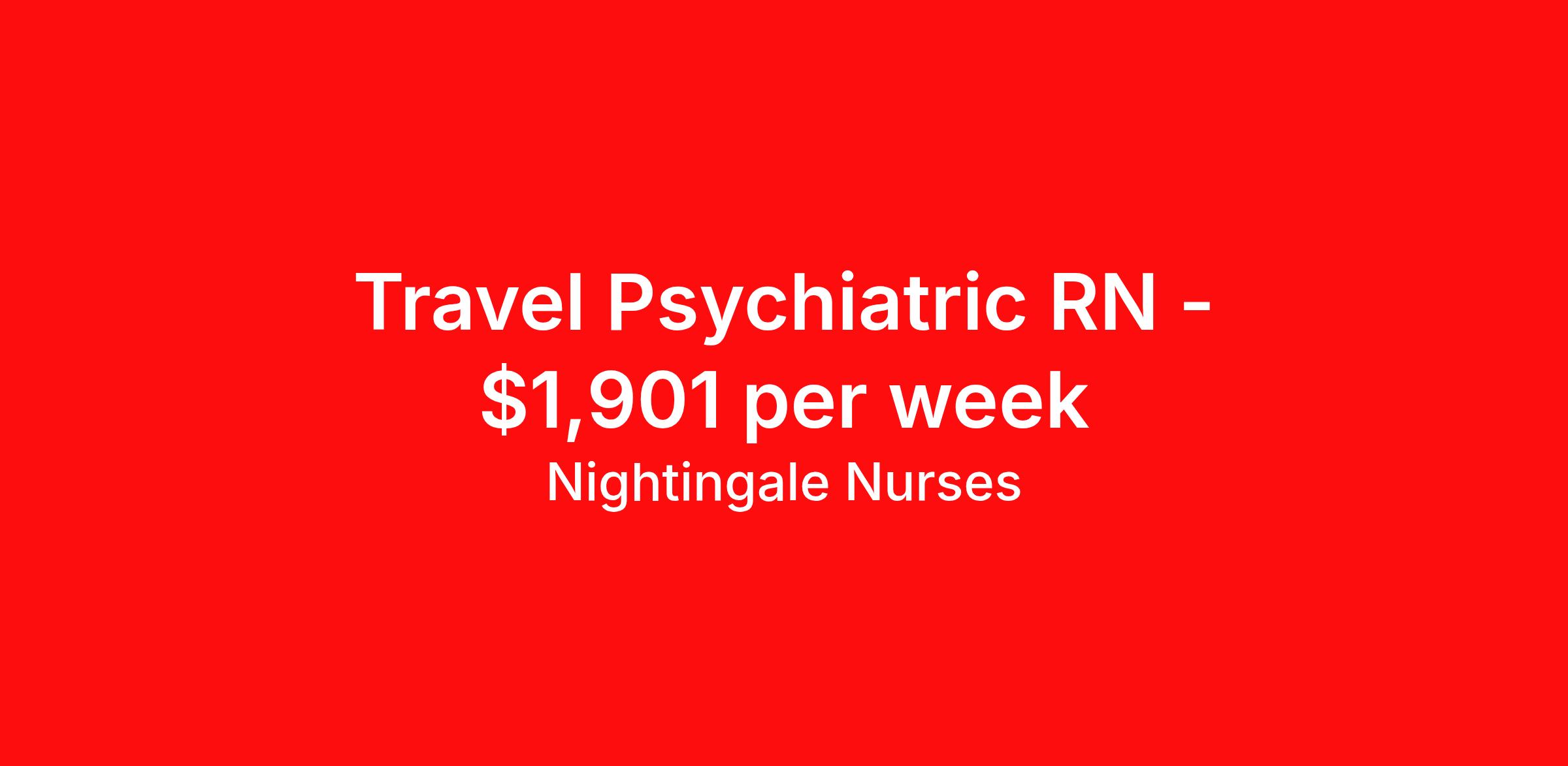 Nightingale Nurses is seeking a travel nurse RN Psychiatric for a travel nursing job in Linville, North Carolina. Job Description & Requirements Specialty: Psychiatric Discipline: RN Start Date: 04/13/2026 Duration: 13 weeks 36 hours per week Shift: 12 hours, days Employment Type: Travel About Nightingale Nurses the first name in travel nursing You may not realize it, but as an RN with real world hospital experience, you are legendary. To the lives you’ve helped save, the patients you’ve cared for, and to the hospitals where you’ve done it. And you’re just getting started. Legendary is where Nightingale begins. We’re the first name in travel nursing, representing only the very best RNs. That’s why hospitals prefer us, allowing us to offer exceptional travel nursing assignments all over the US, as well as the highest pay rates and most extensive benefits in the industry. Nightingale facilitates every aspect of your travel nursing assignment, so you can focus on doing what you do best. We want you to grow, explore, and enjoy unrivaled liberty, the freedom to nurse.