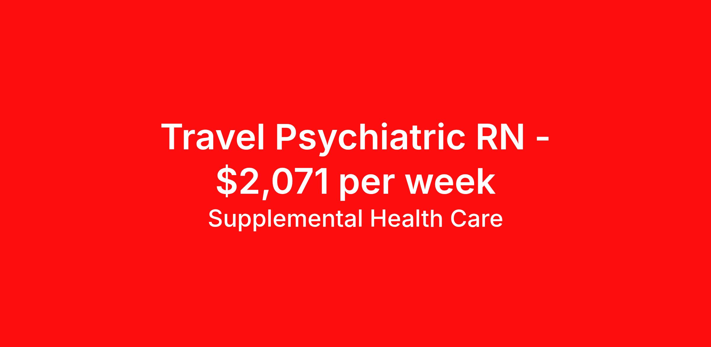 Supplemental Health Care is seeking a travel nurse RN Psychiatric for a travel nursing job in Concord, New Hampshire. Job Description & Requirements Specialty: Psychiatric Discipline: RN Start Date: ASAP Duration: 13 weeks 36 hours per week Shift: 12 hours, days, nights Employment Type: Travel Job Description: Supplemental Health Care is hiring Psychiatric Registered Nurses for contract assignments at partnering hospitals in Concord, New Hampshire. Whether you’re looking to travel or stay local, we’re committed to helping Psych RNs find the right fit with top hospitals across the country. With more than 40 years of experience in healthcare staffing, Supplemental Health Care offers reliable support, competitive pay, and great benefits every step of the way. Qualifications: New Hampshire RN License American Health Association BLS 1-2 years of recent Psychiatric nursing experience Non-violent intervention course (CPI) Psych RN Contract Details: $1,872 - $2,071 per week* AM shift available 13-week contract with possibility to extend Provide care for patients with mental illness or addiction. Assess, diagnose, administer medication, provide wound care, and manage other treatments for patients. Identify risk factors and educate or intervene as necessary Apply today to get started with this Psych RN contract opportunity, or talk to our team about the full range of Registered Nurse opportunities available. What We Offer: Full medical, dental, vision, life, and even pet insurance! Round the clock support. No matter where you are or what time it is, Supplemental Health Care is standing by. SHC's Share the Care referral program is the most dynamic, profitable referral program in the industry. 401(k) Retirement Savings Program with a wide range of investment options. Discounted and free online access to CEU courses through Supplemental University. Please speak with a recruiter for details. Supplemental Health Care is an Equal Opportunity Employer. All candidates, including veterans and those with disabilities, are encouraged to apply. SHC will consider for employment qualified applicants with criminal histories in a manner consistent with the requirements of applicable local, state, or federal law. To learn more, visit www.shccares.com/eeo Supplemental Health Care Job ID 1472480. Pay package is based on 12 hour shifts and 36 hours per week (subject to confirmation) with tax-free stipend amount to be determined. Posted job title: Registered Nurse - Psych About Supplemental Health Care At Supplemental Health Care, a simple belief in the power of caring guides a unique commitment to world-class service in healthcare staffing. For 40 years, we’ve supported talented professionals pursuing their life calling in hospitals, schools, home health, corrections, behavioral health, and other settings. At SHC, we inspire vital connections and enrich lives and inspire better outcomes. As recipients of the Best in Staffing Awards for both Client and Talent, Supplemental Health Care is proud to be among only 2% of staffing companies singled out for the distinction based on the real feedback of our employees and the clients we serve. SHC has also earned The Joint Commission’s Gold Seal of Approval and is named among the Largest Health Care Staffing companies in the United States by Staffing Industry Analysts. We are also thrilled to recognize our very own SLP, Dr. Kelly Byrd as the American Staffing Association 2024 National Staffing Employee of the Year and Health Care Sector All-Star. We’re honored to connect Dr. Byrd to employment, share her incredible story, and support her family literacy nonprofit. For everyone that we serve, SHC is the place where caring hearts thrive. Benefits Referral bonus Benefits start day 1 401k retirement plan Continuing Education Discount program Health savings account