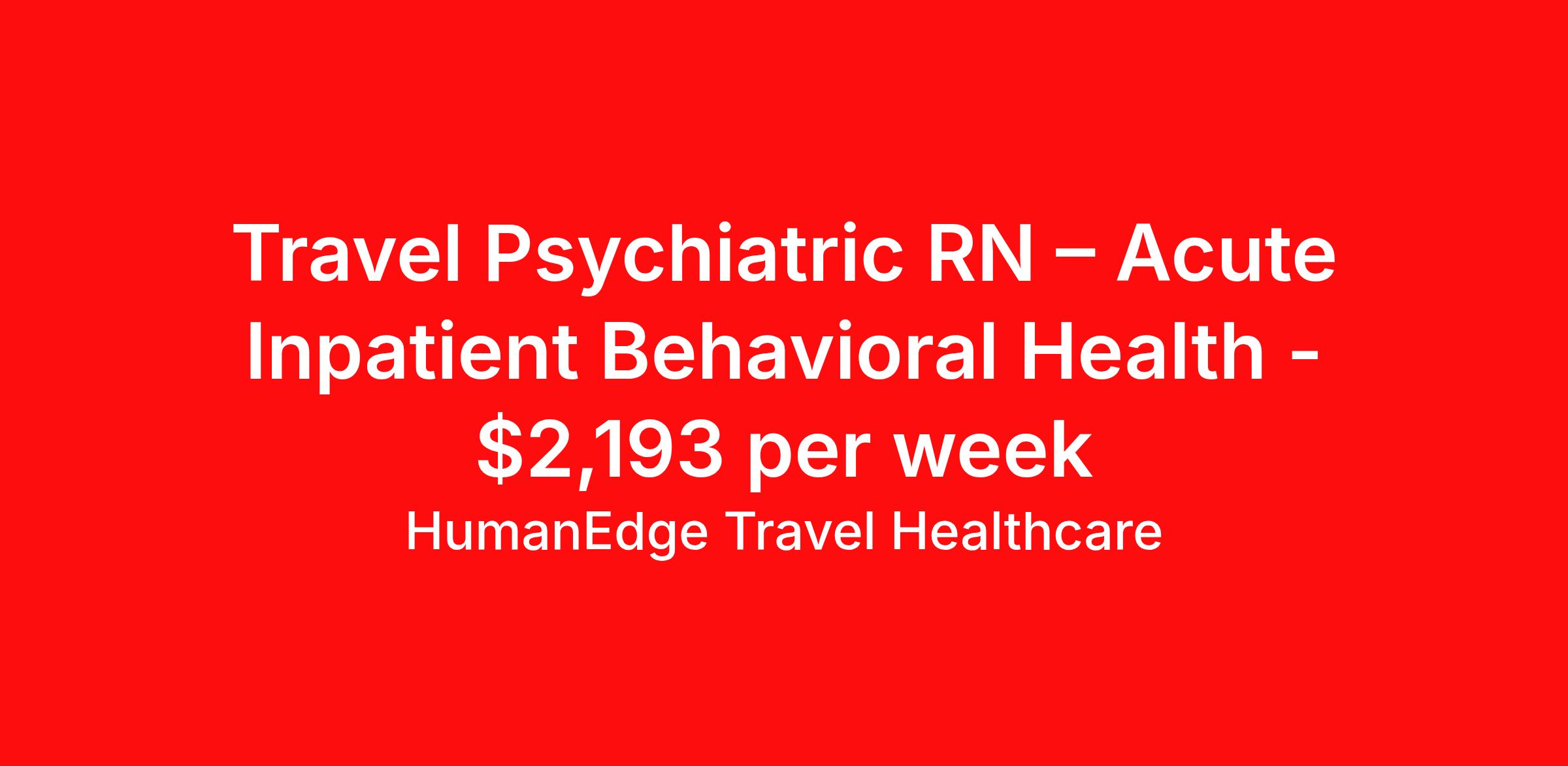 HumanEdge Travel Healthcare is seeking a travel nurse RN Psychiatric for a travel nursing job in Manchester, Connecticut. Job Description & Requirements Specialty: Psychiatric Discipline: RN Start Date: ASAP Duration: 12 weeks 40 hours per week Shift: 8 hours Employment Type: Travel Travel Registered Nurse (RN) – Acute Inpatient Behavioral Health Location: Manchester, CT Assignment Start: 03/09/2026 Duration: 12 Weeks Schedule: 40 Hours/Week Shift: Midshift Shift Hours: 3:00 PM – 11:30 PM Schedule: 5x8s On-Call: None Local Candidates: Not accepted Position Overview: Seeking an experienced Psychiatric RN for an acute inpatient behavioral health unit. This role requires strong clinical judgment, crisis intervention skills, and the ability to provide safe, therapeutic care in a structured psychiatric setting. Responsibilities: Provide direct nursing care to acute psychiatric patients Perform comprehensive assessments and monitor changes in condition Administer medications and monitor for therapeutic response and side effects Implement and support individualized treatment plans Utilize de-escalation techniques and maintain patient/staff safety Document care accurately and collaborate with interdisciplinary teams Requirements: Active CT RN License Minimum 3 years of acute inpatient behavioral health experience BLS certification required Strong crisis management and communication skills Contact: HumanEdge Health HumanEdge Travel Healthcare Job ID 16762. Pay package is based on 8 hour shifts and 40 hours per week (subject to confirmation) with tax-free stipend amount to be determined. Posted job title: Psych RN About HumanEdge Travel Healthcare HumanEdge Allied Health is a full-service nursing and allied health staffing agency that has lived and breathed staffing for more than 30 years, making us one of the most trusted in the industry!