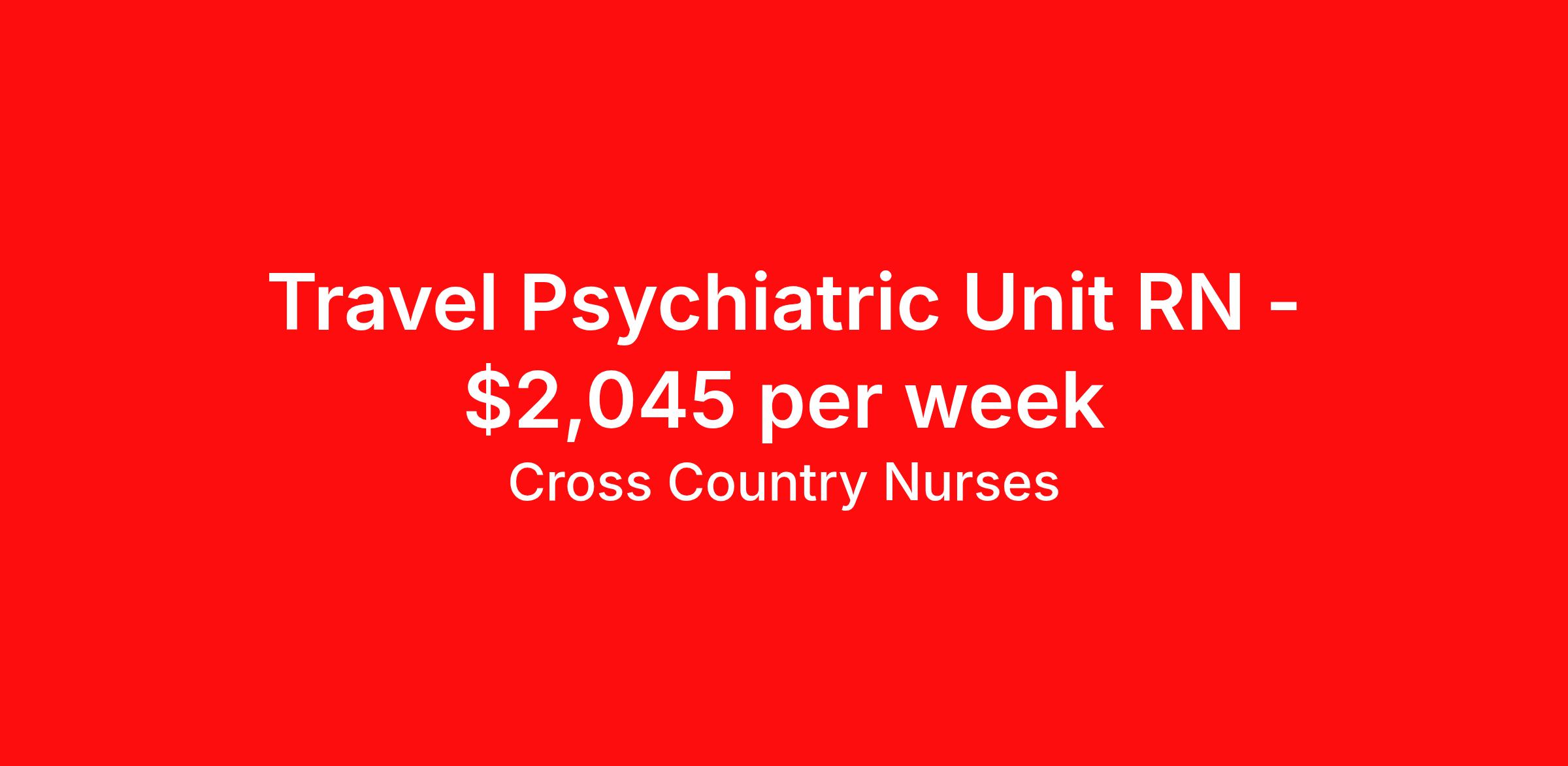Cross Country Nurses is seeking a travel nurse RN Psychiatric for a travel nursing job in Newburyport, Massachusetts. Job Description & Requirements Specialty: Psychiatric Discipline: RN Start Date: 04/20/2026 Duration: 13 weeks 32 hours per week Shift: 8 hours, days, evenings Employment Type: Travel Job Description As a psychiatric nurse (RN PSYCH), you will work to improve or support the mental and physical well-being of people with mental health or behavioral conditions. You will care for patients with mental disorders, facilitating social and emotional treatments, supervising medication schedules, and evaluating progress. Working closely with a variety of interdisciplinary professionals, as well as patients' families, you will maintain a supportive and safe environment through the use of monitoring devices and de-escalation techniques. Your care will be supplemented by support groups, social activities, and other therapeutic measures necessary for the patient's condition. Minimum Requirements At least 1 year of recent acute care experience in specialty Active RN license Benefits The benefits of taking a travel nursing job with Cross Country include: Private housing or generous housing allowance Comprehensive health insurance with prescription coverage Dependent health insurance with prescription coverage Competitive salaries Referral bonuses Travel reimbursement 401(k) retirement plan Direct deposit/free checking Unlimited free CE credits Cross Country Job ID 1237149. Pay package is based on 8 hour shifts and 32 hours per week (subject to confirmation) with tax-free stipend amount to be determined. Posted job title: Registered Nurse / Psychiatric Unit About Cross Country Nurses You care for others — we’re here to care for you. At Cross Country, we know travel nursing is about more than just the job. It’s about building a career that supports your lifestyle, your values, and your impact. We offer competitive pay, full benefits, and 24/7 support from a team that truly understands what it means to be on the front lines. Wherever your journey takes you, we’re with you every step of the way. Let’s build your best life — one assignment at a time. Benefits 401k retirement plan Referral bonus