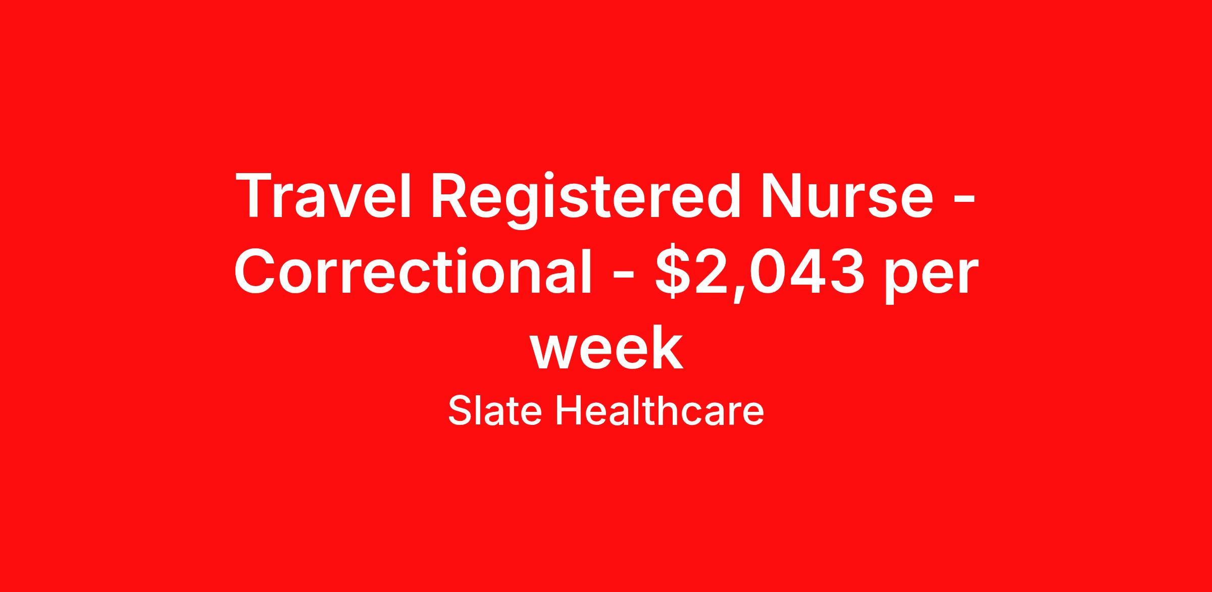 Slate Healthcare is seeking a travel nurse Correctional for a travel nursing job in Hartsville, Tennessee. Job Description & Requirements Specialty: Correctional Discipline: RN Start Date: 03/23/2026 Duration: 12 weeks 36 hours per week Shift: 12 hours, days Employment Type: Travel Profession:RN, JobSpecialty:Registered Nurse, Shift:3x12 Days, Duration:12 weeks Slate Healthcare Job ID 203976a0-3a2b-41f9-b291-3a12c1f76c42. Pay package is based on 12 hour shifts and 36 hours per week (subject to confirmation) with tax-free stipend amount to be determined. About Slate Healthcare Slate Healthcare is a premier travel healthcare staffing agency, connecting healthcare professionals with thousands of opportunities at top-tier hospitals and facilities across the country. We’re committed to supporting nurses and allied health professionals in building stable, fulfilling careers—while embracing the freedom and excitement that comes with travel. Our goal is simple: to offer flexibility, competitive pay, and personalized placements that align with each clinician’s lifestyle and career goals. At Slate, we empower our professionals to choose when and where they work, while ensuring they receive the highest compensation possible—because we believe that exceptional care starts with empowered caregivers.