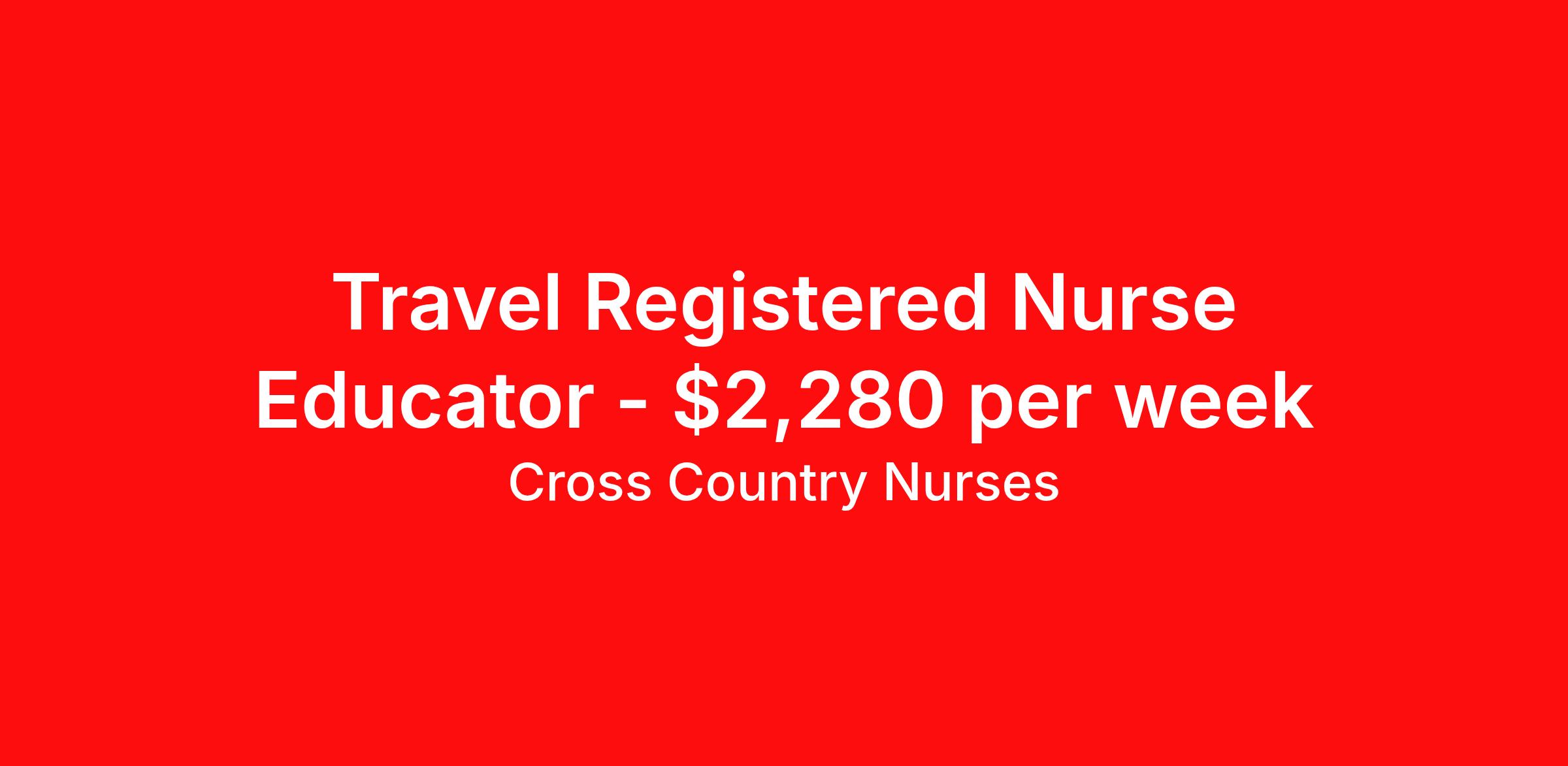 Cross Country Nurses is seeking a travel nurse RN Educator for a travel nursing job in Washington, District of Columbia. Job Description & Requirements Specialty: Educator Discipline: RN Start Date: ASAP Duration: 13 weeks 36 hours per week Shift: 12 hours, nights Employment Type: Travel Job Description As a registered nurse - nurse educator (RN), you'll teach and train other nurses. Working at a college, university, hospital or other teaching facility or clinical setting, you'll prepare nursing students or existing nurses for the field. Your responsibilities will require you to show leadership, confidence, extensive knowledge, organization and patience. You'll serve as a role model and advisor for your students as you design and implement curriculum and prepare them for real-world applications of nursing. Minimum Requirements At least 1 year of recent acute care experience in specialty Active RN license Benefits The benefits of taking a travel nursing job with Cross Country include: Private housing or generous housing allowance Comprehensive health insurance with prescription coverage Dependent health insurance with prescription coverage Competitive salaries Referral bonuses Travel reimbursement 401(k) retirement plan Direct deposit/free checking Unlimited free CE credits Cross Country Job ID 1234848. Pay package is based on 12 hour shifts and 36 hours per week (subject to confirmation) with tax-free stipend amount to be determined. Posted job title: Registered Nurse / Nurse Educator About Cross Country Nurses You care for others — we’re here to care for you. At Cross Country, we know travel nursing is about more than just the job. It’s about building a career that supports your lifestyle, your values, and your impact. We offer competitive pay, full benefits, and 24/7 support from a team that truly understands what it means to be on the front lines. Wherever your journey takes you, we’re with you every step of the way. Let’s build your best life — one assignment at a time. Benefits 401k retirement plan Referral bonus