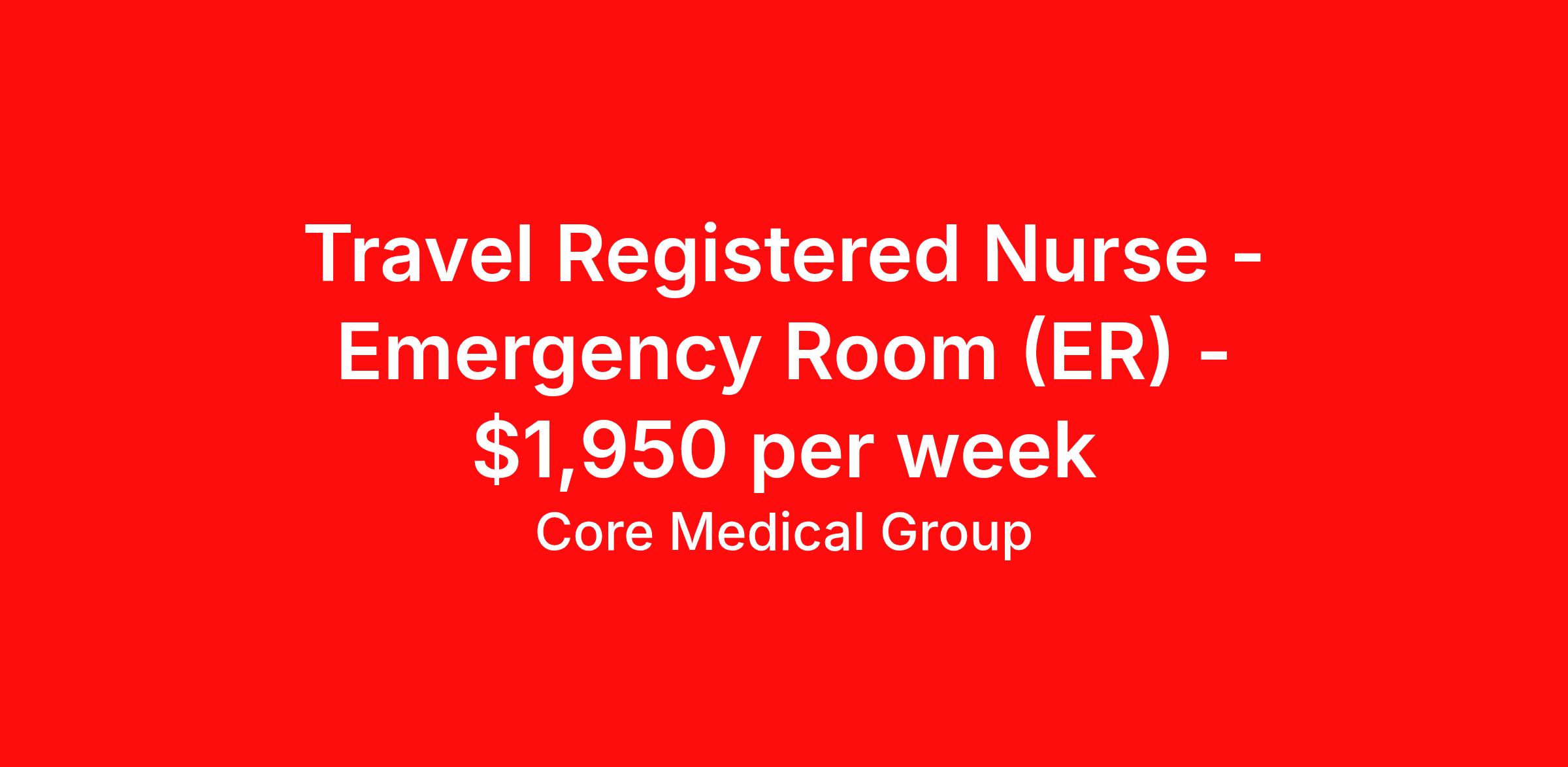 Core Medical Group is seeking a travel nurse RN ED - Emergency Department for a travel nursing job in Coos Bay, Oregon. Job Description & Requirements Specialty: ED - Emergency Department Discipline: RN Start Date: 04/07/2026 Duration: 13 weeks 36 hours per week Shift: 12 hours Employment Type: Travel Client in OR seeking Registered Nurse: Emergency Room for the following shift(s): Rotating We are looking for a healthcare professional who is ready to provide exceptional patient care in this contract/travel role. Contract/travel assignments are typically 13 weeks, with potential to extend. Help us continue our mission to connect people, improve lives, and give back to the community by joining the CoreMedical Group team. When you work with CoreMedical Group, we put you first and treat you like family, supporting you every step of the way. CoreMedical Group is one of the largest healthcare staffing agencies in the country, with travel and contract positions located across the United States. Our recruiters will help you find the perfect job, whether it's across the country or across the street. In addition to dedicated, personalized support from your recruiter, when you work with CoreMedical Group you'll receive: Access to an extensive benefits package, including day 1 health, dental, and vision insurance, employer paid life insurance, a health reimbursement account, and more! Weekly paychecks with competitive pay packages Matching 401(k) benefits to help you save for retirement Licensure assistance and reimbursement to set you up for success on your contract Travel reimbursement and dedicated housing support while on assignment Referral cash bonuses when you connect us with other clinicians CoreMedical Group also offers you a free, all-inclusive vacation each year as our way of saying "thank you" for your hard work. Join other healthcare professionals on the annual Club CoreMed retreat and you'll see why our contract and travel professionals come back to us year after year! Your career is too valuable to tackle on your own. Let CoreMedical Group help you with your healthcare journey! *Estimate of weekly payments is intended for informational purposes and includes hourly wages, as well as reimbursements for meal & incidental expenses, and housing expenses incurred on behalf of the Company. Any benefits (medical/dental/vision) are in addition to the weekly pay. Please speak with your Recruiter for additional details. Estimated payments are subject to change until formal offer of assignment is made and accepted. Core Medical Group Job ID 1365600. Pay package is based on 12 hour shifts and 36 hours per week (subject to confirmation) with tax-free stipend amount to be determined. Posted job title: RN About Core Medical Group CoreMedical Group is one of the largest healthcare staffing agencies in the country. We have jobs nationwide in travel nursing, travel allied health, interim, locum tenens, and permanent placements! Join the staffing agency with Club CoreMed, the best perk in the industry - an all inclusive paid trip to a tropical resort! Benefits Weekly pay Holiday Pay Guaranteed Hours Continuing Education 401k retirement plan Pet insurance Company provided housing options Sick pay Wellness and fitness programs Mileage reimbursement Referral bonus Employee assistance programs Medical benefits Dental benefits Vision benefits Benefits start day 1 License and certification reimbursement Life insurance Discount program