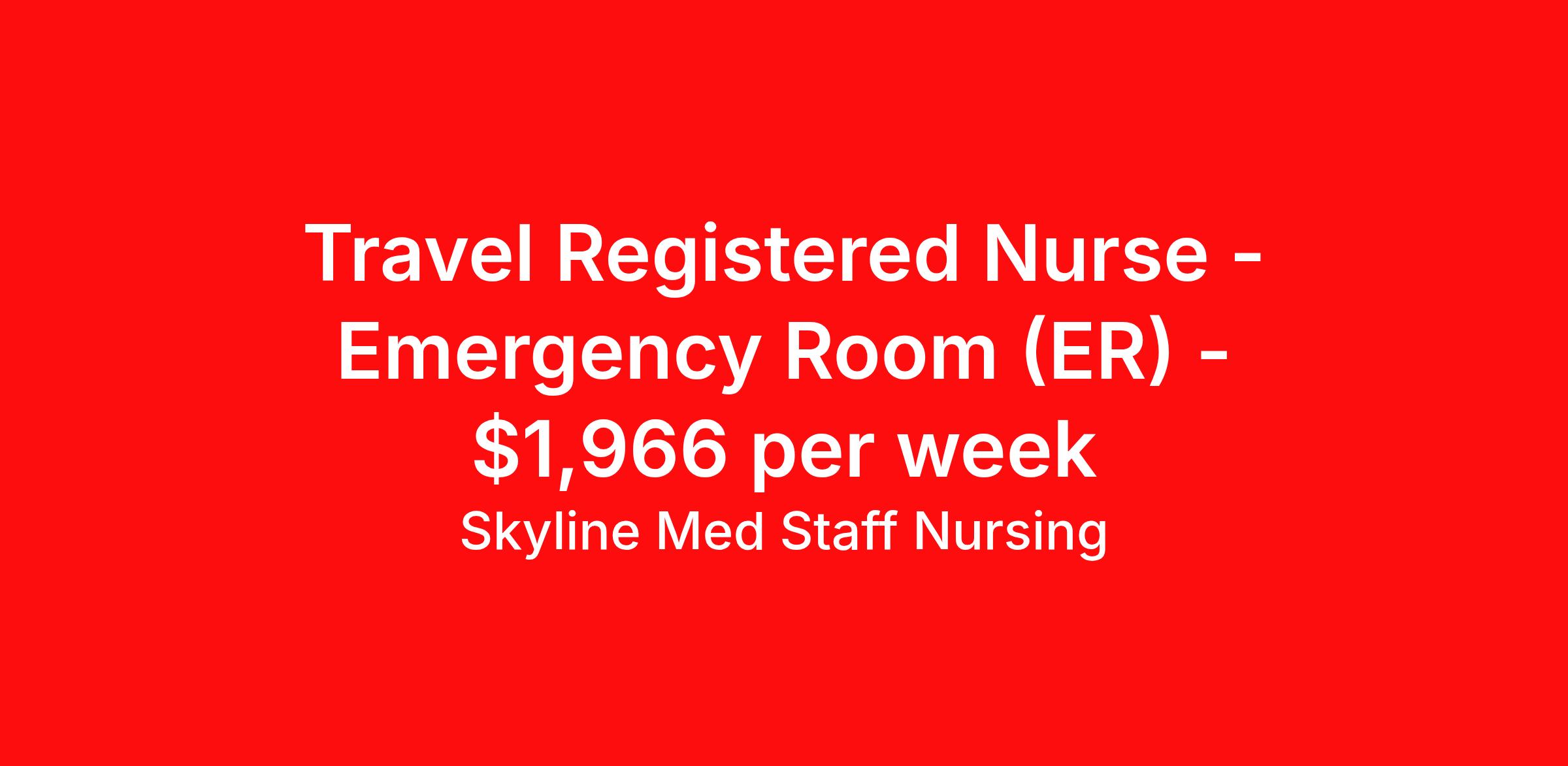 Skyline Med Staff Nursing is seeking a travel nurse RN ED - Emergency Department for a travel nursing job in Coos Bay, Oregon. Job Description & Requirements Specialty: ED - Emergency Department Discipline: RN Start Date: 04/07/2026 Duration: 13 weeks 36 hours per week Shift: 12 hours, evenings, rotating Employment Type: Travel Weekly amount stated in job postings is an estimate based on estimated hourly wage and potential stipends available for the location of the assignment. Pay package is calculated on bill rate at the time job was posted, but can change or vary without notice. Exact pay packages might vary as this is an estimate. Our recruiter would be happy to build an exact pay package for you for each job. Skyline Med Staff Nursing Job ID 36140612. Pay package is based on 12 hour shifts and 36.0 hours per week (subject to confirmation) with tax-free stipend amount to be determined. Posted job title: RN:ER,12:00:00-12:00:00 About Skyline Med Staff Nursing Join the Top- Rated Travel Healthcare Team! Skyline Med Staff was named as the 1 Best Travel Healthcare Company in 2025 by BluePipes, a recognition driven by glowing reviews from travel healthcare professionals. Our recruiters are consistently praised on Google for their responsiveness, dedication, accessibility, and industry knowledge. Ready to experience the difference? Apply for a job today and see why healthcare professionals choose Skyline! Certified Women Owned Business We believe that travel is good for the soul. We want to be on your journey with you and find the right job that fits you Skyline Med Staff is committed to one vision treating others the way that THEY want to be treated. The executive team at Skyline Med Staff focuses on a commitment to quality, consistency, and the highest level of service. Our team members continually strive to build long term relationships that center on you and helping you achieve your goals. Some of the Benefits you will receive with Skyline Med Staff: Over 30 years of combined experience in the staffing industry Higher Take-Home Pay Rates Dedicated Personal Recruiter We are available to you 24/7 Health Insurance Plan Options Tax Free Per Diems, Housing Stipends and Travel Reimbursements Joint Commission Certified Contracts in all 50 states Referral and Loyalty Bonuses Benefits Medical benefits Referral bonus