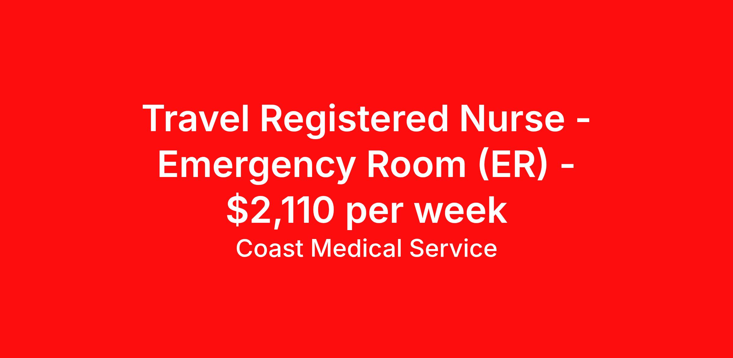 Coast Medical Service is seeking a travel nurse RN ED - Emergency Department for a travel nursing job in Coos Bay, Oregon. Job Description & Requirements Specialty: ED - Emergency Department Discipline: RN Start Date: 04/07/2026 Duration: 13 weeks 36 hours per week Shift: 12 hours, rotating Employment Type: Travel Coast Medical Service is a nationwide travel nursing & allied healthcare staffing agency dedicated to providing an elite traveler experience for the experienced or first-time traveler. Coast is featured on Blue Pipes' 2023 Best Travel Agencies and named a 2022 Top Rated Healthcare Staffing Firm & 2023 First Half Top Rated Healthcare Staffing Firm by Great Recruiters. Please note that pay rate may differ for locally based candidates. Please apply here or contact a recruiter directly to learn more about this position & the facility, and/or explore others that may be of interest to you. We look forward to speaking with you! Coast Medical Services Job ID 36140893. Pay package is based on 12 hour shifts and 36.0 hours per week (subject to confirmation) with tax-free stipend amount to be determined. Posted job title: RN:Emergency Room,07:00:00-19:00:00
