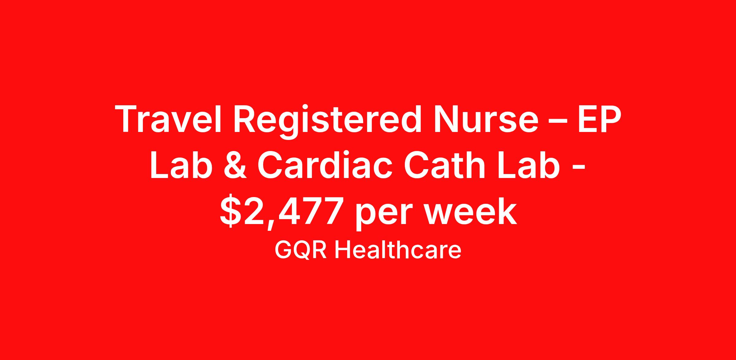 GQR Healthcare is seeking a travel nurse RN Electrophysiology Lab for a travel nursing job in York, Pennsylvania. Job Description & Requirements Specialty: Electrophysiology Lab Discipline: RN Start Date: 04/06/2026 Duration: 13 weeks 36 hours per week Shift: 12 hours, days Employment Type: Travel Contract - W2 Electrophysiology Registered Nurse (RN) Job Location: York, Pennsylvania Start Date: April 6, 2026 Profession: Registered Nurse (RN) Facility: Short Term Acute Care Estimated Pay: $2477.2 - $2572.2 Duration:13 weeks Specialty:Electrophysiology Shift: Day Shift Details: null Day Job Type: Travel *Estimated weekly pay includes projected hourly wages and weekly meal and lodging per diems for eligible clinicians based on nationally published GSA rates. Actual weekly pay and per diems may differ from the amount shown and are subject to change during an assignment. Benefits: Day 1 Insurance Cigna medical, MetLife dental and vision insurance License reimbursement for new licenses needed for each assignment Discounts with hotels and rental cars A dedicated recruiter and support team that will help you every step of the way to sure you start on time and have an exceptional experience Referral bonus up to $700 About the Company: Finding the right role is about more than just matching skills to a job—it’s about aligning with your goals, values, and the way you want to work. As an award-winning talent partner, we support healthcare professionals through every step of that process, offering meaningful opportunities, clear guidance, and long-term partnership. From our first conversation to your first day on the job (and beyond!), we’re here to help you move forward with confidence. GQR Job ID 786226. Pay package is based on 12 hour shifts and 36 hours per week (subject to confirmation) with tax-free stipend amount to be determined. Posted job title: Registered Nurse (RN) About GQR Healthcare GQR’s Healthcare team specializes in connecting experts within the industry to highly skilled healthcare professionals across the US market. In the competitive healthcare market, we recognize that the industry’s common goals of improved quality of care and patient outcomes are wholly reliant upon the professionals directly supporting these initiatives. Leveraging our extensive candidate network, we deliver continuity of care for the communities our partners serve to ensure the patient experience is of the highest quality. Through deep market specialization and a unique approach to talent acquisition, GQR Healthcare provides an unparalleled and personalized experience across all medical specialties in nursing and within diverse healthcare platforms across the industry.