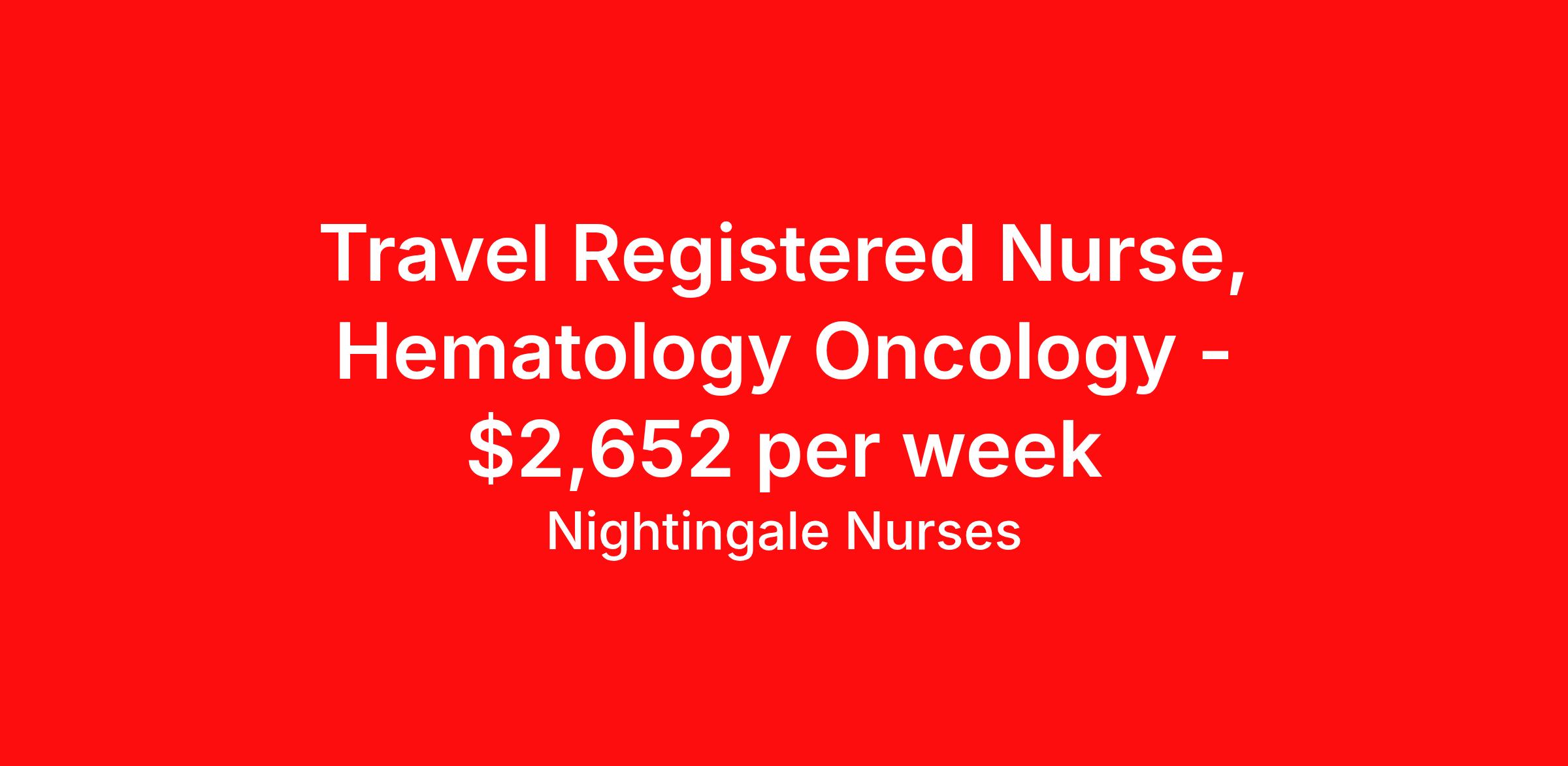 Nightingale Nurses is seeking a travel nurse RN Hematology / Oncology for a travel nursing job in Oklahoma City, Oklahoma. Job Description & Requirements Specialty: Hematology / Oncology Discipline: RN Start Date: 03/28/2026 Duration: 12 weeks 36 hours per week Shift: 12 hours, nights Employment Type: Travel About Nightingale Nurses the first name in travel nursing You may not realize it, but as an RN with real world hospital experience, you are legendary. To the lives you’ve helped save, the patients you’ve cared for, and to the hospitals where you’ve done it. And you’re just getting started. Legendary is where Nightingale begins. We’re the first name in travel nursing, representing only the very best RNs. That’s why hospitals prefer us, allowing us to offer exceptional travel nursing assignments all over the US, as well as the highest pay rates and most extensive benefits in the industry. Nightingale facilitates every aspect of your travel nursing assignment, so you can focus on doing what you do best. We want you to grow, explore, and enjoy unrivaled liberty, the freedom to nurse.