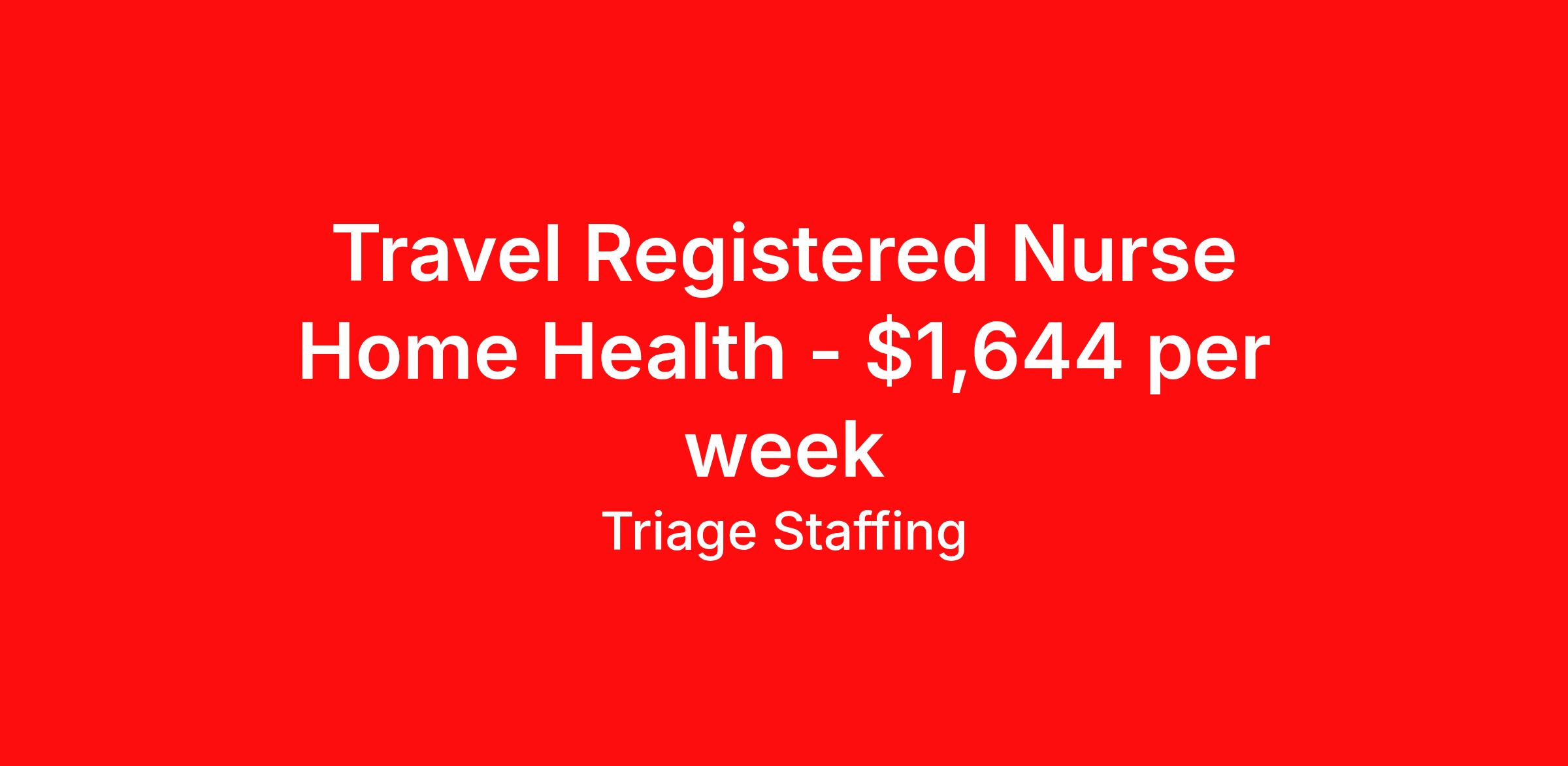 Triage Staffing is seeking a travel nurse RN Home Health for a travel nursing job in Melbourne, Florida. Job Description & Requirements Specialty: Home Health Discipline: RN Start Date: 04/20/2026 Duration: 13 weeks 45 hours per week Shift: 9 hours, days Employment Type: Travel Travel Long Term Care: Home Health Melbourne Location: Melbourne Start Date: 4/20/2026 Shift Details: 9H Days 40 hours per week Length: 13 WEEKS Apply for specific facility details.Home Health RN Triage Staffing Job ID QRQMWNKD. Posted job title: Home Health About Triage Staffing At Triage, we prefer to be real . Real about expectations—both ours and yours. Real about how a decision you make today could affect your tomorrows. Real about how compensation actually works. Real about how great—or grating—your next supervisor may be. Being real allows everyone at Triage to be ready . Ready to serve you with real honesty. So if that gig near the ocean is really no day at the beach, or that third shift comes with a second-class rate, we tell you. So you can be ready, too. We staff all five major divisions of acute care—nursing, lab, radiology, cardiopulmonary and rehab therapy, offering: - Competitive, custom pay packages - One point of contact for both travelers and facilities (per division) - A reliable recruiter who's got your back throughout your entire assignment - In-house compliance and accounting specialists - A clinical liaison team available 24/7 to offer medical and professional support and career development - A mentoring program that is run and managed by actual clinicians—yeah, you read that right - And more (because of course there’s more) Are we the biggest? No. Are we the best? That’s rather subjective, but we’re trying to be. Will we work like hell to get you as close to your idea of heaven as possible? Yes. Yes, we will. Benefits: Day One comprehensive, nationwide insurance plans for health, vision and dental and life—including a HSA option Day One 401(k) program with employer-matching contributions once eligible Facility cancelling protection—your time is money on and off-the-clock Guaranteed hours Weekly paychecks via direct deposit Earned vacation bonuses for time worked Paid holidays Employee assistance program (EAP)—your mental health is important, too Continuing education, certification and licensing reimbursement Workers comp—because accidents happen Top-rated professional liability insurance Company provided housing options Referral bonus—$750 in your pocket after they’ve completed a 13-week assignment