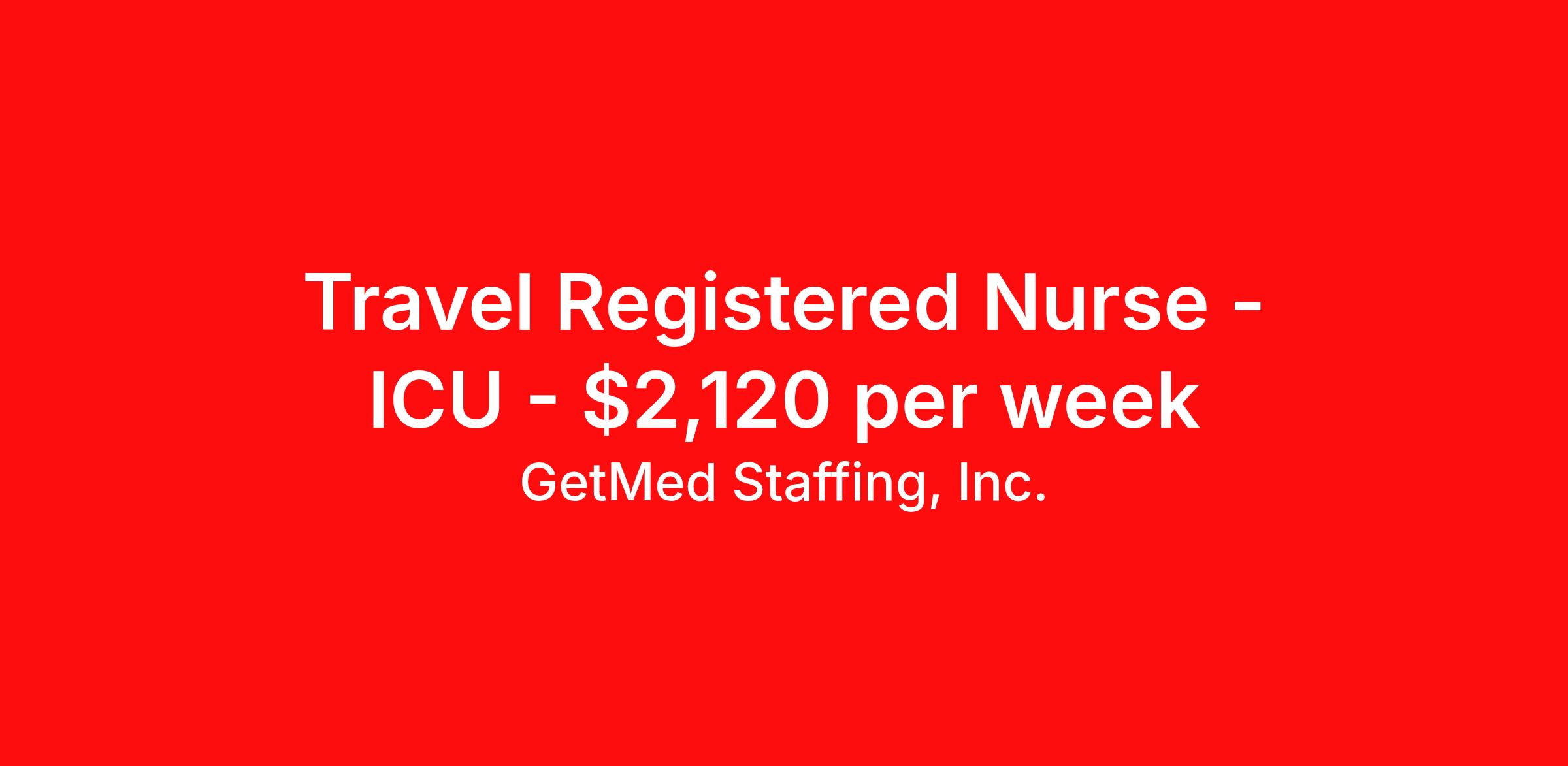 GetMed Staffing, Inc. is seeking a travel nurse RN ICU - Intensive Care Unit for a travel nursing job in Brunswick, Maine. Job Description & Requirements Specialty: ICU - Intensive Care Unit Discipline: RN Start Date: 04/05/2026 Duration: 13 weeks 36 hours per week Shift: 12 hours, nights Employment Type: Travel GetMed Staffing is searching for a strong ICU RN to assist our traveler-friendly client. A minimum of 1-2 years of experience is required. Traveling with GetMed Staffing offers the unique opportunity to gain diverse experiences, both personally and professionally. Gain experience that matters. GetMed Staffing, Inc. Job ID 36152026. Pay package is based on 12 hour shifts and 36.0 hours per week (subject to confirmation) with tax-free stipend amount to be determined. Posted job title: RN:ICU,19:00:00-07:00:00 About GetMed Staffing, Inc. We are a diversity owned company, specializing in healthcare recruiting services. We truly understand how important a healthcare travelers' relationship is with their recruiter, as well as our relationship is with our healthcare facilities. We recognize that the needs of our healthcare travelers can vary, and therefore we provide the personalized touch necessary to ensure a successful travel assignment each and every time. Our healthcare facilities and clients benefit from us putting our healthcare travelers first. GetMed Staffing is excited to be a leader within the industry by focusing on providing healthcare travelers with more choices and possibilities as they plan for their next healthcare travel assignment. Benefits Life insurance Medical benefits Dental benefits Vision benefits 401k retirement plan