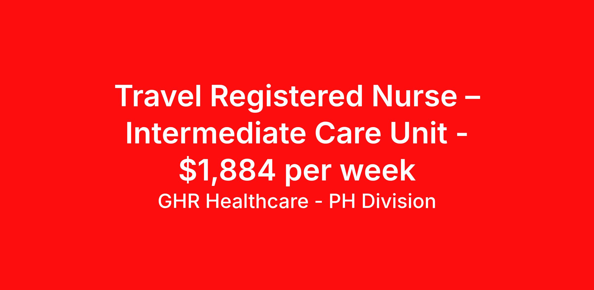 GHR Healthcare - PH Division is seeking a travel nurse RN Intermediate Care for a travel nursing job in Washington, District of Columbia. Job Description & Requirements Specialty: Intermediate Care Discipline: RN Start Date: 04/20/2026 Duration: 13 weeks 36 hours per week Shift: 12 hours Employment Type: Travel Planet Healthcare Job ID 76335056. Pay package is based on 12 hour shifts and 36 hours per week (subject to confirmation) with tax-free stipend amount to be determined. About GHR Healthcare - PH Division For over 30 years, GHR Healthcare has been the bridge between healthcare professionals and the facilities that need them nationwide. We're committed to uncovering your ideal fit, supported by GHR's dedication to competitive compensation, transparent communication, and a devoted team that genuinely cares about your career journey. You can trust us to stand by your side as your advocate, confidante, and partner in advancing your career. At GHR, care and consideration are at the heart of everything we do. Visit ghrhealthcare.com to learn more.