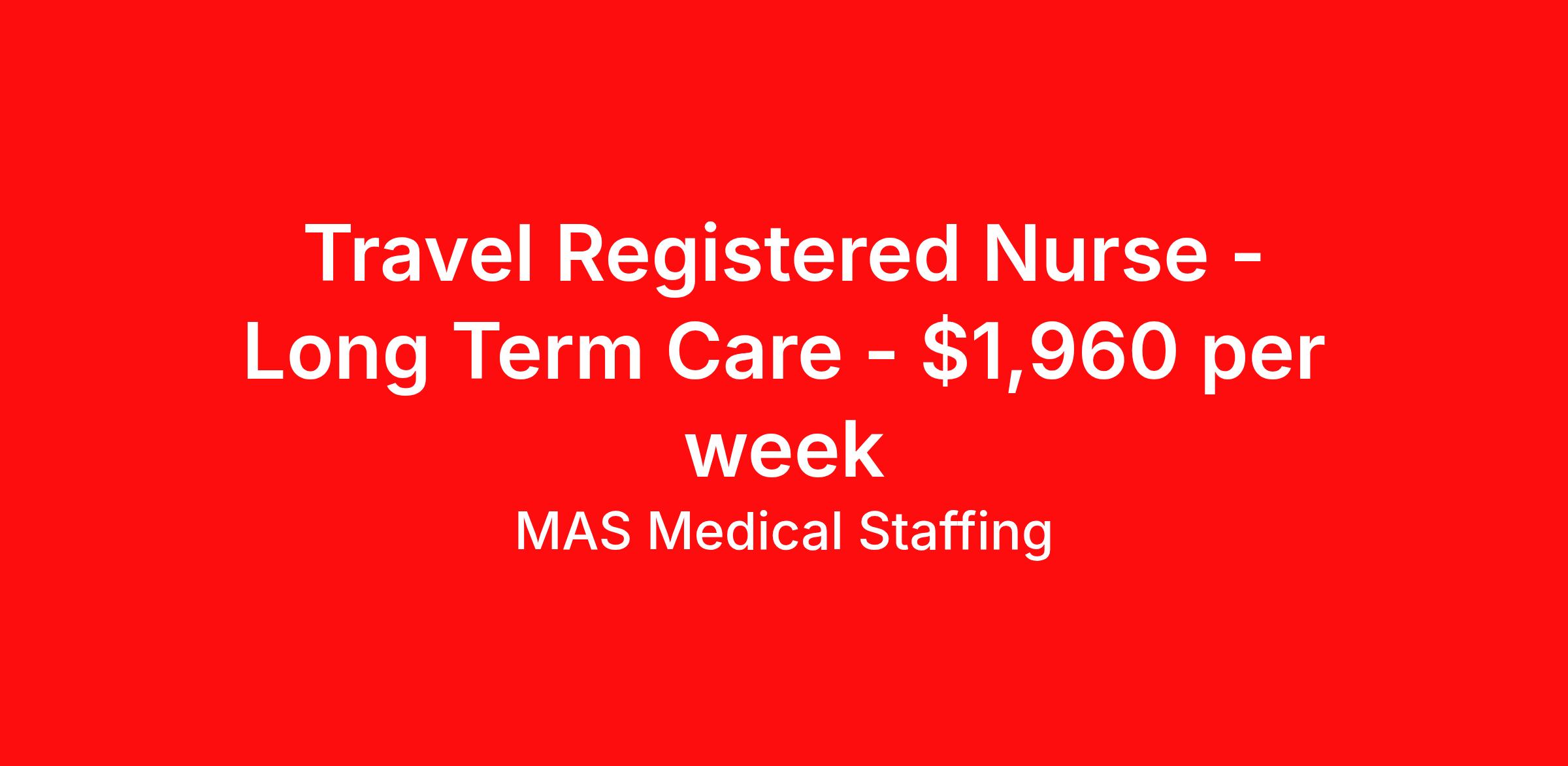 MAS Medical Staffing is seeking a travel nurse RN Long Term Care for a travel nursing job in Biddeford, Maine. Job Description & Requirements Specialty: Long Term Care Discipline: RN Start Date: ASAP Duration: 13 weeks 36 hours per week Shift: 12 hours Employment Type: Travel Registered Nurse | Up to $1,960/week Tired of staffing agencies that don’t put YOU first? Hi! We’re MAS Medical Staffing, one of the largest healthcare staffing agencies in the country. We fill thousands of positions, in your neighborhood and across the country – but we’re so much more than just jobs! Our staff are a part of Team MAS, not independent contractors, and we treat our team right. MAS roles offer industry-leading benefits, a top-notch caregiver service team for support, and a tailored approach that’s focused on finding you the best job for your needs from our nationwide database of opportunities. We’re looking for a Registered Nurse in Biddeford, ME for a 13-weeks travel contract position. Perks and Benefits: Super-fast benefits eligibility, with a range of health insurance plans to fit your needs and budget Vision, Dental & supplemental insurance options Same-day pay option for most shifts – always free and there when you need it Housing stipends and relocation assistance available for eligible candidates Requirements: Must be an actively Registered Nurse to work at MAS Certification from an accredited school required 1-year prior experience required Assignment Details: 13 weeks Nights shift (7p – 7a) Every other weekend required 36 hours/week guaranteed Also available as a local contract, at a reduced rate MAS is an equal-opportunity employer. All applicants will be considered for employment without attention to race, color, religion, sex, sexual orientation, gender identity, national origin, veteran or disability status. MaineRNLPN MAS Medical Staffing Job ID 759729. Pay package is based on 12 hour shifts and 36 hours per week (subject to confirmation) with tax-free stipend amount to be determined. Posted job title: Registered Nurse | Up to $1,960/week About MAS Medical Staffing Tired of the typical one-size-fits-all approach that you get with most healthcare staffing agencies? Hi! We’re MAS Medical Staffing, one of the largest full-service healthcare staffing agencies in the country, and we have a better way to help our caregivers find the work they want. At MAS you can choose from the flexibility of per diem shifts, the consistency and great pay of local contracts, the adventure of travel nursing, or specialized roles like Allied Health (PT, OT, COTA, SLP, PTA, etc.) all within one agency. When your needs change, we’ve got you covered! Your dedicated support team can help you find your next role from our range of options. Perks and Benefits: Competitive pay Guaranteed Hours Industry-leading benefits, including health, dental & supplemental insurance, paid time off, and a 401(k) program with company match for those who qualify Dedicated support team, just a phone call away and ready to help Painless credentialing process, so you can start earning quickly Weekly direct deposit Ability to work a schedule that best fits your life and financial goals Travel contracts include housing stipends and relocation assistance for those who qualify 20 years of experience helping medical professionals find rewarding careers