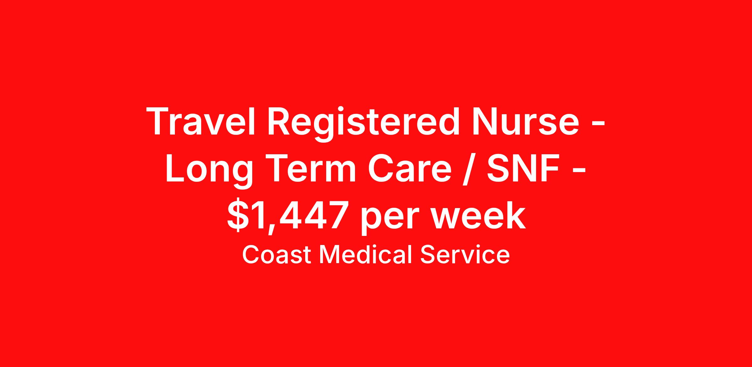 Coast Medical Service is seeking a travel nurse RN Long Term Care (LTC) Long Term Care for a travel nursing job in Waterville, Maine. Job Description & Requirements Specialty: Long Term Care Discipline: RN Start Date: ASAP Duration: 12 weeks 36 hours per week Shift: 12 hours, days Employment Type: Travel Coast Medical Service is a nationwide travel nursing & allied healthcare staffing agency dedicated to providing an elite traveler experience for the experienced or first-time traveler. Coast is featured on Blue Pipes' 2023 Best Travel Agencies and named a 2022 Top Rated Healthcare Staffing Firm & 2023 First Half Top Rated Healthcare Staffing Firm by Great Recruiters. Please note that pay rate may differ for locally based candidates. Please apply here or contact a recruiter directly to learn more about this position & the facility, and/or explore others that may be of interest to you. We look forward to speaking with you! Coast Medical Services Job ID 35839704. Pay package is based on 12 hour shifts and 36.0 hours per week (subject to confirmation) with tax-free stipend amount to be determined. Posted job title: RN:LTC / SNF,07:00:00-19:30:00
