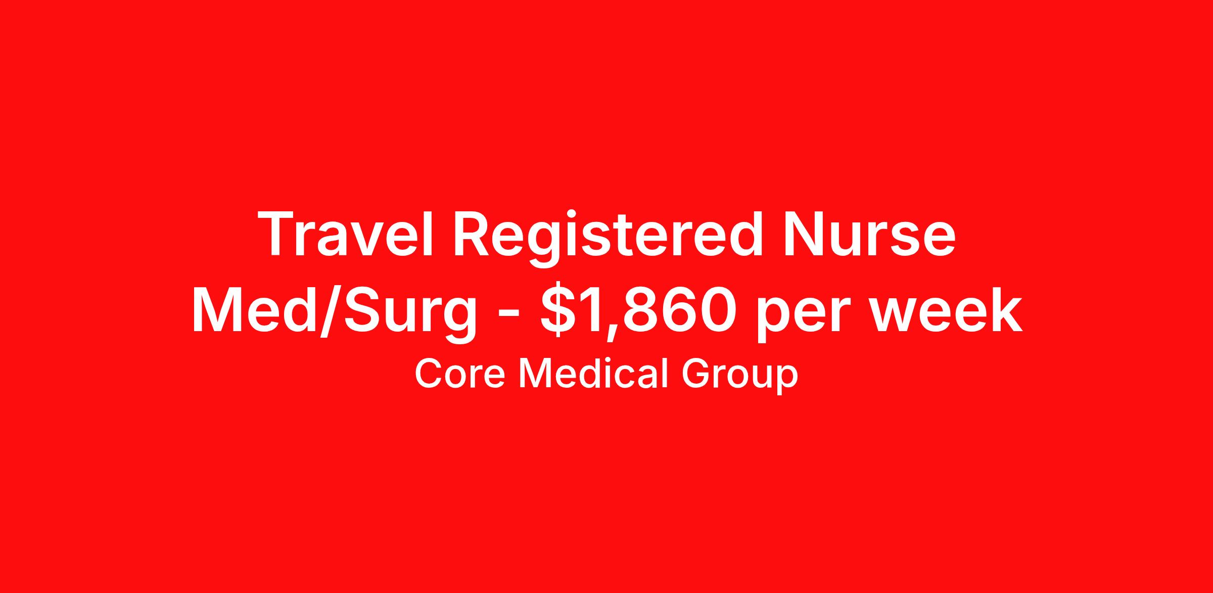Core Medical Group is seeking a travel nurse RN Med Surg for a travel nursing job in Saint Johnsbury, Vermont. Job Description & Requirements Specialty: Med Surg Discipline: RN Start Date: 03/25/2026 Duration: 13 weeks 36 hours per week Shift: 12 hours Employment Type: Travel Client in VT seeking Registered Nurse: Med/Surg for the following shift(s): Days We are looking for a healthcare professional who is ready to provide exceptional patient care in this contract/travel role. Contract/travel assignments are typically 13 weeks, with potential to extend. Help us continue our mission to connect people, improve lives, and give back to the community by joining the CoreMedical Group team. When you work with CoreMedical Group, we put you first and treat you like family, supporting you every step of the way. CoreMedical Group is one of the largest healthcare staffing agencies in the country, with travel and contract positions located across the United States. Our recruiters will help you find the perfect job, whether it's across the country or across the street. In addition to dedicated, personalized support from your recruiter, when you work with CoreMedical Group you'll receive: Access to an extensive benefits package, including day 1 health, dental, and vision insurance, employer paid life insurance, a health reimbursement account, and more! Weekly paychecks with competitive pay packages Matching 401(k) benefits to help you save for retirement Licensure assistance and reimbursement to set you up for success on your contract Travel reimbursement and dedicated housing support while on assignment Referral cash bonuses when you connect us with other clinicians CoreMedical Group also offers you a free, all-inclusive vacation each year as our way of saying "thank you" for your hard work. Join other healthcare professionals on the annual Club CoreMed retreat and you'll see why our contract and travel professionals come back to us year after year! Your career is too valuable to tackle on your own. Let CoreMedical Group help you with your healthcare journey! *Estimate of weekly payments is intended for informational purposes and includes hourly wages, as well as reimbursements for meal & incidental expenses, and housing expenses incurred on behalf of the Company. Any benefits (medical/dental/vision) are in addition to the weekly pay. Please speak with your Recruiter for additional details. Estimated payments are subject to change until formal offer of assignment is made and accepted. Core Medical Group Job ID 1362536. Pay package is based on 12 hour shifts and 36 hours per week (subject to confirmation) with tax-free stipend amount to be determined. Posted job title: RN About Core Medical Group CoreMedical Group is one of the largest healthcare staffing agencies in the country. We have jobs nationwide in travel nursing, travel allied health, interim, locum tenens, and permanent placements! Join the staffing agency with Club CoreMed, the best perk in the industry - an all inclusive paid trip to a tropical resort! Benefits Weekly pay Holiday Pay Guaranteed Hours Continuing Education 401k retirement plan Pet insurance Company provided housing options Sick pay Wellness and fitness programs Mileage reimbursement Referral bonus Employee assistance programs Medical benefits Dental benefits Vision benefits Benefits start day 1 License and certification reimbursement Life insurance Discount program
