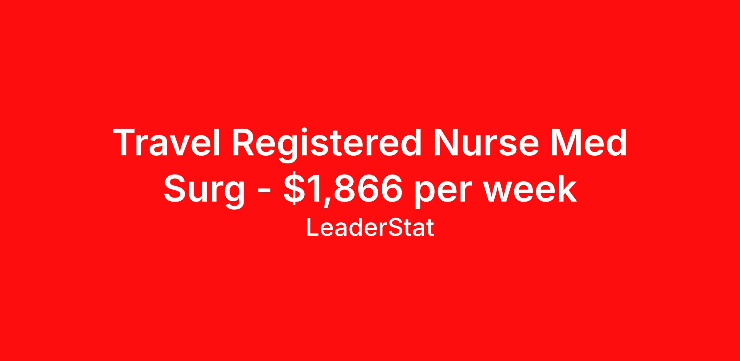 LeaderStat is seeking a travel nurse RN Med Surg for a travel nursing job in Hickory, North Carolina. Job Description & Requirements Specialty: Med Surg Discipline: RN Start Date: 04/19/2026 Duration: 13 weeks 36 hours per week Shift: 12 hours Employment Type: Travel Estimated Pay Package : Up to $ 1866.19 per week *The above pay package is an estimate, please contact our team to put together your personalized pay package, as a variety of factors can influence your total pay.* Registered Nurse - RN Med Surg | Registered Nurse - RN in Hickory, NC LeaderStat is currently seeking a Registered Nurse - RN with Med Surg | Registered Nurse - RN experience for a(n) 13 week contract in NC. Start Date: 4/19/2026 Shift: 19:00-07:00 Minimum of 18 months experience working as a full-time Registered Nurse Clinical experience within the last 2 years Current State Licensure Current Relevant Certifications (BLS, ACLS, etc) The LeaderStat Difference At LeaderStat, our recruiters are true experts in Travel Nursing. We go above and beyond to match each candidate with the best travel nurse opportunities available. But our commitment doesn’t stop at placement. We’re here to ensure your success every step of the way, providing continuous support throughout your entire contract—from start to finish! Our goal is to find the perfect travel nurse assignments that align with your unique needs and career goals. While you focus on delivering exceptional care to your patients, we’ll take care of everything else, allowing you to thrive in your role. LeaderStat Perks & Benefits As a Traveling Nurse with LeaderStat you receive excellent benefits: Weekly Pay & Direct Deposit W2 Employee Status 401(k) Retirement Plan Medical, Dental and Vision Insurance Referral Bonuses Dedicated Support Team To learn more about LeaderStat visit www.leaderstat.com/travel-nursing Equal Employment Opportunity: LeaderStat, Ltd. prohibits discrimination with respect to the hiring or promotion of individuals, conditions of employment, disciplinary and discharge practices or any other aspect of employment on the basis of sex, race, color, age, national origin, religion, disability, marital status, sexual orientation, gender identity, pregnancy or veteran status. LeaderStat Job ID 297535. Pay package is based on 12 hour shifts and 36 hours per week (subject to confirmation) with tax-free stipend amount to be determined. Posted job title: Medical-Surgical - Registered Nurse About LeaderStat LeaderStat is a National staffing, recruiting, and consulting firm dedicated to the healthcare industry. For 20 years, LeaderStat has been dedicated to partnering with exceptional healthcare providers to find them the very best assignments throughout the country. Specializing in Travel Nursing, Interim Leadership, Executive Search, and Consulting. When you work with the LeaderStat team, you work with a recruiter who is dedicated to finding you the perfect assignment. Why would you settle for less? Benefits Referral bonus License and certification reimbursement Medical benefits Holiday Pay Weekly pay 401k retirement plan