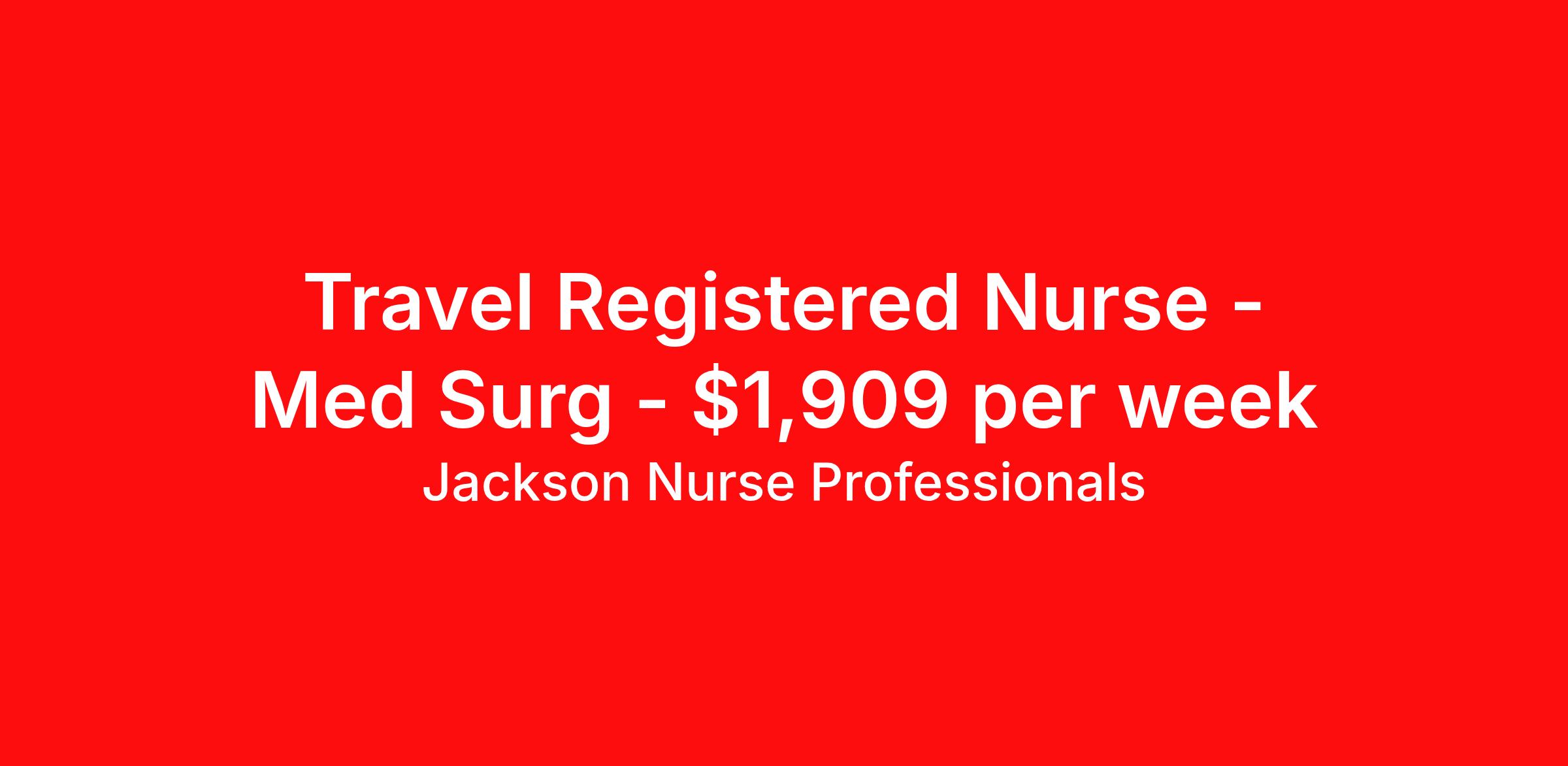 Jackson Nurse Professionals is seeking a travel nurse RN Med Surg for a travel nursing job in Birmingham, Alabama. Job Description & Requirements Specialty: Med Surg Discipline: RN Start Date: 03/23/2026 Duration: 8 weeks 36 hours per week Shift: 12 hours, nights Employment Type: Travel At Jackson Nurse Professionals , we are dedicated to supporting travel nurses and helping you build a fulfilling nursing career. Whether you’re looking for your first or next travel nursing assignment, we specialize in connecting healthcare professionals with leading medical facilities. With a focus on personalized service and a wide range of opportunities, we make it easier than ever for nurses to find the right balance of adventure and professional growth. Qualifications: 2 years of recent experience in area of specialty listed on job Current BLS required (certifications vary by location – job may require ACLS) Valid license and/or certification in state of practice Valid Driver's License Background and drug screen Benefits: Full Medical, Dental and Vision Insurance 401(k) with Employer Match 24/7/365 Support from your Recruiter available by text, phone, or email Referral Bonus Program: Give $200, Get $500 for every referral Same Day Immediate Pay Access Certification & Licensure Reimbursement Apply today to experience the Jackson Nurse Professionals difference! Jackson Nurse Professionals Job ID 2450131. Pay package is based on 12 hour shifts and 36 hours per week (subject to confirmation) with tax-free stipend amount to be determined. About Jackson Nurse Professionals Filling critical needs in patient care, Jackson Nurse Professionals delivers cost-effective travel nurse staffing solutions to over 500 hospitals, outpatient clinics, and home health clients nationwide. Awarded Best of Staffing - Talent and Client 2024, and rated as a Top Workplace 2023 by the Orlando Sentinel, Jackson Nurse Professionals goes the extra mile to provide travel nurses the career they deserve, while providing clients with a large range of highly skilled nurses to fill short, long-term, and temporary assignments. As a member of Jackson Healthcare’s family of award-winning staffing companies, we’re part of a growing community that’s impacting 10 million patients nationwide. Join our mission to improve the delivery of patient care, and the lives of everyone we touch.