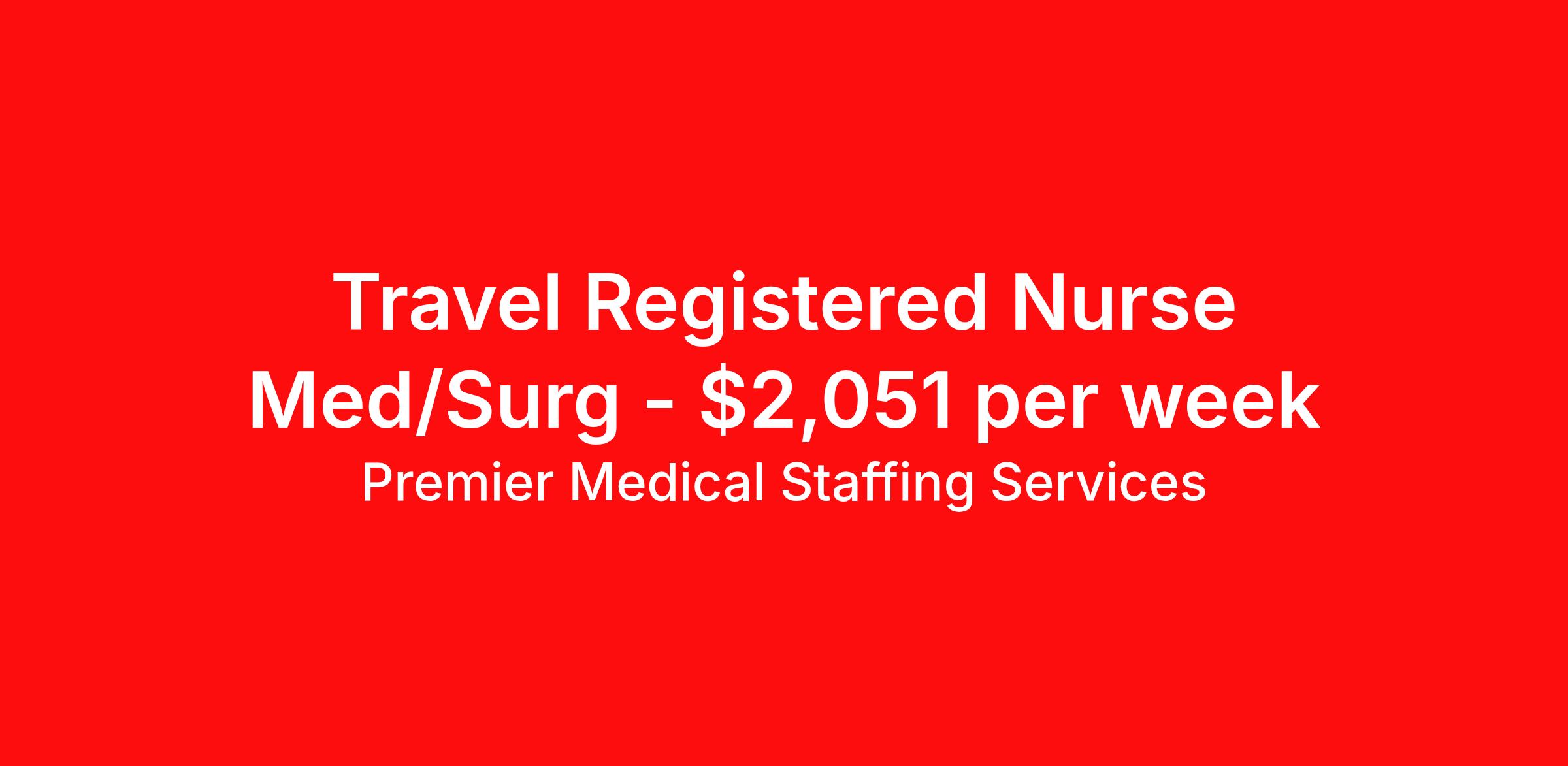 Premier Medical Staffing Services is seeking a travel nurse RN Med Surg for a travel nursing job in Saint Johnsbury, Vermont. Job Description & Requirements Specialty: Med Surg Discipline: RN Start Date: 03/25/2026 Duration: 13 weeks 36 hours per week Shift: 12 hours Employment Type: Travel Premier Medical Staffing Job ID 625654. Pay package is based on 12 hour shifts and 36 hours per week (subject to confirmation) with tax-free stipend amount to be determined. Posted job title: RN Med/Surg About Premier Medical Staffing Services Premier Medical Staffing Services, LLC is a nationally expanding healthcare staffing firm for healthcare professionals and companies. We understand our clients’ need for highly qualified, expertly trained medical professionals and are passionate about helping clinicians find employment opportunities that fit their personality and needs. Able to accommodate the ever-changing needs of the healthcare landscape, we offer per-diem, contract and direct hire placements to support the unique needs of each industry sector. Premier Medical Staffing Services is Joint Commission Certified, a Military Spouse Employment Partner and is certified as a Women’s Business Enterprise. We are proudly nurse owned.