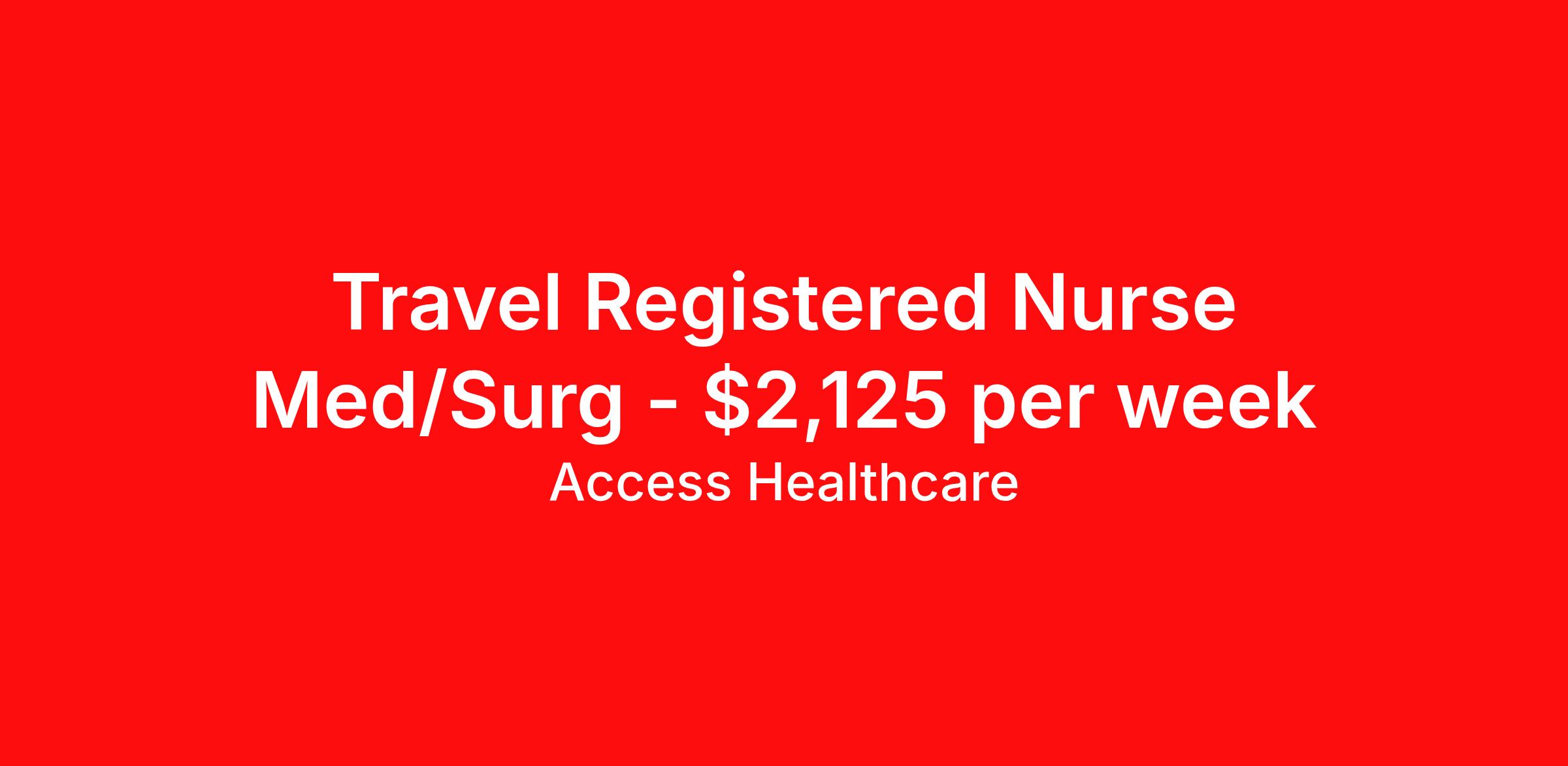 Access Healthcare is seeking a travel nurse RN Med Surg for a travel nursing job in St Johnsbury, Vermont. Job Description & Requirements Specialty: Med Surg Discipline: RN Start Date: 03/25/2026 Duration: 13 weeks 36 hours per week Shift: 12 hours, days Employment Type: Travel Access Healthcare Job ID 76046537. Pay package is based on 12 hour shifts and 36 hours per week (subject to confirmation) with tax-free stipend amount to be determined. About Access Healthcare Access Healthcare aims to provide superior service to our nursing family by providing around the clock support, competitive pay packages and an unmatched benefits package! Unlike other agencies, we offer a true family feel and work with you to find the placement that is right for you. We offer one of the top leading pay packages in the industry and we are ready to get you the money you deserve! Access Healthcare was founded by two travel nurses, Danielle and Diego, who had a dream and a shared vision of creating an agency which all nurses would want to work with. Our passion has led us to where we are today as one of the top 10 agencies in our home state of New Jersey, with access to contracts in all 50 states! We encourage you to join our team and we cannot wait to get to know you!