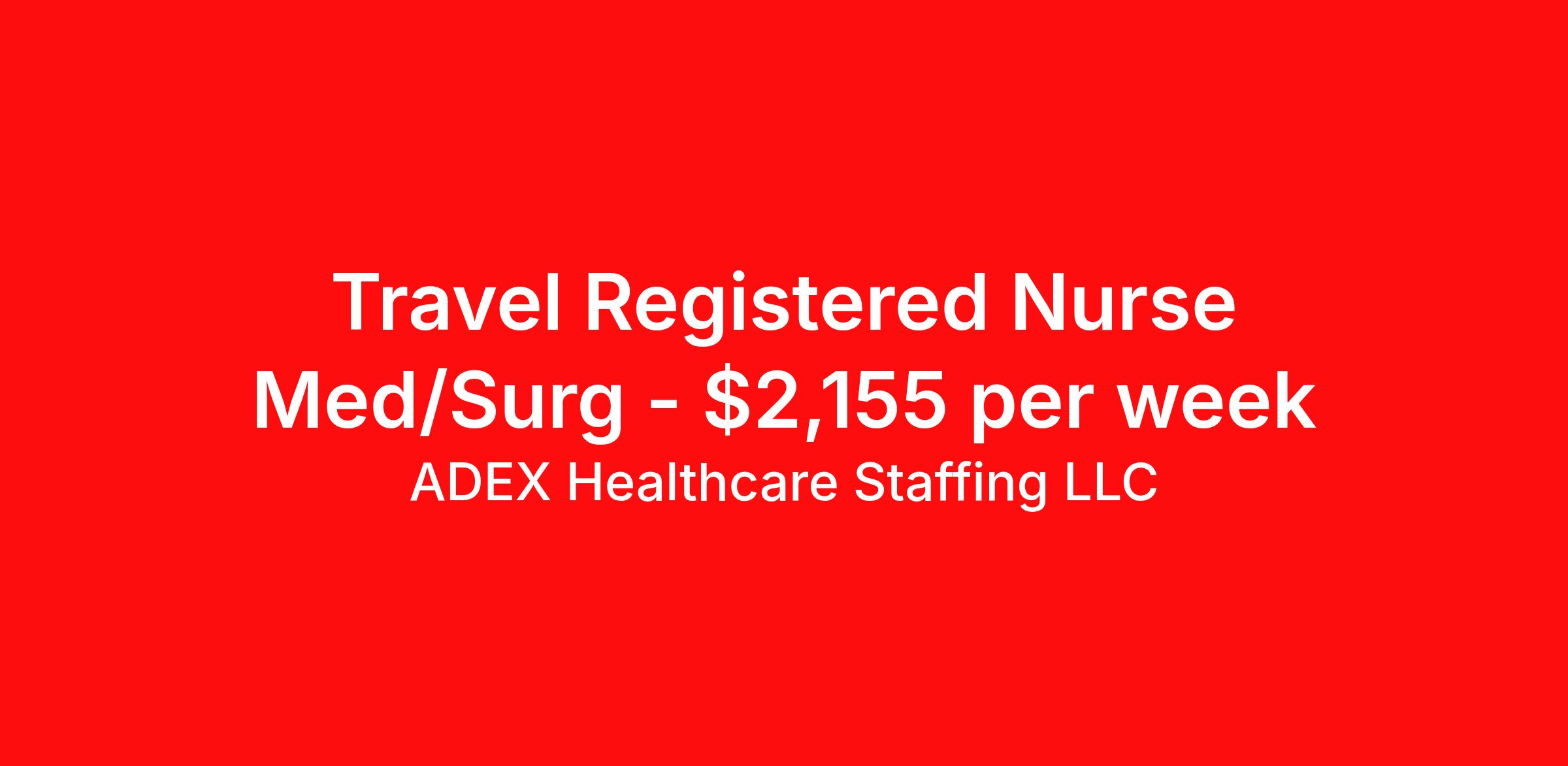 ADEX Healthcare Staffing LLC is seeking a travel nurse RN Med Surg for a travel nursing job in St Johnsbury, Vermont. Job Description & Requirements Specialty: Med Surg Discipline: RN Start Date: 03/25/2026 Duration: 13 weeks 36 hours per week Shift: 12 hours, days Employment Type: Travel RN Position Job Notes: Travel or Local Registered Nurse needed for ASAP start. A minimum of 2 years of recent hospital bedside experience is required. Candidates must be able to start within 5 weeks. Opportunity for extension upon successful completion of the initial assignment. $750 referral bonus available. Opportunity: RN - Med Surg Peds Adult Job Details: • Day shift position working primarily with adult patients with occasional pediatric patients • Must be able to start on 3/25/26 • Provide comprehensive medical, surgical, outpatient, observation, swing bed, and pediatric care in general Med/Surg unit • Coordinate exceptional patient care for adult and pediatric patients • Utilize the Nursing Process to make critical decisions • Provide holistic care addressing patients' age, physiological, spiritual, psychosocial, and developmental needs • Work under accountability to Unit Director and collaborate with Clinical Nurse Lead and/or Nursing Supervisor • Minimum three years of acute care experience required • Preference given to candidates familiar with Meditech • Required certifications: Current Vermont RN or multi-state RN licensure, BLS (American Heart Association), and ACLS • Travelers will start on Wednesdays • During orientation week, travelers on 48 hour contract will only be guaranteed 36 hours due to midweek start • All required credentials must be uploaded five business days before start date • This is NOT a pediatric floor but may occasionally have pediatric patients Facility: This is a cherished 25-bed independent and nonprofit critical access hospital located in Vermont's historic Northeast Kingdom. The facility delivers primary and preventive care, surgical and specialty services, inpatient and outpatient care, and round-the-clock emergency services staffed by dedicated board-certified physicians. The hospital is known for providing exceptional healthcare in a collaborative and supportive environment that prioritizes comprehensive patient care. Location: St Johnsbury, VT St Johnsbury offers an escape from city life in the breathtaking Northeast Kingdom of Vermont, an outdoor wonderland perfect for adventure enthusiasts. The area is renowned for its unspoiled natural beauty and year-round recreational activities, making it an ideal location for healthcare professionals seeking a vibrant and fulfilling lifestyle surrounded by stunning landscapes. Adex Job ID 294351. Pay package is based on 12 hour shifts and 36 hours per week (subject to confirmation) with tax-free stipend amount to be determined. About ADEX Healthcare Staffing LLC ADEX has been placing healthcare professionals across the US since 2004. Originally founded in Atlanta, GA, the company's headquarters are now located in Tampa, FL. JCAHO certified since 2009. Benefits Referral bonus