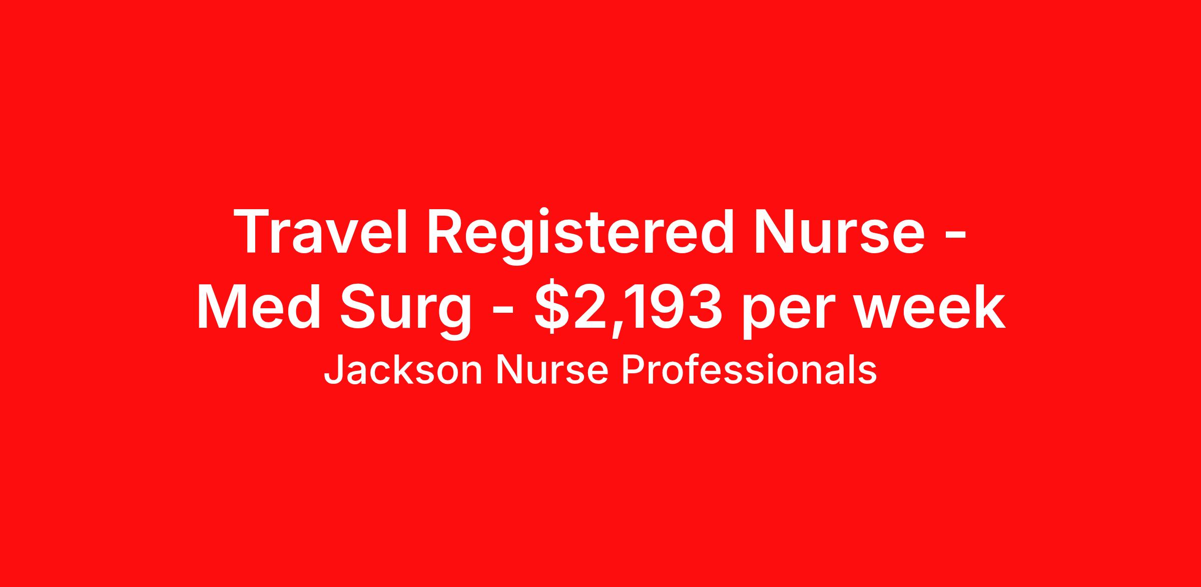 Jackson Nurse Professionals is seeking a travel nurse RN Med Surg for a travel nursing job in Syracuse, New York. Job Description & Requirements Specialty: Med Surg Discipline: RN Start Date: ASAP Duration: 16 weeks 36 hours per week Shift: 12 hours, days Employment Type: Travel At Jackson Nurse Professionals , we are dedicated to supporting travel nurses and helping you build a fulfilling nursing career. Whether you’re looking for your first or next travel nursing assignment, we specialize in connecting healthcare professionals with leading medical facilities. With a focus on personalized service and a wide range of opportunities, we make it easier than ever for nurses to find the right balance of adventure and professional growth. Qualifications: 2 years of recent experience in area of specialty listed on job Current BLS required (certifications vary by location – job may require ACLS) Valid license and/or certification in state of practice Valid Driver's License Background and drug screen Benefits: Full Medical, Dental and Vision Insurance 401(k) with Employer Match 24/7/365 Support from your Recruiter available by text, phone, or email Referral Bonus Program: Give $200, Get $500 for every referral Same Day Immediate Pay Access Certification & Licensure Reimbursement Apply today to experience the Jackson Nurse Professionals difference! Jackson Nurse Professionals Job ID 2463543. Pay package is based on 12 hour shifts and 36 hours per week (subject to confirmation) with tax-free stipend amount to be determined. About Jackson Nurse Professionals Filling critical needs in patient care, Jackson Nurse Professionals delivers cost-effective travel nurse staffing solutions to over 500 hospitals, outpatient clinics, and home health clients nationwide. Awarded Best of Staffing - Talent and Client 2024, and rated as a Top Workplace 2023 by the Orlando Sentinel, Jackson Nurse Professionals goes the extra mile to provide travel nurses the career they deserve, while providing clients with a large range of highly skilled nurses to fill short, long-term, and temporary assignments. As a member of Jackson Healthcare’s family of award-winning staffing companies, we’re part of a growing community that’s impacting 10 million patients nationwide. Join our mission to improve the delivery of patient care, and the lives of everyone we touch.
