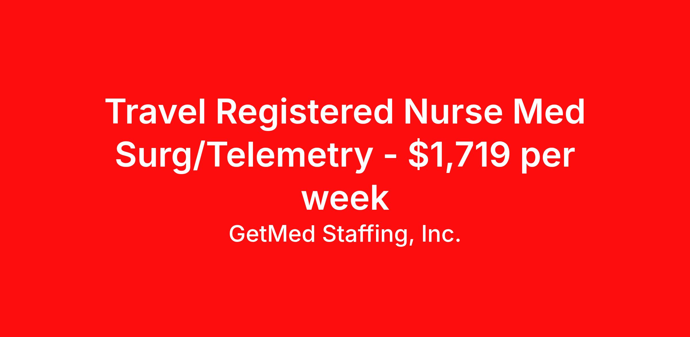 GetMed Staffing, Inc. is seeking a travel nurse RN Telemetry for a travel nursing job in Baltimore, Maryland. Job Description & Requirements Specialty: Telemetry Discipline: RN Start Date: 03/31/2026 Duration: 13 weeks 36 hours per week Shift: 12 hours, nights Employment Type: Travel GetMed Staffing, Inc. Job ID 36080912. Pay package is based on 12 hour shifts and 36.0 hours per week (subject to confirmation) with tax-free stipend amount to be determined. Posted job title: RN:Telemetry,19:00:00-07:00:00 About GetMed Staffing, Inc. We are a diversity owned company, specializing in healthcare recruiting services. We truly understand how important a healthcare travelers' relationship is with their recruiter, as well as our relationship is with our healthcare facilities. We recognize that the needs of our healthcare travelers can vary, and therefore we provide the personalized touch necessary to ensure a successful travel assignment each and every time. Our healthcare facilities and clients benefit from us putting our healthcare travelers first. GetMed Staffing is excited to be a leader within the industry by focusing on providing healthcare travelers with more choices and possibilities as they plan for their next healthcare travel assignment. Benefits Life insurance Medical benefits Dental benefits Vision benefits 401k retirement plan