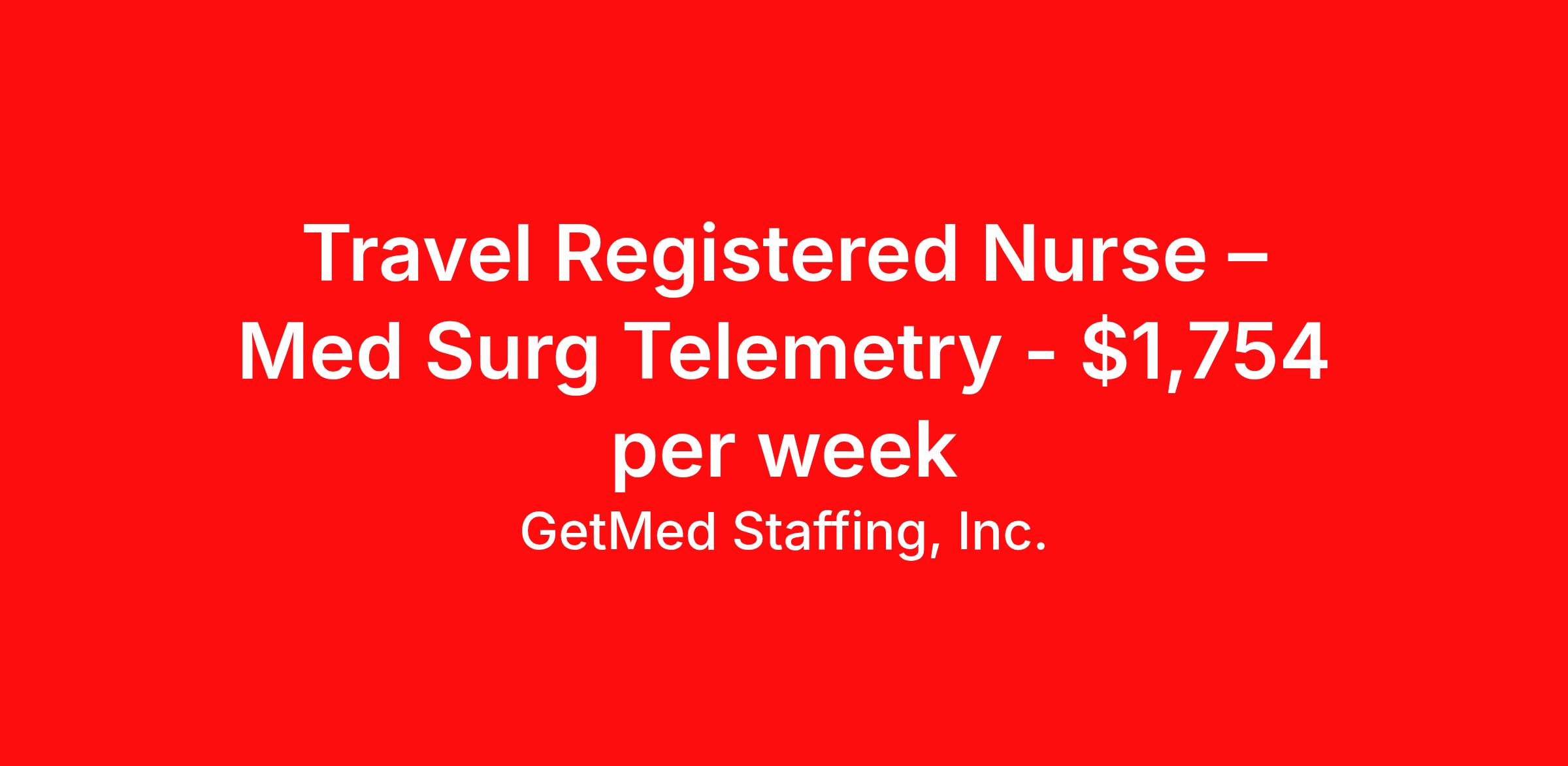 GetMed Staffing, Inc. is seeking a travel nurse RN Telemetry for a travel nursing job in Tuscaloosa, Alabama. Job Description & Requirements Specialty: Telemetry Discipline: RN Start Date: 04/27/2026 Duration: 13 weeks 36 hours per week Shift: 12 hours, days Employment Type: Travel GetMed Staffing is searching for a strong Telemetry RN to assist our traveler-friendly client. A minimum of 1-2 years of experience is required. Traveling with GetMed Staffing offers the unique opportunity to gain diverse experiences, both personally and professionally. Gain experience that matters. GetMed Staffing, Inc. Job ID 36097017. Pay package is based on 12 hour shifts and 36.0 hours per week (subject to confirmation) with tax-free stipend amount to be determined. Posted job title: RN:Telemetry,07:00:00-19:00:00 About GetMed Staffing, Inc. We are a diversity owned company, specializing in healthcare recruiting services. We truly understand how important a healthcare travelers' relationship is with their recruiter, as well as our relationship is with our healthcare facilities. We recognize that the needs of our healthcare travelers can vary, and therefore we provide the personalized touch necessary to ensure a successful travel assignment each and every time. Our healthcare facilities and clients benefit from us putting our healthcare travelers first. GetMed Staffing is excited to be a leader within the industry by focusing on providing healthcare travelers with more choices and possibilities as they plan for their next healthcare travel assignment. Benefits Life insurance Medical benefits Dental benefits Vision benefits 401k retirement plan