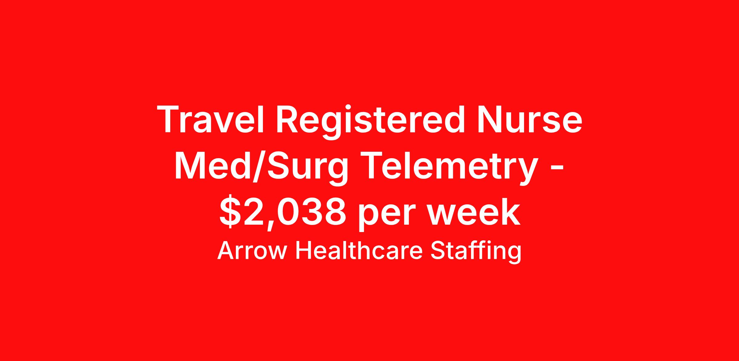 Arrow Healthcare Staffing is seeking a travel nurse RN Med Surg / Telemetry for a travel nursing job in Canton, Ohio. Job Description & Requirements Specialty: Med Surg / Telemetry Discipline: RN Start Date: 04/17/2026 Duration: 13 weeks 36 hours per week Shift: 12 hours, nights Employment Type: Travel Arrow Healthcare Staffing Job ID 17989782. Pay package is based on 12 hour shifts and 36.0 hours per week (subject to confirmation) with tax-free stipend amount to be determined. Posted job title: RN - MedSurg / Tele RN MedSurg / Tele About Arrow Healthcare Staffing Arrow Healthcare Staffing is a Midwest based travel nursing and allied health recruiting firm. We specialize in local/ travel nursing, medical laboratory, pharmacy, radiology/imaging, therapy, and executive/leadership recruitment. We offer direct hospital contracts and all of the top benefits in the marketplace today. Benefits Medical benefits Vision benefits Weekly pay Benefits start day 1 Holiday Pay 401k retirement plan Dental benefits License and certification reimbursement Guaranteed Hours Continuing Education Cancelation protection Mileage reimbursement Referral bonus