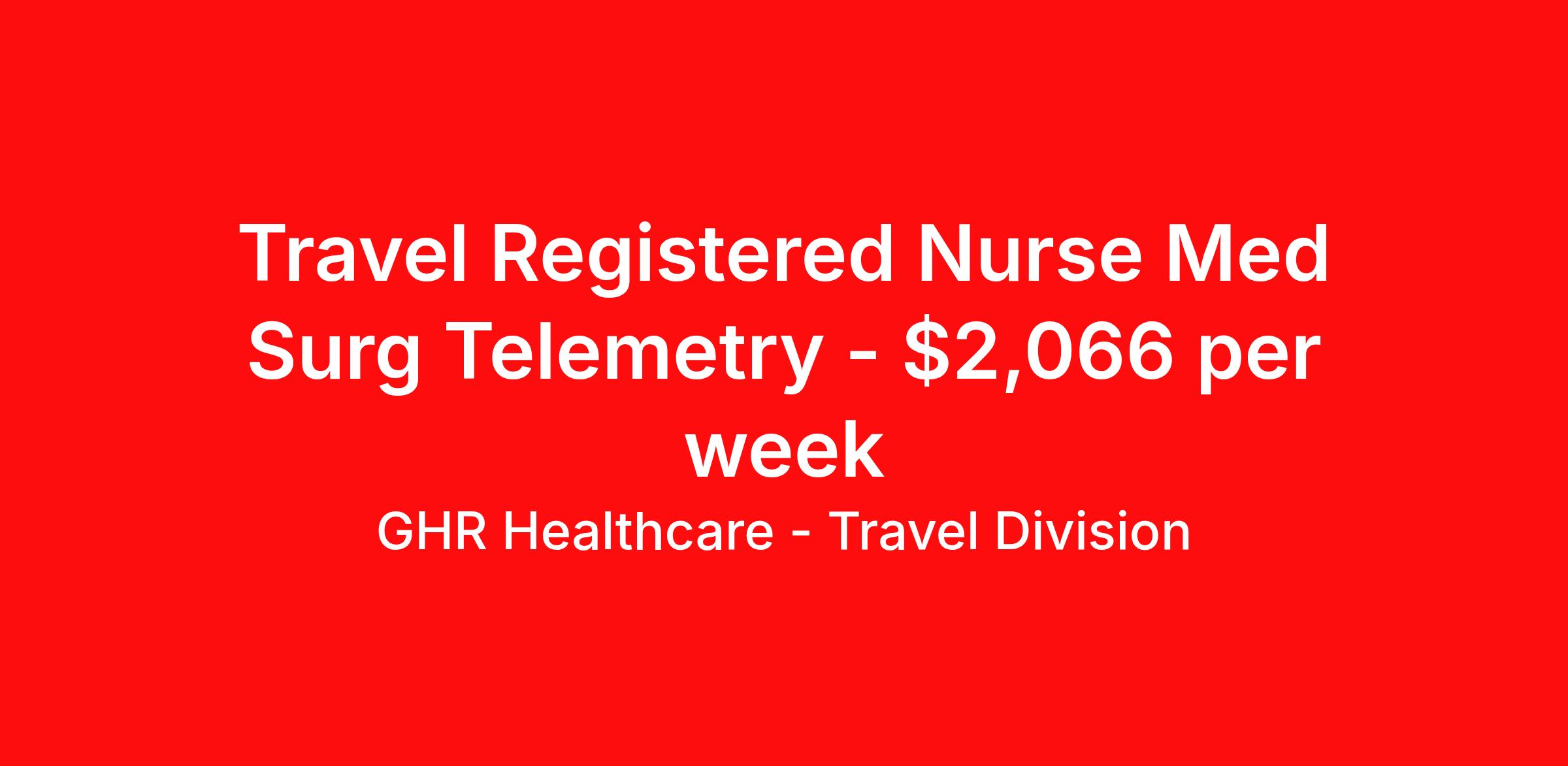 GHR Healthcare - Travel Division is seeking a travel nurse RN Med Surg / Telemetry for a travel nursing job in Tuscaloosa, Alabama. Job Description & Requirements Specialty: Med Surg / Telemetry Discipline: RN Start Date: 04/27/2026 Duration: 13 weeks 36 hours per week Shift: 12 hours Employment Type: Travel GHR Healthcare - Travel Division Job ID 76167936. Pay package is based on 12 hour shifts and 36 hours per week (subject to confirmation) with tax-free stipend amount to be determined. About GHR Healthcare - Travel Division For over 30 years, GHR Healthcare has been the bridge between healthcare professionals and the facilities that need them nationwide. We're committed to uncovering your ideal fit, supported by GHR's dedication to competitive compensation, transparent communication, and a devoted team that genuinely cares about your career journey. You can trust us to stand by your side as your advocate, confidante, and partner in advancing your career. At GHR, care and consideration are at the heart of everything we do. Visit ghrhealthcare.com to learn more.