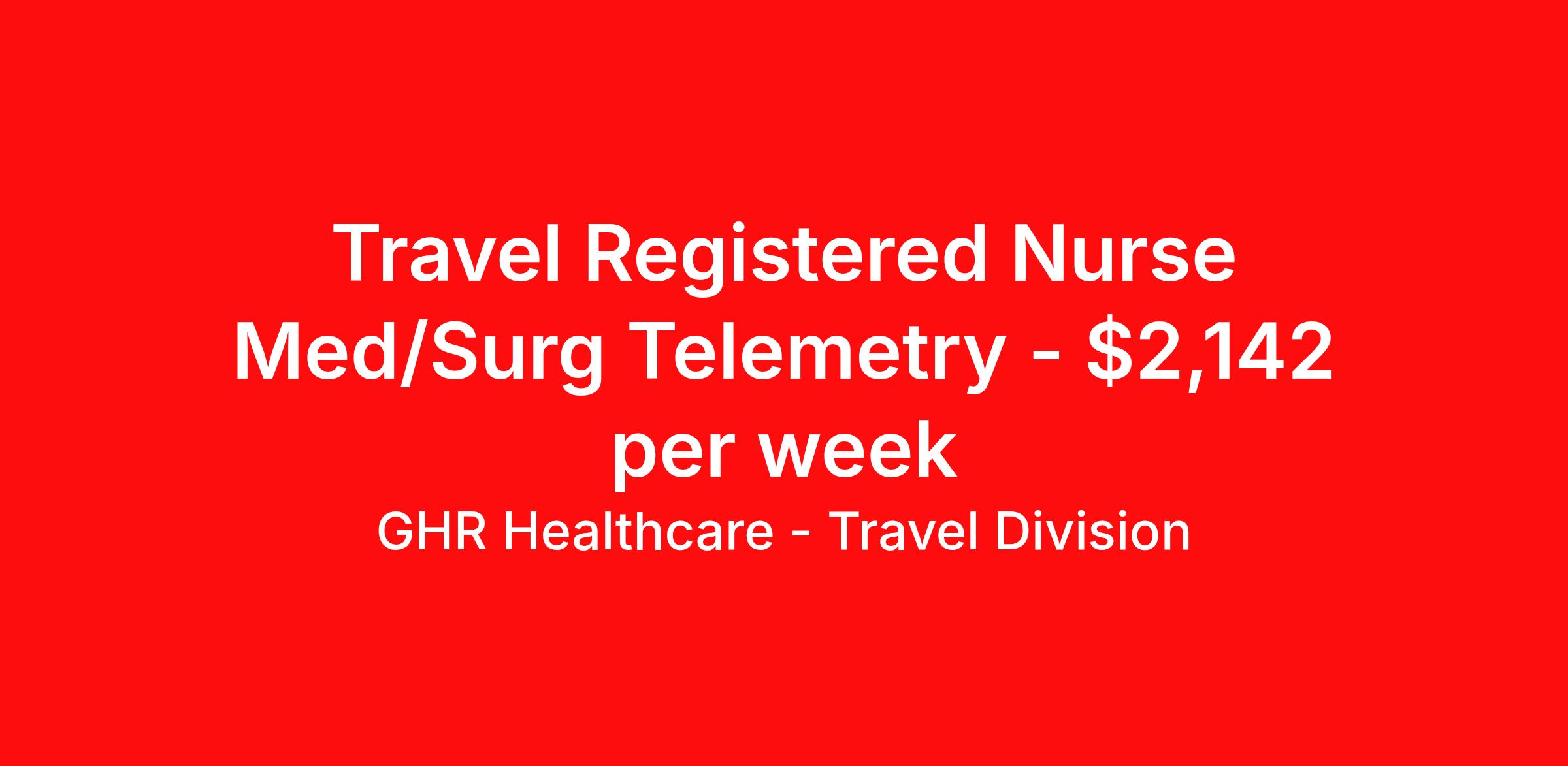 GHR Healthcare - Travel Division is seeking a travel nurse RN Med Surg / Telemetry for a travel nursing job in Canton, Ohio. Job Description & Requirements Specialty: Med Surg / Telemetry Discipline: RN Start Date: 04/17/2026 Duration: 13 weeks 36 hours per week Shift: 12 hours Employment Type: Travel GHR Healthcare - Travel Division Job ID 76427412. Pay package is based on 12 hour shifts and 36 hours per week (subject to confirmation) with tax-free stipend amount to be determined. About GHR Healthcare - Travel Division For over 30 years, GHR Healthcare has been the bridge between healthcare professionals and the facilities that need them nationwide. We're committed to uncovering your ideal fit, supported by GHR's dedication to competitive compensation, transparent communication, and a devoted team that genuinely cares about your career journey. You can trust us to stand by your side as your advocate, confidante, and partner in advancing your career. At GHR, care and consideration are at the heart of everything we do. Visit ghrhealthcare.com to learn more.
