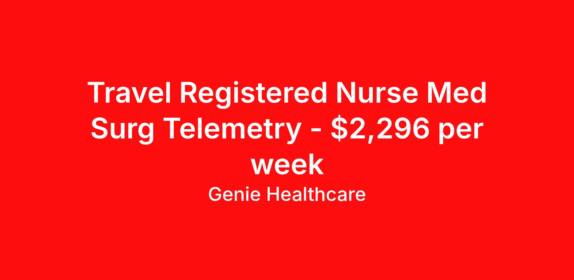 Genie Healthcare is seeking a travel nurse RN Med Surg / Telemetry for a travel nursing job in Crescent City, California. Job Description & Requirements Specialty: Med Surg / Telemetry Discipline: RN Start Date: 04/13/2026 Duration: 13 weeks 36 hours per week Shift: 12 hours, nights Employment Type: Travel Genie Healthcare is looking for a RN to work in Med Surg / Telemetry for a 13 weeks travel assignment located in Crescent City, CA for the Shift (3x12 nights, 19:00:00-07:00:00, 12.00-3). Pay and benefits packages are estimated based on client bill rate at time the job was posted. These rates are subject to change. Exact pay and benefits vary based on several things, including, but not limited to, guaranteed hours, client changes in bill rate, experience, etc. Benefits: Medical Insurance, Dental Insurance, Vision Insurance, 401(k) with company matching (50% up to 6% of what you contribute) Genie Healthcare Job ID 17926459. Pay package is based on 12 hour shifts and 36.0 hours per week (subject to confirmation) with tax-free stipend amount to be determined. Posted job title: RN:Med Surg / Telemetry,19:00:00-07:00:00 About Genie Healthcare Genie Healthcare is one of the fastest growing Nurse Travel Agencies in the USA. Genie serves hundreds of facilities and has over 4000 current travel RN contracts open at any given time. Genie provides travel RN’s flexibility, support, top pay scale, housing and the 1 rated, multi-state health insurance coverage. Genie Healthcare carries with it a commitment to providing a comprehensive level of service and quality care. Growing from a small team of eager recruiters to a company with satisfied clients in nearly every corner of the nation, delivering excellence in patient and customer care is the key to Genie’s success. The management team has 20 years of experience in workforce solutions and staffing in medical and non-medical fields, roles ranging from Clerical job to Cardiologist to software developer to CEO.