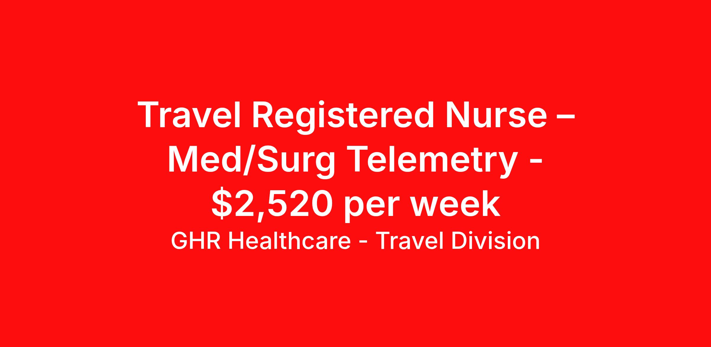 GHR Healthcare - Travel Division is seeking a travel nurse RN Med Surg / Telemetry for a travel nursing job in Plattsburgh, New York. Job Description & Requirements Specialty: Med Surg / Telemetry Discipline: RN Start Date: ASAP Duration: 16 weeks 36 hours per week Shift: 12 hours Employment Type: Travel GHR Healthcare - Travel Division Job ID 73633323. Pay package is based on 12 hour shifts and 36 hours per week (subject to confirmation) with tax-free stipend amount to be determined. About GHR Healthcare - Travel Division For over 30 years, GHR Healthcare has been the bridge between healthcare professionals and the facilities that need them nationwide. We're committed to uncovering your ideal fit, supported by GHR's dedication to competitive compensation, transparent communication, and a devoted team that genuinely cares about your career journey. You can trust us to stand by your side as your advocate, confidante, and partner in advancing your career. At GHR, care and consideration are at the heart of everything we do. Visit ghrhealthcare.com to learn more.
