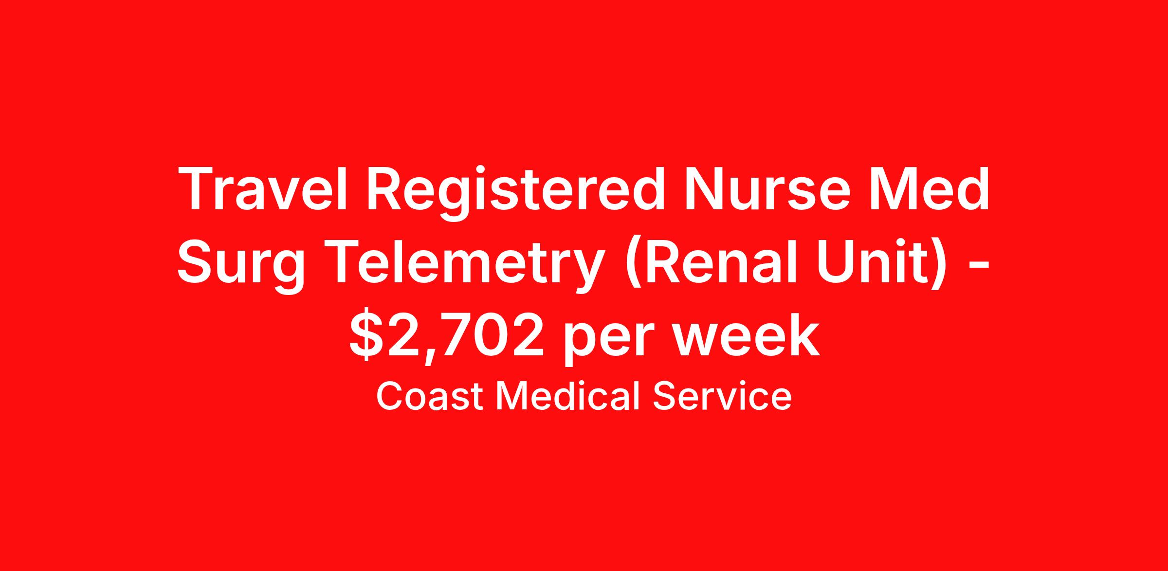 Coast Medical Service is seeking a travel nurse RN Med Surg / Telemetry for a travel nursing job in Tuscaloosa, Alabama. Job Description & Requirements Specialty: Med Surg / Telemetry Discipline: RN Start Date: 04/13/2026 Duration: 13 weeks 48 hours per week Shift: 12 hours, nights Employment Type: Travel Coast Medical Service is a nationwide travel nursing & allied healthcare staffing agency dedicated to providing an elite traveler experience for the experienced or first-time traveler. Coast is featured on Blue Pipes' 2023 Best Travel Agencies and named a 2022 Top Rated Healthcare Staffing Firm & 2023 First Half Top Rated Healthcare Staffing Firm by Great Recruiters. Please note that pay rate may differ for locally based candidates. Please apply here or contact a recruiter directly to learn more about this position & the facility, and/or explore others that may be of interest to you. We look forward to speaking with you! Coast Medical Services Job ID 36189762. Pay package is based on 12 hour shifts and 48.0 hours per week (subject to confirmation) with tax-free stipend amount to be determined. Posted job title: RN:MS/Tele,19:00:00-07:00:00