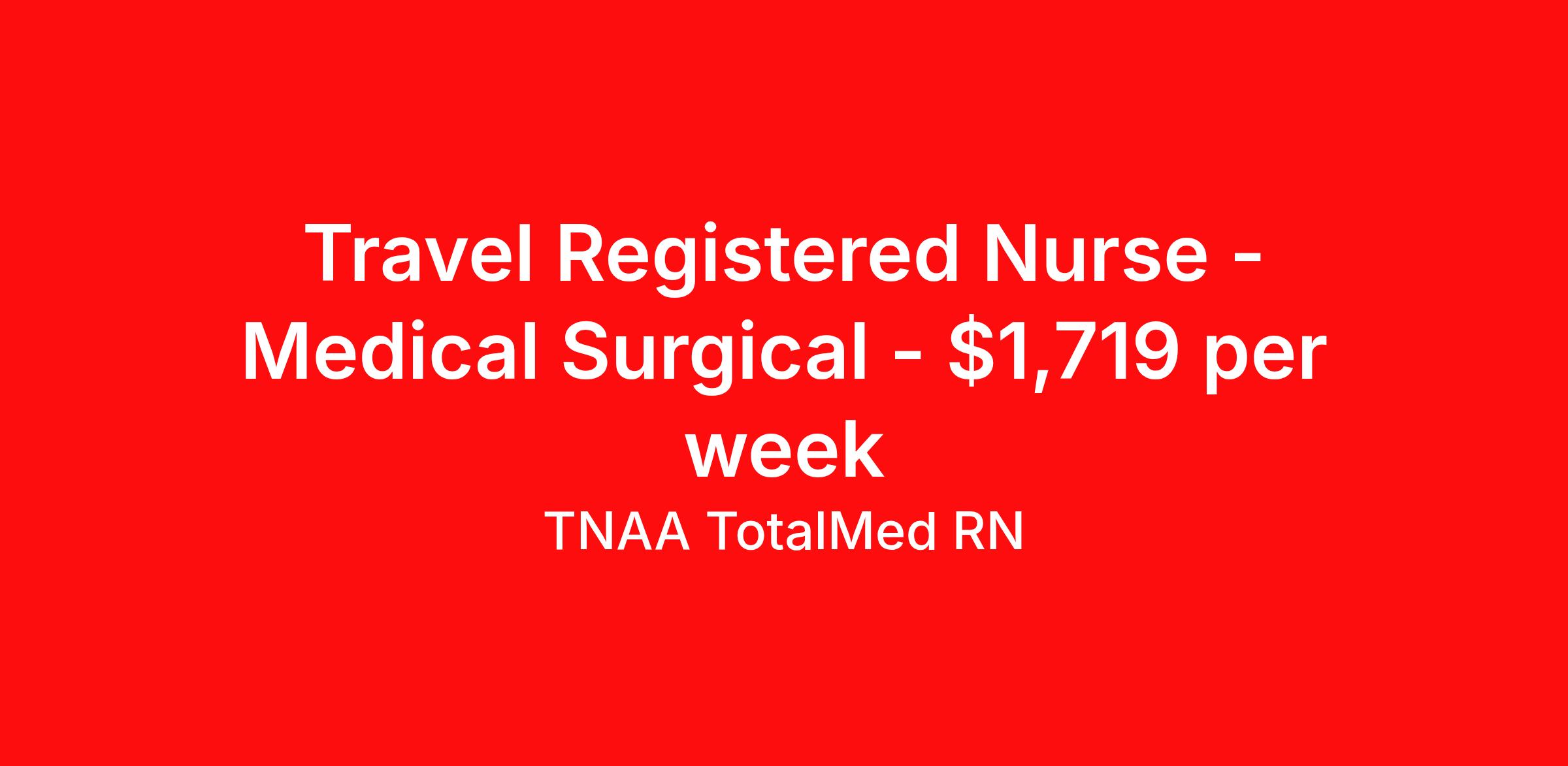 TNAA TotalMed RN is seeking a travel nurse RN Med Surg for a travel nursing job in Sylva, North Carolina. Job Description & Requirements Specialty: Med Surg Discipline: RN Duration: 13 weeks 36 hours per week Shift: 12 hours, nights Employment Type: Travel We're looking for Medical Surgical RNs for an immediate travel nurse opening in Sylva, NC. The right RN should have 1-2 years recent acute care experience. Read below for more requirements. As a MedSurg RN, you will conduct patient assessments and prioritize data collection based on patients' immediate conditions or needs. MedSurg RNs perform ongoing assessments and appropriate treatments as ordered by a physician. Documenting patient findings and providing education and support to patients' families is essential to this travel nurse position. As a Medical Surgical Travel Nurse, you should be prepared to perform the following tasks: Provide bedside care for a variety of patients, including pre- and post-op patients. Prepare, administer and record prescribed medication, reporting any adverse reactions to treatment. Change dressings, insert catheters and start IVs. Prepares equipment and aids physician during examination and treatment of patient. Educates patients on surgical procedures. Participates in discharge planning and initiates patient education plan as prescribed by physician. Medical Surgical Travel Nurses should be able to stand and walk for long periods of time, as well as bend, lean and stoop without difficulty. RNs should be able to easily lift 20 pounds. Moving or lifting of patients may require lifting of up to 50 pounds at times. RNs will work in a fast-paced environment treating patients that may be confused, agitated, and/or uncooperative. Requirements*: BLS, 1.5 Years * Additional certifications may be required before beginning an assignment. TotalMed Travel Job ID 1394000. Pay package is based on 12 hour shifts and 36 hours per week (subject to confirmation) with tax-free stipend amount to be determined. Posted job title: Medical/Surgical - MedSurg RN - Travel Nurse About TNAA TotalMed RN TotalMed is a Top Ten, travel nursing and healthcare staffing agency with the mission of igniting purpose in healthcare. The organization staffs nurses, therapists, pharmacists, and other clinicians of all specialties in all 50 states. They offer local and travel jobs and match caregivers with the right organization to assist both facilities and patients. As an organization, they focus on putting highly-skilled staff into facilities to ensure adequate staffing for a better patient experience. TotalMed specializes in recruiting and placing healthcare professionals in travel, PRN, and permanent positions across the country in Nursing and Allied Health. Throughout 2020, the organization filled roles at even the most short-staffed facilities during the most challenging time in healthcare. By matching the right travel healthcare professional with the right organization, TotalMed continues to offer a lifeline to facilities and their patients. Benefits Weekly pay Guaranteed Hours Continuing Education 401k retirement plan Sick pay Wellness and fitness programs Referral bonus Employee assistance programs Medical benefits Dental benefits Vision benefits Benefits start day 1