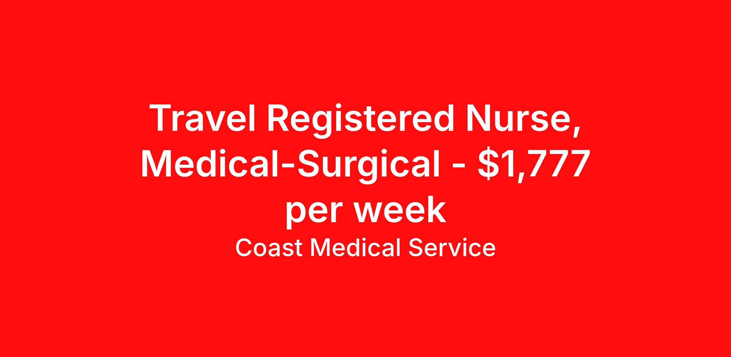 Coast Medical Service is seeking a travel nurse RN Med Surg for a travel nursing job in Springdale, Arkansas. Job Description & Requirements Specialty: Med Surg Discipline: RN Start Date: 03/30/2026 Duration: 13 weeks 36 hours per week Shift: 12 hours, nights Employment Type: Travel Coast Medical Service is a nationwide travel nursing & allied healthcare staffing agency dedicated to providing an elite traveler experience for the experienced or first-time traveler. Coast is featured on Blue Pipes' 2023 Best Travel Agencies and named a 2022 Top Rated Healthcare Staffing Firm & 2023 First Half Top Rated Healthcare Staffing Firm by Great Recruiters. Please note that pay rate may differ for locally based candidates. Please apply here or contact a recruiter directly to learn more about this position & the facility, and/or explore others that may be of interest to you. We look forward to speaking with you! Coast Medical Services Job ID 36060889. Pay package is based on 12 hour shifts and 36.0 hours per week (subject to confirmation) with tax-free stipend amount to be determined. Posted job title: RN:Medical-Surgical,19:00:00-07:30:00