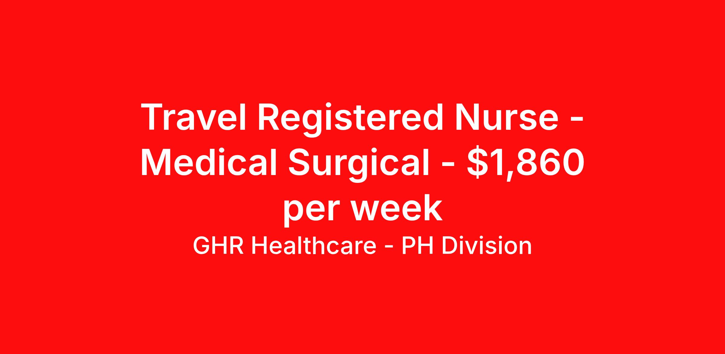 GHR Healthcare - PH Division is seeking a travel nurse RN Med Surg for a travel nursing job in Sylva, North Carolina. Job Description & Requirements Specialty: Med Surg Discipline: RN Start Date: 04/06/2026 Duration: 13 weeks 36 hours per week Shift: 12 hours Employment Type: Travel Travel Med/Surg Registered Nurse (RN) – Sylva, NC | 13-Week Travel Nurse Opportunity Travel Med/Surg RN opportunity in Sylva, NC — 13-week travel nursing job for experienced Medical-Surgical Registered Nurses (RN) seeking a rewarding travel nursing assignment near the Great Smoky Mountains. Job Details Location: Sylva, NC 28779 (Jackson County, Western North Carolina) Travel Nursing Job Type: 13-week travel contract (April 6, 2026 – July 6, 2026) Unit / Setting: Medical-Surgical Unit — 24-bed Med/Surg Shift: 12-hour days (07:00–19:00) Hours per Week: 36 Patient Ratio: 1:6 (Medical-Surgical nurse staffing) Weekend Schedule: Varies (every other or every 3rd weekend) Employment Type: Travel Nurse / Travel RN Estimated Weekly Pay: $1,710 - $1,800 per week Job Requirements Active RN license (state of practice) ACLS and BLS certifications required Minimum 2 years of recent Med/Surg experience Medical-Surgical competencies and clinical proficiency Ability to float based on unit rotation Responsibilities Deliver high-quality patient care as a Med/Surg Registered Nurse for adult and geriatric patients Assess, plan, implement, and evaluate nursing care in a 24-bed Med/Surg unit Collaborate with interdisciplinary teams to ensure optimal patient outcomes Document patient information accurately using Paragon EHR (electronic health record) Maintain a safe, therapeutic environment for patients and staff Participate in unit rotations and float to other areas as needed Why Join This Travel Nursing Job Experience the charm of Sylva, NC — a picturesque small town at the foot of the Great Smoky Mountains. Enjoy vibrant Main Street dining, galleries, bookshops, local breweries, and outdoor recreation including the Western North Carolina Fly Fishing Trail. Join a supportive healthcare team that values world-class patient care and professional growth for travel nurses and Med/Surg RNs. Apply now to be considered for this Med/Surg travel nursing opportunity in Sylva, North Carolina. Join our healthcare team today and advance your career as a Travel Nurse! Benefits 401K with Matching, Healthcare, Dental and Vision Equal Opportunity We are an equal opportunity employer and value diversity across our organization. We do not discriminate on the basis of race, religion, color, national origin, gender, sexual orientation, age, marital status, veteran status, or disability status. Planet Healthcare Job ID 467799. Pay package is based on 12 hour shifts and 36 hours per week (subject to confirmation) with tax-free stipend amount to be determined. Posted job title: Med/Surg About GHR Healthcare - PH Division For over 30 years, GHR Healthcare has been the bridge between healthcare professionals and the facilities that need them nationwide. We're committed to uncovering your ideal fit, supported by GHR's dedication to competitive compensation, transparent communication, and a devoted team that genuinely cares about your career journey. You can trust us to stand by your side as your advocate, confidante, and partner in advancing your career. At GHR, care and consideration are at the heart of everything we do. Visit ghrhealthcare.com to learn more.