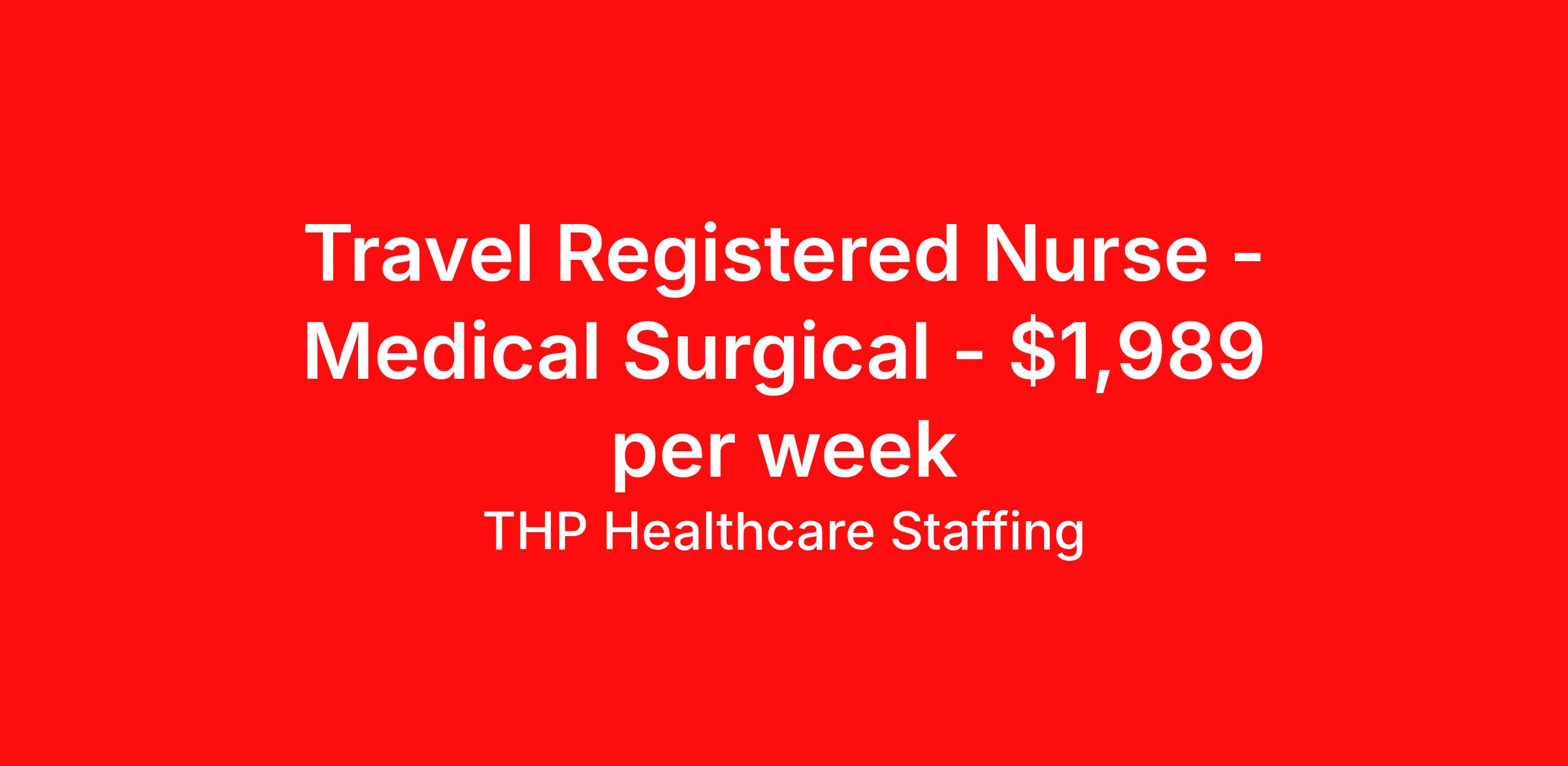 THP Healthcare Staffing is seeking a travel nurse RN Med Surg for a travel nursing job in Sylva, North Carolina. Job Description & Requirements Specialty: Med Surg Discipline: RN Start Date: ASAP Duration: 13 weeks 36 hours per week Shift: 12 hours, nights Employment Type: Travel Our Client is currently seeking RN - MedSurg positions in Sylva, NC for a 3x12 Nights shift. You must have current State Licensure and at least 1 year of recent experience. Requirements Current Resume State Licensure Current BLS and/or ACLS and/or Specialty Certifications 2 Current Clinical References Physical (Within 12 Months) TB Skin Test (Within 12 Months) Titers - MMR/Hep B/Varicella Respiratory Fit Test (Within 12 Months) Current - Tdap/Flu Vaccinations Must be able to pass pre-employment, background and urine drug screening Compensation and Benefits Compettive Pay Packages Health Benefit Package Travel pay - 1st pay check Extending Contract Bonus Refer a friend and earn extra cash! At THP Healthcare Staffing, we take care of you - work with us, not for us! THP Healthcare Staffing Job ID 17921993. Pay package is based on 12 hour shifts and 36.0 hours per week (subject to confirmation) with tax-free stipend amount to be determined. Posted job title: RN:MedSurg,19:00:00-07:00:00 About THP Healthcare Staffing At THP Staffing, we specialize in connecting healthcare facilities with highly skilled travel nurses and allied health professionals who bring exceptional care and expertise wherever they go. Our mission is to ensure that every healthcare provider has access to top nursing talent, regardless of location, to deliver superior patient outcomes. Benefits Weekly pay Life insurance Pet insurance License and certification reimbursement Medical benefits Employee assistance programs Referral bonus Vision benefits Holiday Pay Health savings account