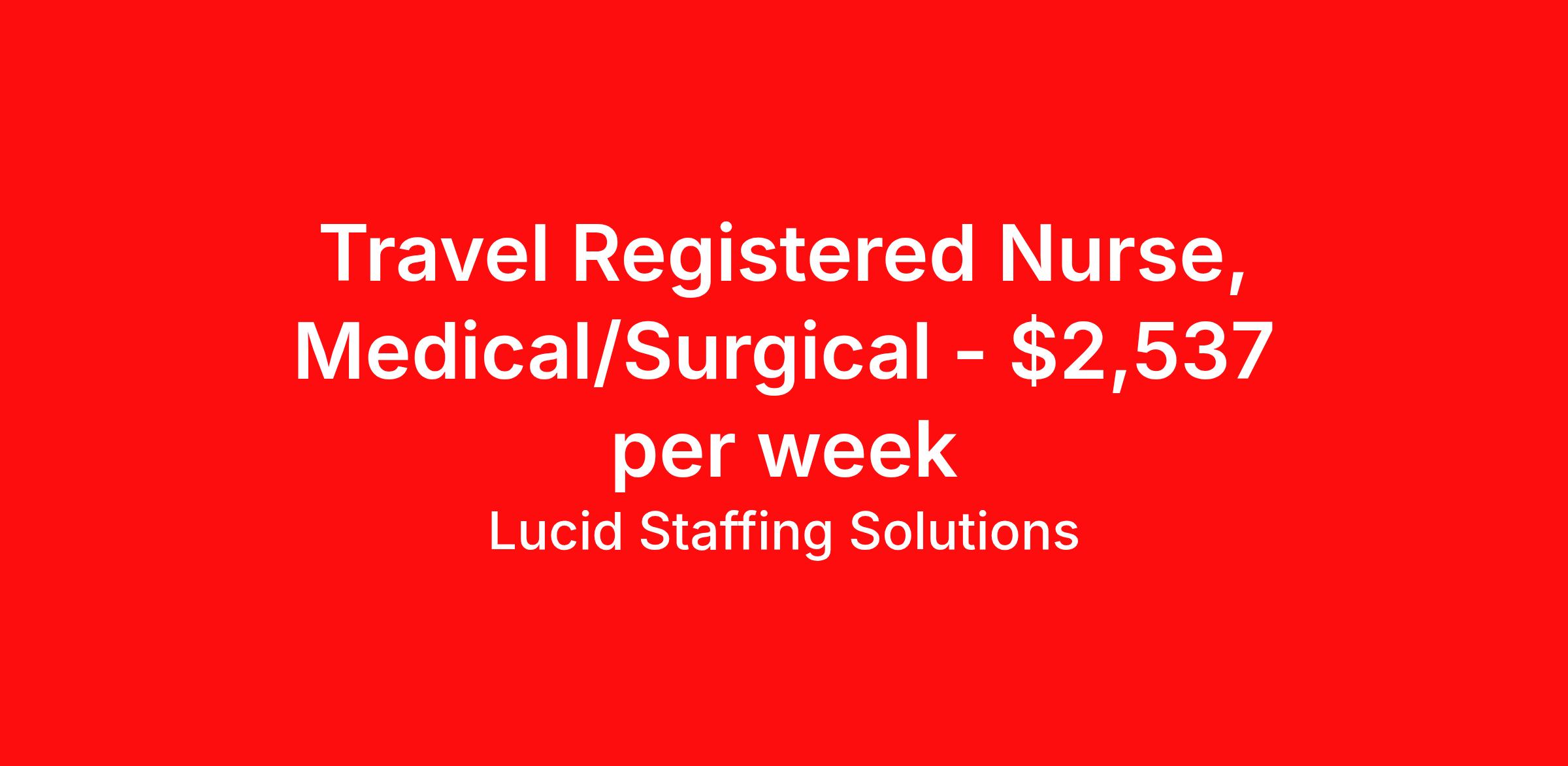Lucid Staffing Solutions is seeking a travel nurse RN Med Surg for a travel nursing job in Marquette, Michigan. Job Description & Requirements Specialty: Med Surg Discipline: RN Duration: 13 weeks 36 hours per week Shift: 12 hours, nights Employment Type: Travel Job Description Position: Travel Registered Nurse (RN) with experience in MS Location: Marquette, Michigan Shift: 12hr Night Weekly Gross: $2536.96 Lucid Staffing Solutions was created by former healthcare workers who lived the short staffing, the chaotic workflows, and the nonstop pressure that comes with patient care. We built an agency powered by real clinical experience, kept simple and supportive, so you never have to guess whether the people guiding you actually know what they’re talking about. Minimum Requirements: Active license as a Registered Nurse (RN) Licensed in Michigan (If applicable) or compact eligible Two years of recent MS experience Active BLS Why Lucid Works for Travelers Paid Weekly: Stipends pushed to GSA limits whenever possible $500 Travel Reimbursement: Paid at the start of each assignment Clinician-Led Team: Recruiters and Account Managers with real clinical experience In-House Compliance: fast updates, real communication, and none of the delays that come with outsourced vendors. Health Coverage Options: Multiple medical plans plus dental, vision, and workers compensation 401(k) Match: 4 percent match after 6 months License & Certification Reimbursement: We help cover the cost of staying compliant Liability Insurance: Included automatically Referral Bonuses: $500 per referral, $750 after five referrals Ready to start your journey? Apply today to connect with a Clinician-Recruiter! Lucid Staffing Solutions Job ID 37724. Pay package is based on 12 hour shifts and 36 hours per week (subject to confirmation) with tax-free stipend amount to be determined. Posted job title: MS About Lucid Staffing Solutions Clinician Owned & Operated At Lucid Staffing Solutions, we do things differently—because we’ve been in your shoes. Founded by actual healthcare professionals, Lucid was built to fix the issues we experienced as travelers. We know what makes a great assignment: competitive pay, seamless onboarding, honest recruiters, and most importantly—working with a team that truly sees and supports you. Our entire team is made up of former clinicians who understand the demands of the job and what travelers truly need to succeed. We offer some of the highest paying allied health and nursing contracts across the country, along with some amazing benefits & perks. Whether you're chasing freedom, flexible schedules, bigger paychecks, or your next adventure, Lucid helps you get there—with real support, real respect , and real healthcare experts. Benefits Dental benefits Medical benefits Vision benefits