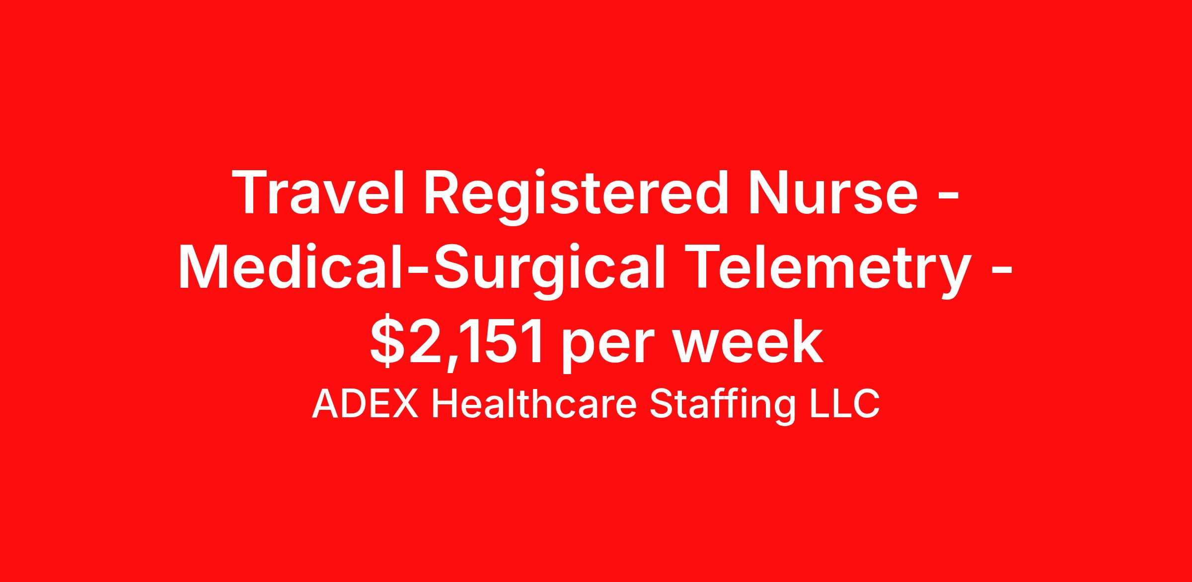 ADEX Healthcare Staffing LLC is seeking a travel nurse RN Telemetry for a travel nursing job in Lima, Ohio. Job Description & Requirements Specialty: Telemetry Discipline: RN Start Date: 04/09/2026 Duration: 13 weeks 36 hours per week Shift: 12 hours, nights Employment Type: Travel RN Position Job Notes: Travel or Local Registered Nurse needed for ASAP start. A minimum of 2 years of recent hospital bedside experience is required. Candidates must be able to start within 5 weeks. Opportunity for extension upon successful completion of the initial assignment. $750 referral bonus available. Opportunity: RN - Med Surg Tele Job Details: • Assume responsibility and accountability for care of assigned patients during shift • Assess, plan, implement and evaluate patient care using age-specific criteria • Make clinical judgments based on scientific knowledge and clinical skills • Assist in planning, directing, and teaching non-RN staff including LPN/PCT and Unit Secretaries • Work every other weekend schedule • No on-call responsibilities • Must commit to reporting for all assigned shifts and be on time • 2 years of Med Surg experience required • Required certifications: BLS, ACLS (AHA), NIHSS (must be active at time of submission) • Must be competent with cardiac medications including Cardizem, Amiodarone, Nitro, Heparin, Cardine, Dobutamine, Lasix, Bumex with knowledge of titration and application • Must be competent in telemetry and possess knowledge of heart rhythms • Must possess critical thinking skills and ability to recognize changes in patient status and intervene • Must have knowledge of signs/symptoms of stroke and ability to recognize status changes and intervene • Strong communication skills required • Ohio nursing license required • Skills checklist current within one year pertinent to specialty required Facility: This healthcare facility operates within a comprehensive health system providing medical surgical telemetry services. The organization maintains high standards for patient care and emphasizes mission-driven healthcare delivery. The facility supports continuing education and professional development while maintaining evidence-based nursing practices and age-specific patient care protocols. Location: Lima, OH Lima offers a welcoming small-city atmosphere in west-central Ohio with affordable living costs and a strong sense of community. The area provides easy access to larger metropolitan areas while maintaining a comfortable pace of life, making it an attractive location for healthcare professionals seeking career growth opportunities. Adex Job ID 66059. Pay package is based on 12 hour shifts and 36 hours per week (subject to confirmation) with tax-free stipend amount to be determined. About ADEX Healthcare Staffing LLC ADEX has been placing healthcare professionals across the US since 2004. Originally founded in Atlanta, GA, the company's headquarters are now located in Tampa, FL. JCAHO certified since 2009. Benefits Referral bonus