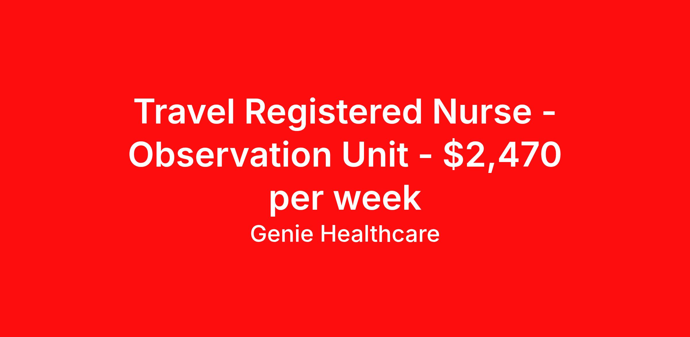 Genie Healthcare is seeking a travel nurse RN DOU - Direct Observation Unit for a travel nursing job in Urbana, Illinois. Job Description & Requirements Specialty: DOU - Direct Observation Unit Discipline: RN Start Date: 04/06/2026 Duration: 13 weeks 36 hours per week Shift: 12 hours, nights Employment Type: Travel Genie Healthcare is looking for a RN to work in Observation Unit for a 12.71 weeks travel assignment located in Urbana, IL for the Shift (3x12 nights, 19:00:00-07:00:00, 12.00-3). Pay and benefits packages are estimated based on client bill rate at time the job was posted. These rates are subject to change. Exact pay and benefits vary based on several things, including, but not limited to, guaranteed hours, client changes in bill rate, experience, etc. Benefits: Medical Insurance, Dental Insurance, Vision Insurance, 401(k) with company matching (50% up to 6% of what you contribute) Genie Healthcare Job ID 17981381. Pay package is based on 12 hour shifts and 36.0 hours per week (subject to confirmation) with tax-free stipend amount to be determined. Posted job title: RN:Observation Unit,19:00:00-07:00:00 About Genie Healthcare Genie Healthcare is one of the fastest growing Nurse Travel Agencies in the USA. Genie serves hundreds of facilities and has over 4000 current travel RN contracts open at any given time. Genie provides travel RN’s flexibility, support, top pay scale, housing and the 1 rated, multi-state health insurance coverage. Genie Healthcare carries with it a commitment to providing a comprehensive level of service and quality care. Growing from a small team of eager recruiters to a company with satisfied clients in nearly every corner of the nation, delivering excellence in patient and customer care is the key to Genie’s success. The management team has 20 years of experience in workforce solutions and staffing in medical and non-medical fields, roles ranging from Clerical job to Cardiologist to software developer to CEO.