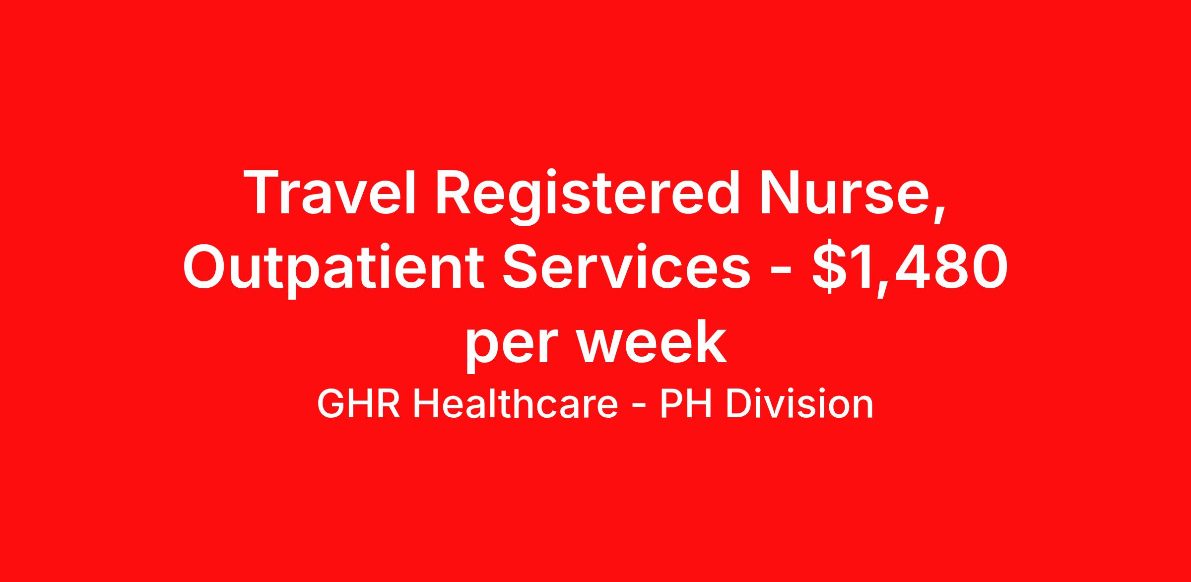 GHR Healthcare - PH Division is seeking a travel nurse RN Outpatient Ambulatory Care for a travel nursing job in Alpharetta, Georgia. Job Description & Requirements Specialty: Ambulatory Care Discipline: RN Start Date: 04/13/2026 Duration: 11 weeks 36 hours per week Shift: 12 hours Employment Type: Travel Planet Healthcare Job ID 76262555. Pay package is based on 12 hour shifts and 36 hours per week (subject to confirmation) with tax-free stipend amount to be determined. About GHR Healthcare - PH Division For over 30 years, GHR Healthcare has been the bridge between healthcare professionals and the facilities that need them nationwide. We're committed to uncovering your ideal fit, supported by GHR's dedication to competitive compensation, transparent communication, and a devoted team that genuinely cares about your career journey. You can trust us to stand by your side as your advocate, confidante, and partner in advancing your career. At GHR, care and consideration are at the heart of everything we do. Visit ghrhealthcare.com to learn more.