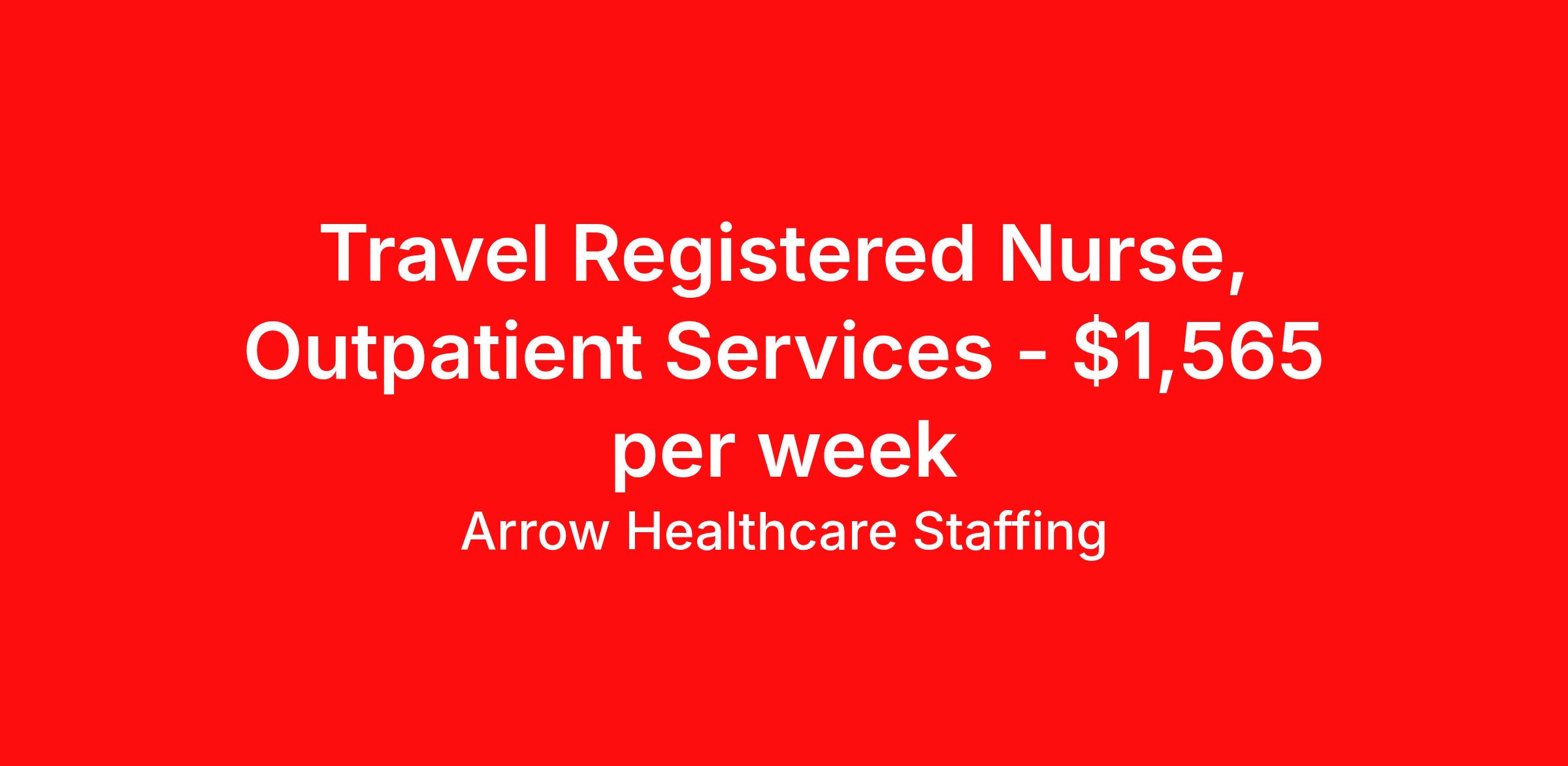 Arrow Healthcare Staffing is seeking a travel nurse RN Clinic Ambulatory Care for a travel nursing job in Alpharetta, Georgia. Job Description & Requirements Specialty: Ambulatory Care Discipline: RN Start Date: 04/13/2026 Duration: 12 weeks 40 hours per week Shift: 8 hours, days Employment Type: Travel Arrow Healthcare Staffing Job ID 17950148. Pay package is based on 8 hour shifts and 40.0 hours per week (subject to confirmation) with tax-free stipend amount to be determined. Posted job title: RN - Outpatient Clinic RN Outpatient Clinic About Arrow Healthcare Staffing Arrow Healthcare Staffing is a Midwest based travel nursing and allied health recruiting firm. We specialize in local/ travel nursing, medical laboratory, pharmacy, radiology/imaging, therapy, and executive/leadership recruitment. We offer direct hospital contracts and all of the top benefits in the marketplace today. Benefits Medical benefits Vision benefits Weekly pay Benefits start day 1 Holiday Pay 401k retirement plan Dental benefits License and certification reimbursement Guaranteed Hours Continuing Education Cancelation protection Mileage reimbursement Referral bonus