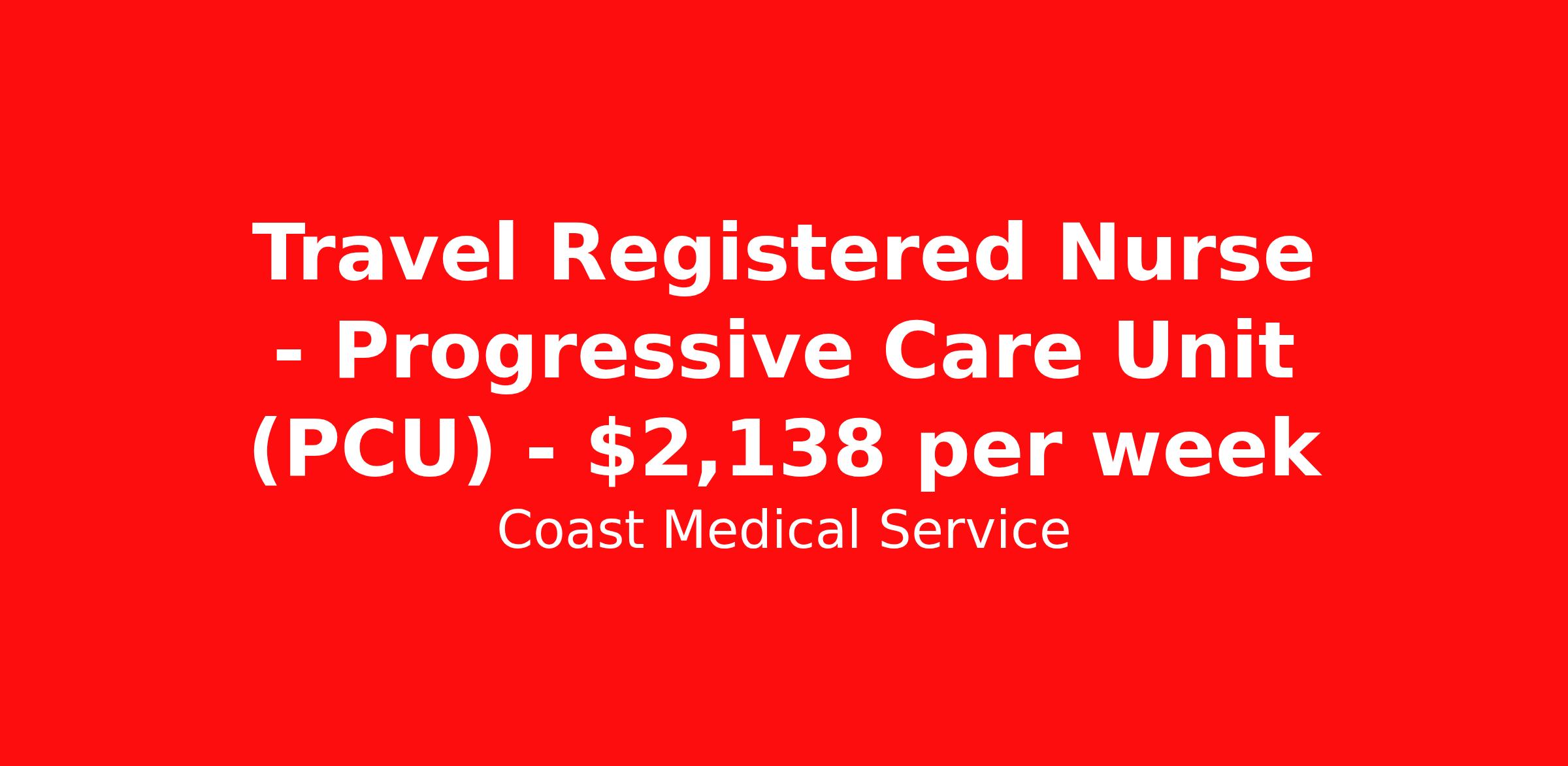 Coast Medical Service is seeking a travel nurse RN PCU - Progressive Care Unit for a travel nursing job in Asheville, North Carolina. Job Description & Requirements Specialty: PCU - Progressive Care Unit Discipline: RN Start Date: 03/30/2026 Duration: 13 weeks 36 hours per week Shift: 12 hours, nights Employment Type: Travel Coast Medical Service is a nationwide travel nursing & allied healthcare staffing agency dedicated to providing an elite traveler experience for the experienced or first-time traveler. Coast is featured on Blue Pipes' 2023 Best Travel Agencies and named a 2022 Top Rated Healthcare Staffing Firm & 2023 First Half Top Rated Healthcare Staffing Firm by Great Recruiters. Please note that pay rate may differ for locally based candidates. Please apply here or contact a recruiter directly to learn more about this position & the facility, and/or explore others that may be of interest to you. We look forward to speaking with you! Coast Medical Services Job ID 36077394. Pay package is based on 12 hour shifts and 36.0 hours per week (subject to confirmation) with tax-free stipend amount to be determined. Posted job title: RN:Stepdown (PCU),19:00:00-07:30:00