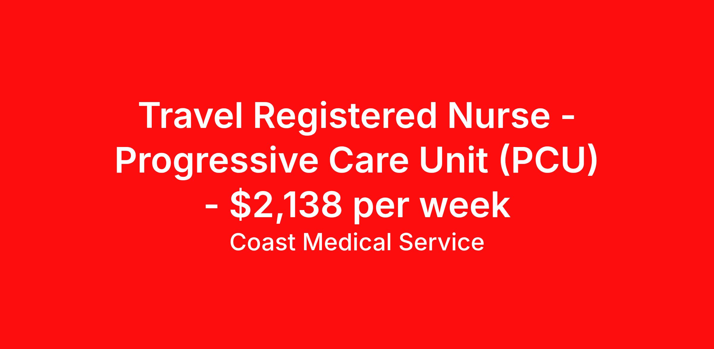 Coast Medical Service is seeking a travel nurse RN PCU - Progressive Care Unit for a travel nursing job in Asheville, North Carolina. Job Description & Requirements Specialty: PCU - Progressive Care Unit Discipline: RN Start Date: 03/30/2026 Duration: 13 weeks 36 hours per week Shift: 12 hours, nights Employment Type: Travel Coast Medical Service is a nationwide travel nursing & allied healthcare staffing agency dedicated to providing an elite traveler experience for the experienced or first-time traveler. Coast is featured on Blue Pipes' 2023 Best Travel Agencies and named a 2022 Top Rated Healthcare Staffing Firm & 2023 First Half Top Rated Healthcare Staffing Firm by Great Recruiters. Please note that pay rate may differ for locally based candidates. Please apply here or contact a recruiter directly to learn more about this position & the facility, and/or explore others that may be of interest to you. We look forward to speaking with you! Coast Medical Services Job ID 36077394. Pay package is based on 12 hour shifts and 36.0 hours per week (subject to confirmation) with tax-free stipend amount to be determined. Posted job title: RN:Stepdown (PCU),19:00:00-07:30:00