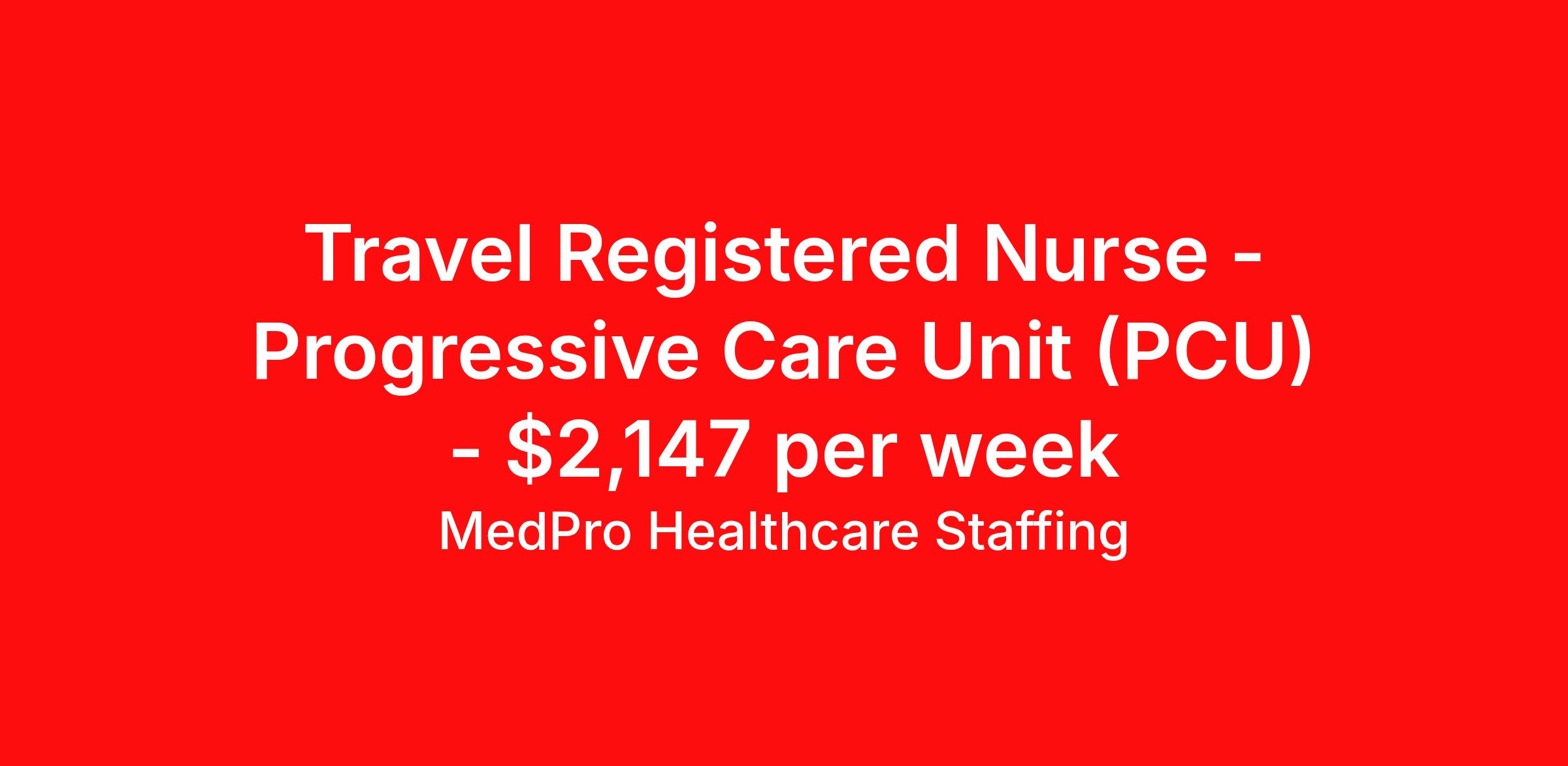 MedPro Healthcare Staffing is seeking a travel nurse RN PCU - Progressive Care Unit for a travel nursing job in Louisville, Kentucky. Job Description & Requirements Specialty: PCU - Progressive Care Unit Discipline: RN Start Date: 04/19/2026 Duration: 13 weeks 36 hours per week Shift: 12 hours, nights Employment Type: Travel MedPro Healthcare Staffing , a Joint Commission-certified staffing agency, is seeking a quality PCU/Step-down Nurse for a travel assignment with one of our top healthcare clients. Requirements Active RN License Degree from accredited nursing program BLS & ACLS Certifications Eighteen months of recent experience in an Acute Care PCU/Step-down setting Other requirements to be determined by our client facility Benefits Weekly pay and direct deposit Full coverage of all credentialing fees Private housing or housing allowance Group Health insurance for you and your family Company-paid life and disability insurance Travel reimbursement 401(k) matching Unlimited Referral Bonuses up to $1,000 Duties Responsibilities Progressive Care Nurses (PCU) care for patients requiring close monitoring and frequent assessment, but who aren't unstable enough to need ICU care. PCU nurses monitor cardiac and other critical vital signs and detect any changes, thereby enabling intervention of life-threatening or emergency situations. Many PCU patients receive complex medications that may require titration based on the patient’s vital signs The PCU nurse is sometimes also called a step-down nurse and the PCU is also known as cardiac step-down, medical step-down, neuro step-down, surgical step-down and ER holding. Monitor and assess patients who aren't unstable enough to need ICU care. Utilize computer equipment to monitor cardiac and other vital information and detect any changes, thereby enabling intervention of life-threatening or emergency situations. About Agency MedPro Healthcare Staffing is a Joint Commission certified provider of contract staffing services. Since 1983, we have placed nursing and allied travelers in top healthcare facilities nationwide. Join us today for your very own MedPro Experience®. If qualified and interested, please call for immediate consideration. MedPro Staffing is an Equal Opportunity Employer. All applicants will be considered for employment without attention to race, color, religion, national origin, age, sex, disability, marital status or veteran status. Key Words: PCU Nurse, RN-Progressive Care, Telemetry Nursing positions, Step-down, Stepdown, Travel Nurse, Contract Nurse, Agency Nurse, EKG, Tele, Telemetry Contracts, Registered Nurse, Telemetry Nurse, Tele Nurse, RN, Registered Nurse, Telemetry Nurse, RN-Tele, Travel Nursing *Weekly payment estimates are intended for informational purposes only and include a gross estimate of hourly wages and reimbursements for meal, incidental, and housing expenses. Your recruiter will confirm your eligibility and provide additional details. MedPro Job ID a0Fcx00000GwvWAEAZ. Pay package is based on 12 hour shifts and 36 hours per week (subject to confirmation) with tax-free stipend amount to be determined. Posted job title: PCU/Step-down Nurse Nursing: PCU. About MedPro Healthcare Staffing At MedPro Healthcare Staffing , we believe no one cares more for caregivers than we do. Our mission is simple: you focus on your patients, and we’ll take care of the rest. As a Joint Commission-certified leader in temporary and contract healthcare staffing since 1983, MedPro has proudly connected nursing and allied travelers with top healthcare facilities across the nation. With thousands of job opportunities available nationwide, we make it easy to find assignments that align with your goals and lifestyle. Our on-staff clinical support team—alongside a compassionate group of experienced recruiters—provides hands-on guidance every step of the way. From Day 1 medical benefits and a 401(k) plan to personalized career support, we’re committed to ensuring every professional we serve feels valued, cared for, and empowered to succeed. Guided by a CEO who is a Registered Nurse, MedPro is built on a foundation of clinical insight and genuine compassion for the caregiving community. Through The MedPro Experience® , we deliver travel assignments that are rewarding, memorable, and designed to help you DREAM big, EXPLORE often, and ACHIEVE greatness. Benefits Day 1 medical, dental, and vision benefits for you and your family Weekly pay and direct deposit Unlimited Referral Bonuses starting at $500 On Staff Clinical Support Team Access to nationwide travel assignments MPX Mobile app -24/7 real-time access to jobs, credentials, assignment details, and more Full coverage of all credentialing fees Private housing or housing allowance Tax Free Per Diems, Housing Stipends and Travel Reimbursements Company-paid life and disability insurance Travel reimbursement 401(k) matching Benefits Weekly pay Referral bonus Employee assistance programs
