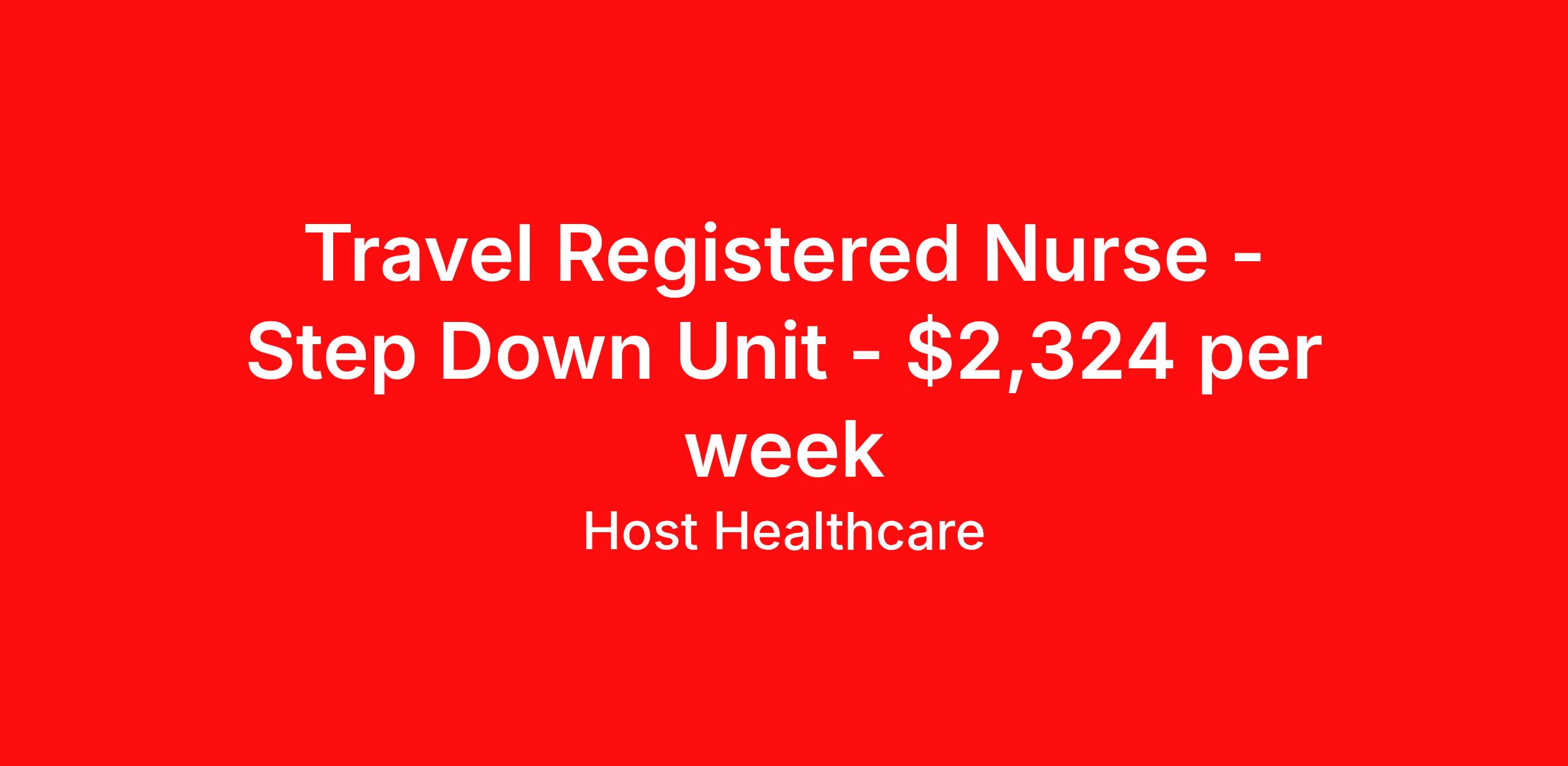 Host Healthcare is seeking a travel nurse RN PCU - Progressive Care Unit for a travel nursing job in Elmira, New York. Job Description & Requirements Specialty: PCU - Progressive Care Unit Discipline: RN Start Date: 04/12/2026 Duration: 13 weeks 36 hours per week Shift: 12 hours, nights Employment Type: Travel Host Healthcare Job ID a1fVX000002mDwHYAU. Pay package is based on 12 hour shifts and 36 hours per week (subject to confirmation) with tax-free stipend amount to be determined. Posted job title: RN - PCU About Host Healthcare At Host Healthcare, we provide a truly comfortable experience as you explore your travel nursing, therapy, or allied career. We make your travel healthcare journey easy by taking care of all the details, so you don’t have to. We are on a mission to help others live better and we do this by helping the healers of the world be as comfortable as possible. With access to tens of thousands of travel nursing, therapy, and allied jobs in all 50 states, our responsive and friendly recruiters find your dream position based on what’s important to you. During your assignment, get access to premium benefits, including Day 1 medical that continues up to 30 days between assignments, 401K matching, travel reimbursements, dedicated housing support, and more. We also offer 24/7 support from our team and access to our on-staff clinicians so you can feel comfortable and confident throughout your entire assignment. Travel comfortably with Host Healthcare. Benefits Referral bonus School loan reimbursement Vision benefits Wellness and fitness programs Company provided housing options License and certification reimbursement Life insurance Medical benefits Mileage reimbursement Pet insurance Discount program Employee assistance programs Guaranteed Hours Health savings account Holiday Pay 401k retirement plan Continuing Education Dental benefits