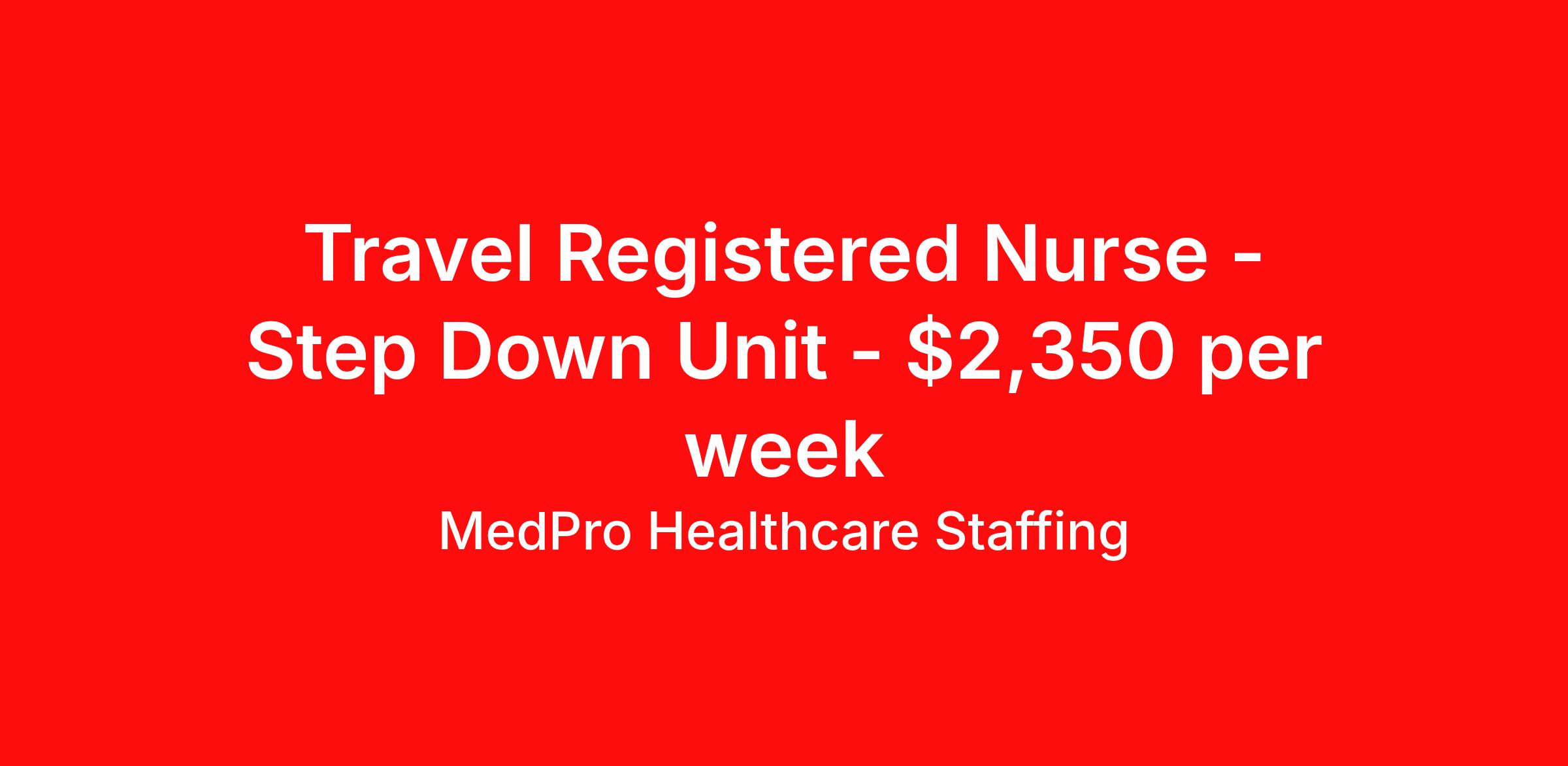 MedPro Healthcare Staffing is seeking a travel nurse RN PCU - Progressive Care Unit for a travel nursing job in Elmira, New York. Job Description & Requirements Specialty: PCU - Progressive Care Unit Discipline: RN Start Date: 04/12/2026 Duration: 13 weeks 36 hours per week Shift: 12 hours, nights Employment Type: Travel MedPro Healthcare Staffing , a Joint Commission-certified staffing agency, is seeking a quality Step Down Registered Nurse for a travel assignment with one of our top healthcare clients. Requirements Active RN License. Degree from accredited nursing program. BLS Certifications. Eighteen months of recent experience in an Acute Care PACU setting. Other requirements to be determined by our client facility Benefits Weekly pay and direct deposit Full coverage of all credentialing fees Private housing or housing allowance Group Health insurance for you and your family Company-paid life and disability insurance Travel reimbursement 401(k) matching Unlimited Referral Bonuses up to $1,000 Duties Responsibilities Assesses patient needs, signs and symptoms indicating physiologic and psychosocial changes in the patient's condition Utilizes the nursing process to assess, plan, implement and evaluate patient care. Collects, analyzes, and interprets data and information from health care members and documents actual and/or potential nursing diagnoses. Documents the patient's plan of care using identified nursing diagnoses, expected patient outcomes, and selected nursing interventions. Initiates and evaluates patient and/or family education. Revises and documents the plan of care according to evaluation, changes in medical plan of care, and effective/ineffective nursing interventions. About Agency MedPro Healthcare Staffing is a Joint Commission certified provider of contract staffing services. Since 1983, we have placed nursing and allied travelers in top healthcare facilities nationwide. Join us today for your very own MedPro Experience®. If qualified and interested, please call for immediate consideration. MedPro Staffing is an Equal Opportunity Employer. All applicants will be considered for employment without attention to race, color, religion, national origin, age, sex, disability, marital status or veteran status. Key Words: Registered Nurse, RN, Step-Down, Contract Nurse, Travel Nurse, Agency RN, Travel RN, Per Diem, Nursing, Contract, Travel Nursing *Weekly payment estimates are intended for informational purposes only and include a gross estimate of hourly wages and reimbursements for meal, incidental, and housing expenses. Your recruiter will confirm your eligibility and provide additional details. MedPro Job ID a0Fcx00000EGO6LEAX. Pay package is based on 12 hour shifts and 36 hours per week (subject to confirmation) with tax-free stipend amount to be determined. Posted job title: Step Down Registered Nurse Nursing: Step-Down / Transitional Care. About MedPro Healthcare Staffing At MedPro Healthcare Staffing , we believe no one cares more for caregivers than we do. Our mission is simple: you focus on your patients, and we’ll take care of the rest. As a Joint Commission-certified leader in temporary and contract healthcare staffing since 1983, MedPro has proudly connected nursing and allied travelers with top healthcare facilities across the nation. With thousands of job opportunities available nationwide, we make it easy to find assignments that align with your goals and lifestyle. Our on-staff clinical support team—alongside a compassionate group of experienced recruiters—provides hands-on guidance every step of the way. From Day 1 medical benefits and a 401(k) plan to personalized career support, we’re committed to ensuring every professional we serve feels valued, cared for, and empowered to succeed. Guided by a CEO who is a Registered Nurse, MedPro is built on a foundation of clinical insight and genuine compassion for the caregiving community. Through The MedPro Experience® , we deliver travel assignments that are rewarding, memorable, and designed to help you DREAM big, EXPLORE often, and ACHIEVE greatness. Benefits Day 1 medical, dental, and vision benefits for you and your family Weekly pay and direct deposit Unlimited Referral Bonuses starting at $500 On Staff Clinical Support Team Access to nationwide travel assignments MPX Mobile app -24/7 real-time access to jobs, credentials, assignment details, and more Full coverage of all credentialing fees Private housing or housing allowance Tax Free Per Diems, Housing Stipends and Travel Reimbursements Company-paid life and disability insurance Travel reimbursement 401(k) matching Benefits Weekly pay Referral bonus Employee assistance programs