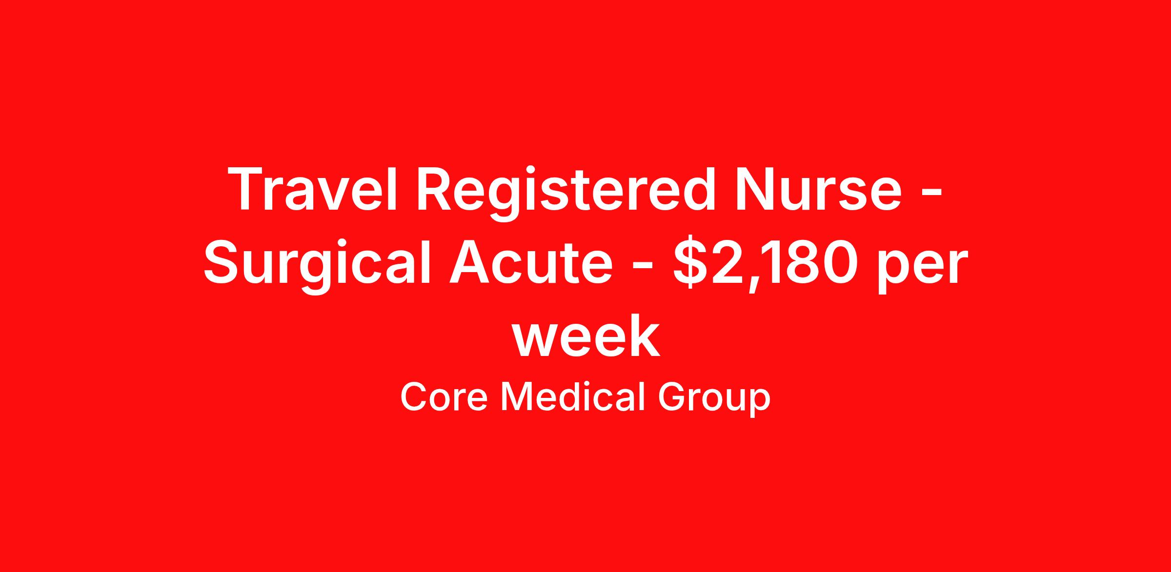 Core Medical Group is seeking a travel nurse RN Med Surg for a travel nursing job in Peoria, Illinois. Job Description & Requirements Specialty: Med Surg Discipline: RN Start Date: 03/30/2026 Duration: 13 weeks 36 hours per week Shift: 12 hours Employment Type: Travel Client in IL seeking Registered Nurse: Med/Surg for the following shift(s): Nights We are looking for a healthcare professional who is ready to provide exceptional patient care in this contract/travel role. Contract/travel assignments are typically 13 weeks, with potential to extend. Help us continue our mission to connect people, improve lives, and give back to the community by joining the CoreMedical Group team. When you work with CoreMedical Group, we put you first and treat you like family, supporting you every step of the way. CoreMedical Group is one of the largest healthcare staffing agencies in the country, with travel and contract positions located across the United States. Our recruiters will help you find the perfect job, whether it's across the country or across the street. In addition to dedicated, personalized support from your recruiter, when you work with CoreMedical Group you'll receive: Access to an extensive benefits package, including day 1 health, dental, and vision insurance, employer paid life insurance, a health reimbursement account, and more! Weekly paychecks with competitive pay packages Matching 401(k) benefits to help you save for retirement Licensure assistance and reimbursement to set you up for success on your contract Travel reimbursement and dedicated housing support while on assignment Referral cash bonuses when you connect us with other clinicians CoreMedical Group also offers you a free, all-inclusive vacation each year as our way of saying "thank you" for your hard work. Join other healthcare professionals on the annual Club CoreMed retreat and you'll see why our contract and travel professionals come back to us year after year! Your career is too valuable to tackle on your own. Let CoreMedical Group help you with your healthcare journey! *Estimate of weekly payments is intended for informational purposes and includes hourly wages, as well as reimbursements for meal & incidental expenses, and housing expenses incurred on behalf of the Company. Any benefits (medical/dental/vision) are in addition to the weekly pay. Please speak with your Recruiter for additional details. Estimated payments are subject to change until formal offer of assignment is made and accepted. Core Medical Group Job ID 1366032. Pay package is based on 12 hour shifts and 36 hours per week (subject to confirmation) with tax-free stipend amount to be determined. Posted job title: RN About Core Medical Group CoreMedical Group is one of the largest healthcare staffing agencies in the country. We have jobs nationwide in travel nursing, travel allied health, interim, locum tenens, and permanent placements! Join the staffing agency with Club CoreMed, the best perk in the industry - an all inclusive paid trip to a tropical resort! Benefits Weekly pay Holiday Pay Guaranteed Hours Continuing Education 401k retirement plan Pet insurance Company provided housing options Sick pay Wellness and fitness programs Mileage reimbursement Referral bonus Employee assistance programs Medical benefits Dental benefits Vision benefits Benefits start day 1 License and certification reimbursement Life insurance Discount program