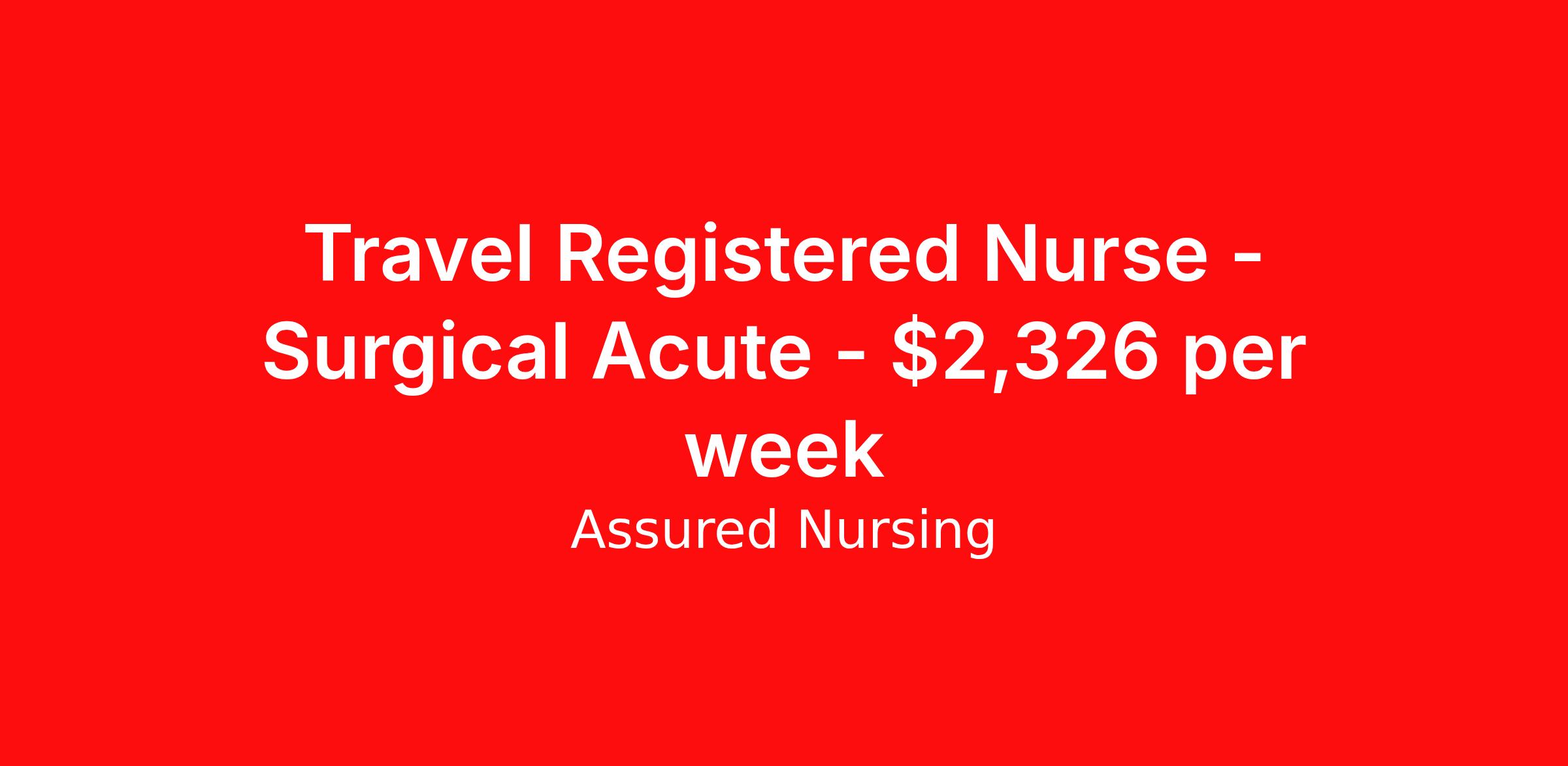 Assured Nursing is seeking a travel nurse RN Med Surg for a travel nursing job in Peoria, Illinois. Job Description & Requirements Specialty: Med Surg Discipline: RN Start Date: 03/30/2026 Duration: 13 weeks 36 hours per week Shift: 12 hours, nights Employment Type: Travel Assured Nursing is currently seeking a RN for a contract position in Peoria Illinois . This is a 7p-7:30a, 19:00:00-07:30:00, 12.00-3 position in the SFMC - Surgical Acute type:Med Surg (Medical Surgical) . The ideal candidate will possess a current state license as a RN and have at least 2 years of recent experience as a Med Surg RN . Assured Nursing Job ID 36161035. Pay package is based on 12 hour shifts and 36.0 hours per week (subject to confirmation) with tax-free stipend amount to be determined. Posted job title: RN:Med Surg,19:00:00-07:30:00 Benefits Weekly pay Holiday Pay 401k retirement plan Referral bonus Medical benefits Dental benefits Vision benefits