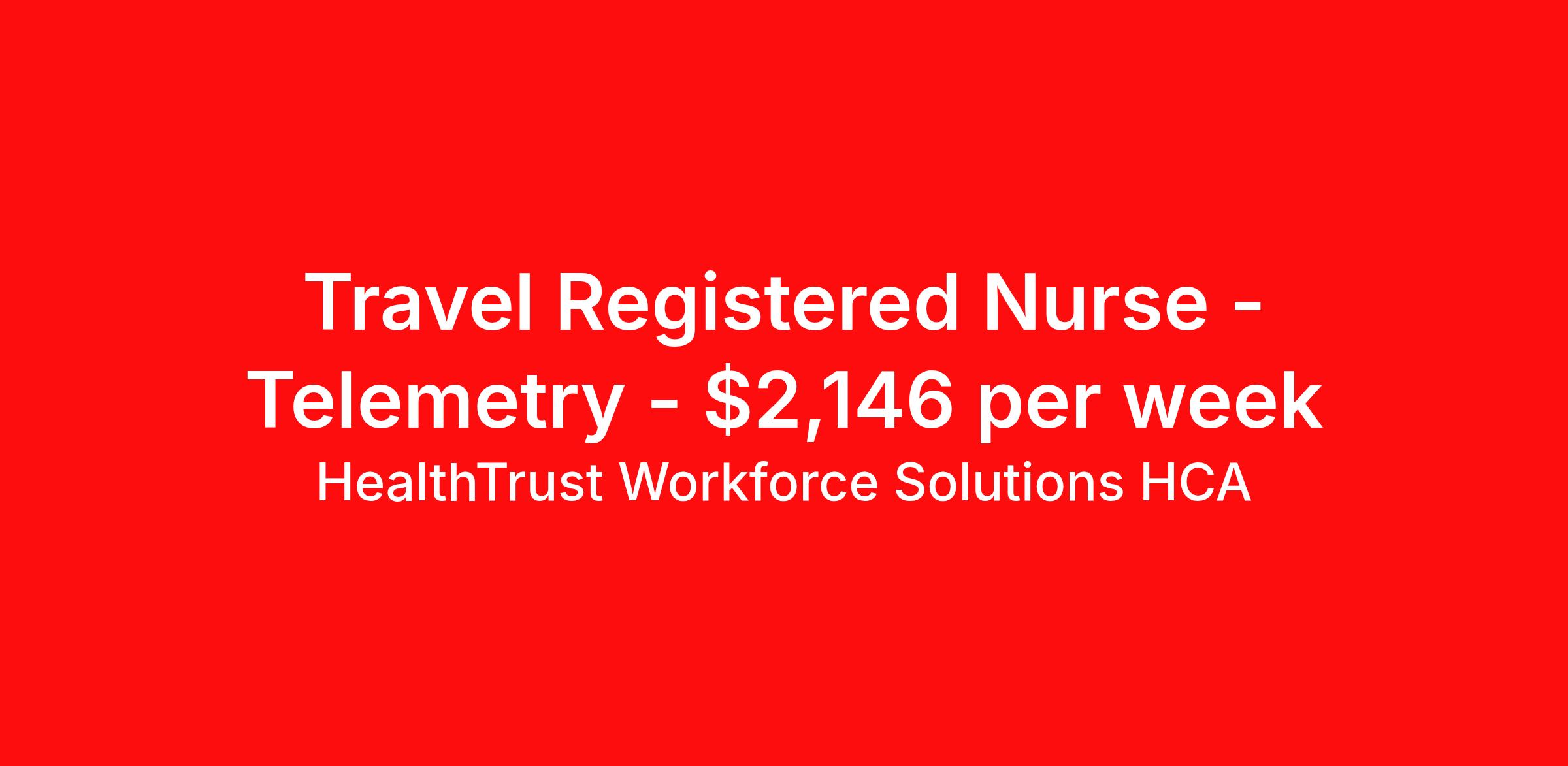 HealthTrust Workforce Solutions HCA is seeking a travel nurse RN Med Surg / Telemetry for a travel nursing job in Fort Smith, Arkansas. Job Description & Requirements Specialty: Med Surg / Telemetry Discipline: RN Start Date: 04/13/2026 Duration: 13 weeks 36 hours per week Shift: 12 hours, nights Employment Type: Travel About HealthTrust Workforce Solutions HCA At HealthTrust Workforce Solutions, healthcare is not just about the four walls of a facility but about the people who provide and receive care. Our focus is on empowering healthcare professionals to deliver exceptional patient experiences by providing them with the necessary skills, tools, and support. We partner with healthcare facilities nationwide to ensure that the right professionals are in the right roles. We prioritize our clinicians by giving them a voice and access to opportunities to fulfill their mission of improving lives by providing quality patient care. We are committed to our core values of Trust, Innovation, Adaptability, Courage, and Accountability. We are dedicated to positively impacting the healthcare industry by providing first-priority access to more than 200,000 jobs nationwide to our healthcare professionals. Join us and be part of the HealthTrust family, where you can make a difference every day. We embrace our changing environment, and we maintain a culture that has a rich tradition of transforming itself to meet the challenges of the future. MISSION STATEMENT While putting great people in the right roles is essential, our mission is far greater. We want our clinicians to be part of the HealthTrust family, where healthcare professionals have a voice and are empowered with the right tools and opportunities to fulfill their personal mission of improving lives. Plus, as a preferred partner to thousands of top-performing hospitals, we provide our healthcare professionals with first-priority access to more than 200,000 jobs nationwide. Benefits Dental benefits Vision benefits Referral bonus Continuing Education Life insurance