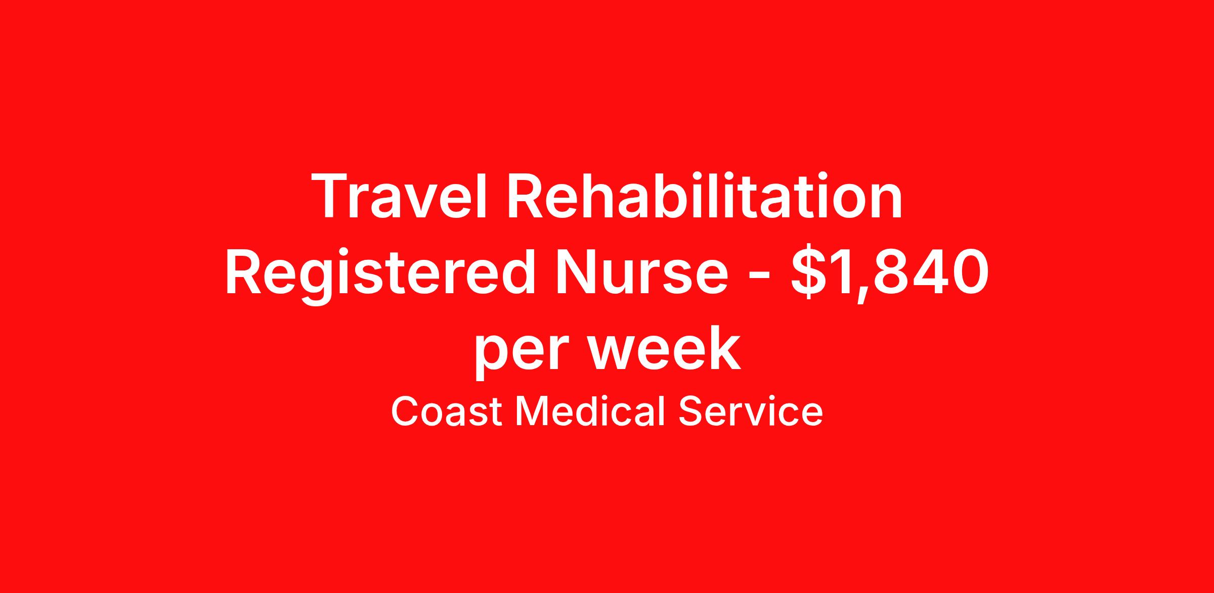 Coast Medical Service is seeking a travel nurse RN Rehabilitation for a travel nursing job in Natchez, Mississippi. Job Description & Requirements Specialty: Rehabilitation Discipline: RN Start Date: ASAP Duration: 13 weeks 36 hours per week Shift: 12 hours, nights Employment Type: Travel Coast Medical Service is a nationwide travel nursing & allied healthcare staffing agency dedicated to providing an elite traveler experience for the experienced or first-time traveler. Coast is featured on Blue Pipes' 2023 Best Travel Agencies and named a 2022 Top Rated Healthcare Staffing Firm & 2023 First Half Top Rated Healthcare Staffing Firm by Great Recruiters. Please note that pay rate may differ for locally based candidates. Please apply here or contact a recruiter directly to learn more about this position & the facility, and/or explore others that may be of interest to you. We look forward to speaking with you! Coast Medical Services Job ID 35906529. Pay package is based on 12 hour shifts and 36.0 hours per week (subject to confirmation) with tax-free stipend amount to be determined. Posted job title: RN:Rehabilitation,19:00:00-07:30:00